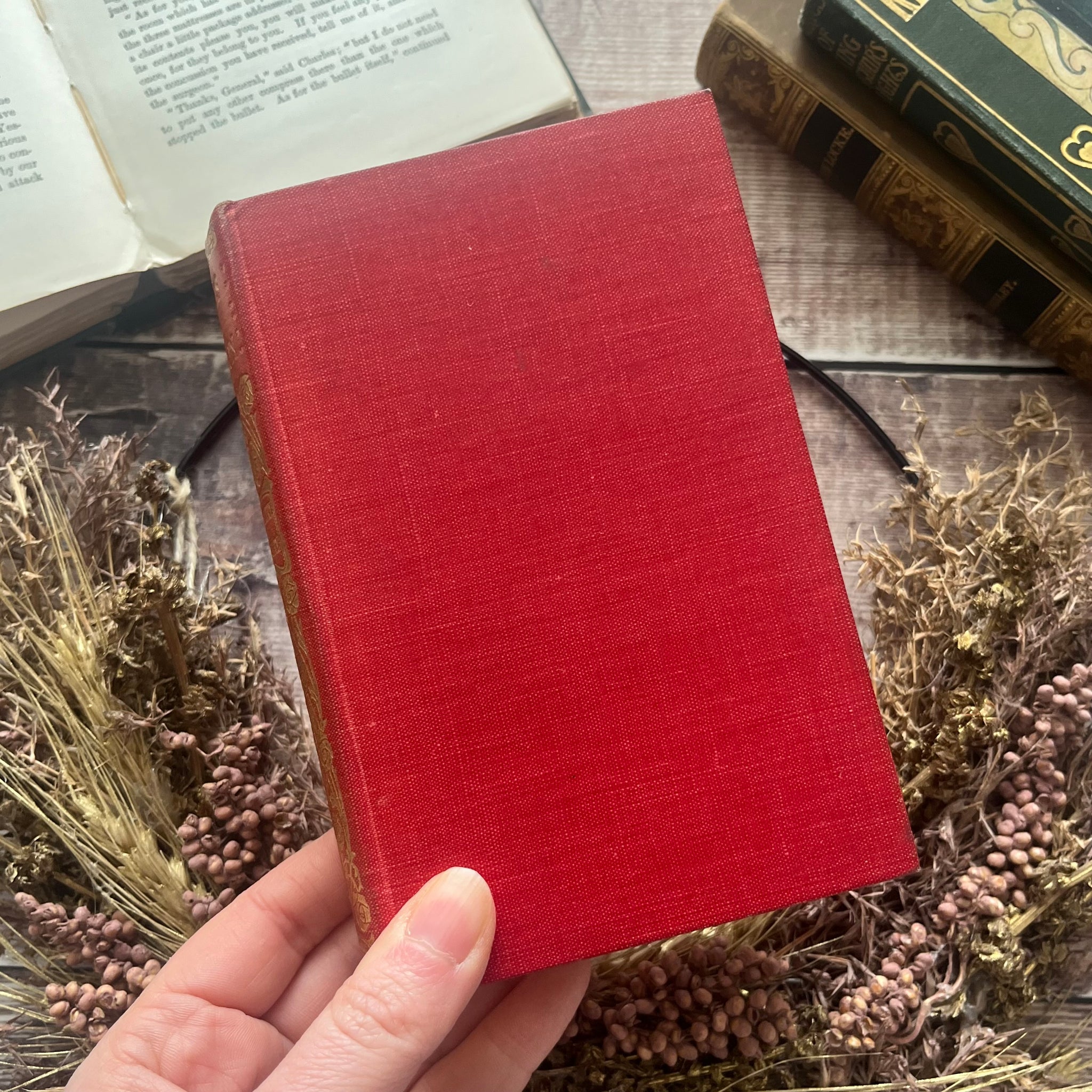 The book is bound in red cloth with blind stamped gilt decoration to the spine in a floral art nouveau pattern. It's an attractive little book and in near fine condition for it's age. There is light sunning to the spine and crushing to the spine ends. The text block edges are lightly foxed and marked, and the book shows a slight forward lean.