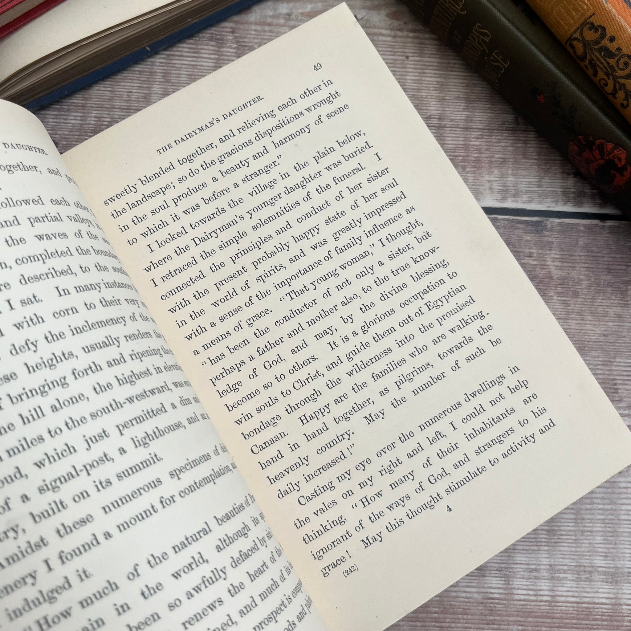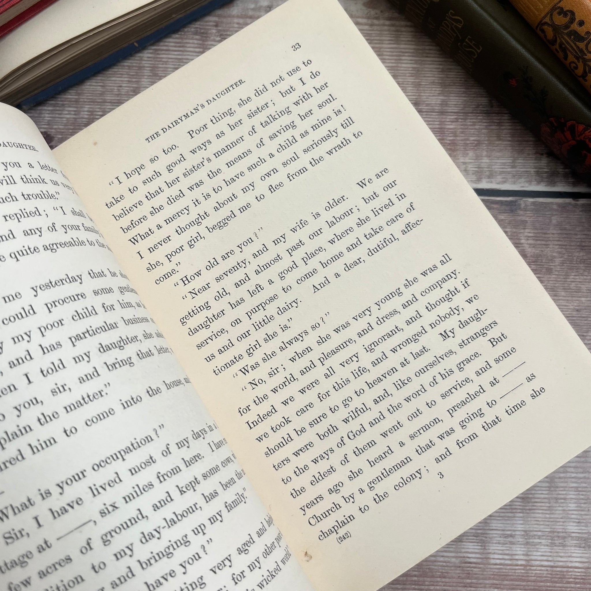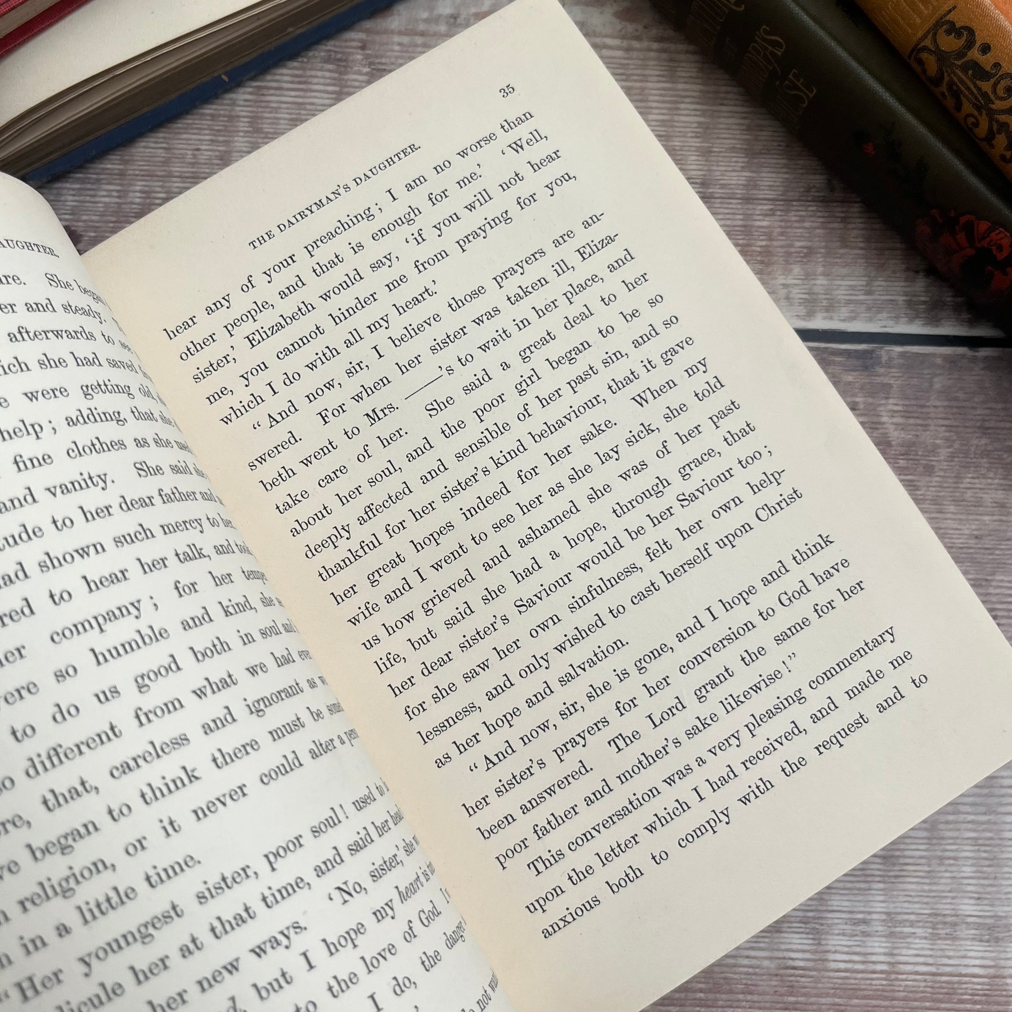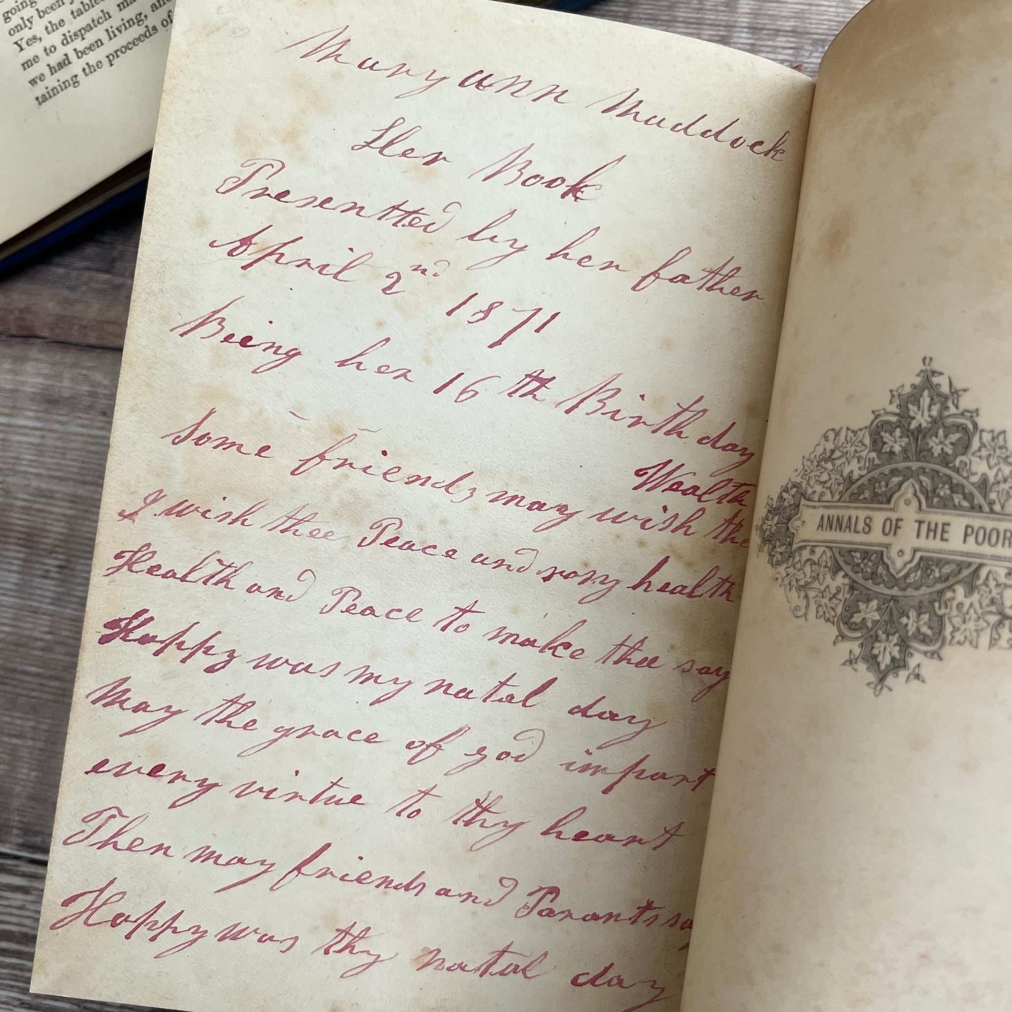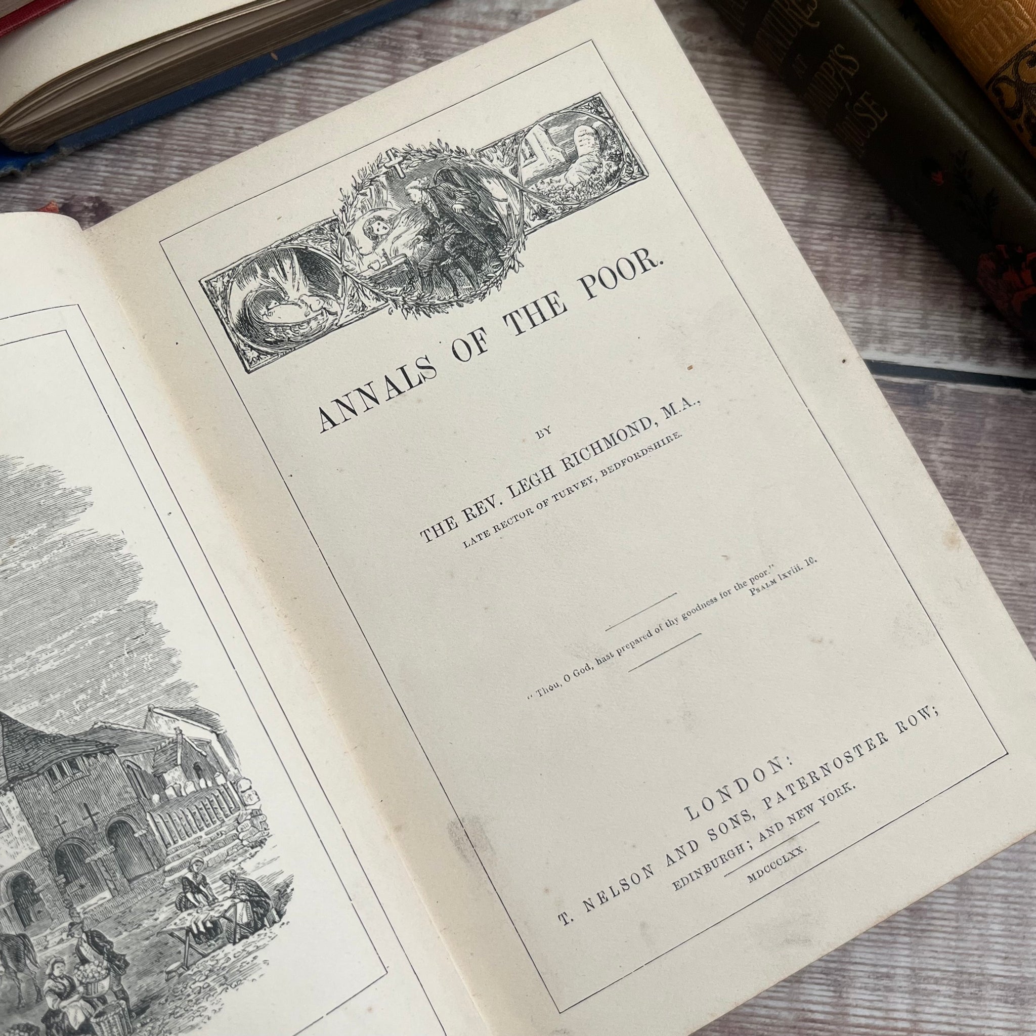 This lovely edition of Annals of the Poor by Rev Legh Richmond was published by T Nelson and Sons in 1870. So the book is from the mid Victorian era. It is bound in red orange cloth over bevelled boards, with beautiful blind stamped decoration in black and gilt to the front board and spine. The front board features a beautiful inset illustration. All edges gilt.