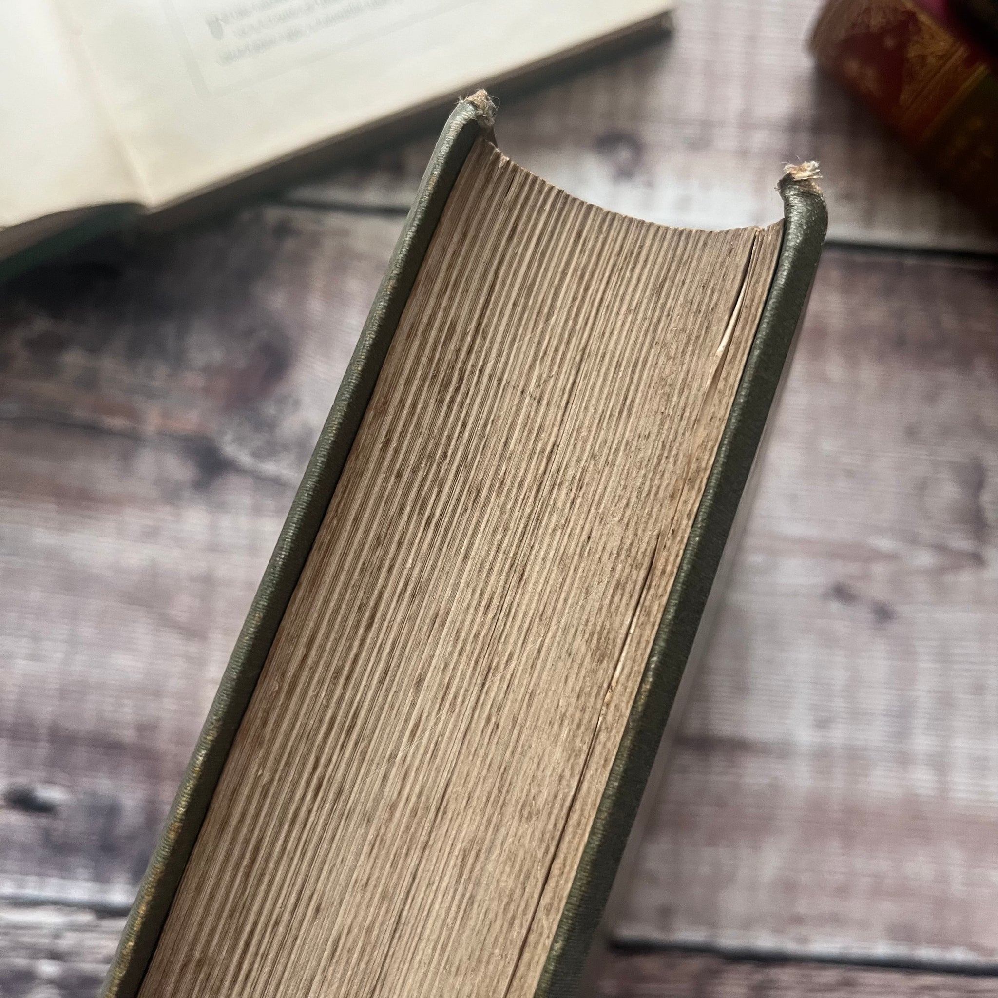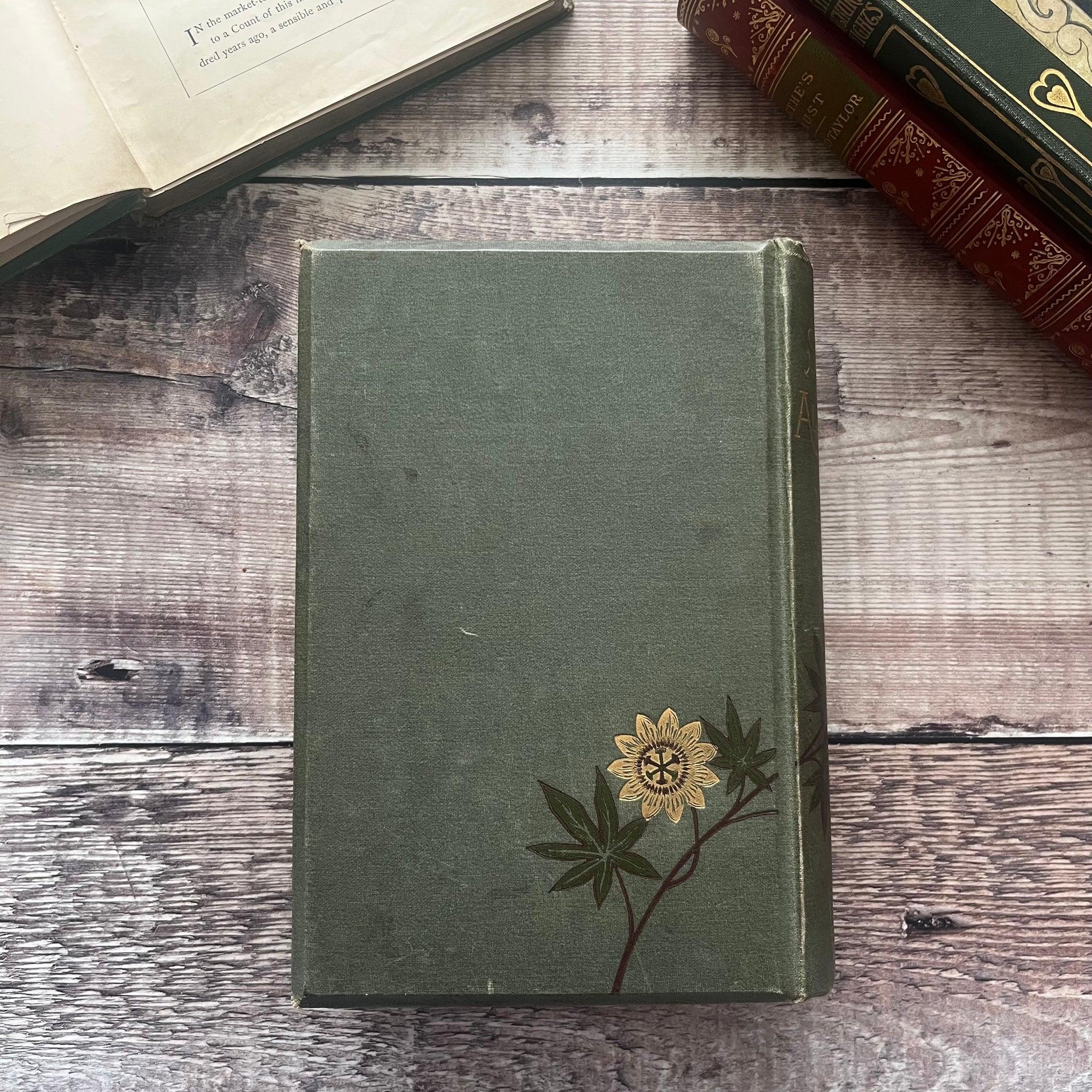 The book is bound in grey green cloth over bevelled boards, with stunning pictorial and gilt decoration of flowers on a branch to the boards and spine. It's in very good condition for it's age but there is some wear to the corners with minor fraying to the cloth. The text block edges show foxing and the boards are lightly soiled and marked. The spine is faintly sunned and marked, with crushing to the spine ends.