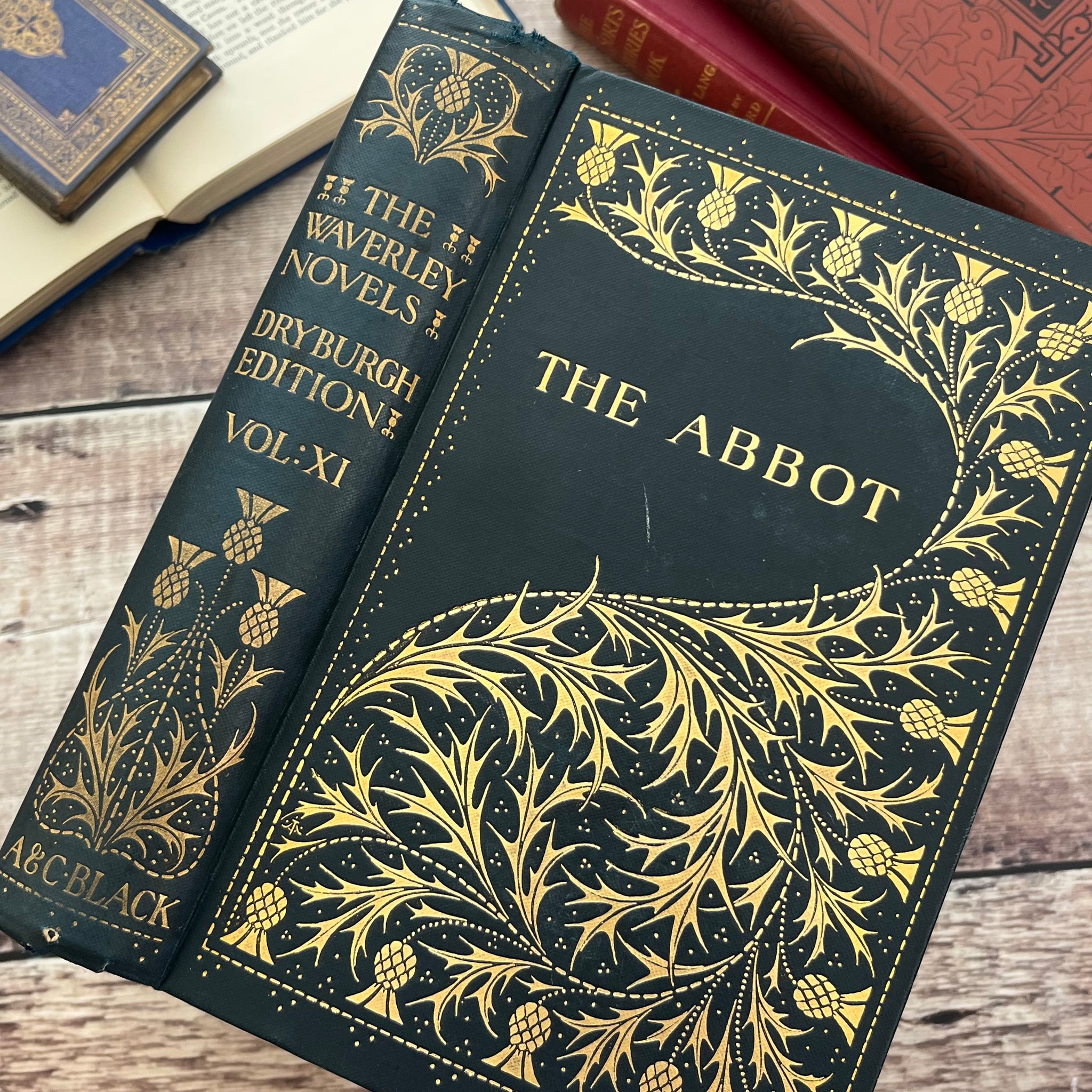 This stunning antique edition of The Bride of Lammermoor by Sir Walter Scott was published by Adam and Charles Black in 1893. So the book is from the end of the Victorian era. The book is bound in navy cloth with beautiful gilt decoration of thistles to the front board and spine. Top edge is gilt. The art nouveau gilt thistle design was designed by famous American book designer AA Turbayne, and features his signature (the initials rather than the scarab beetle) on the front board.