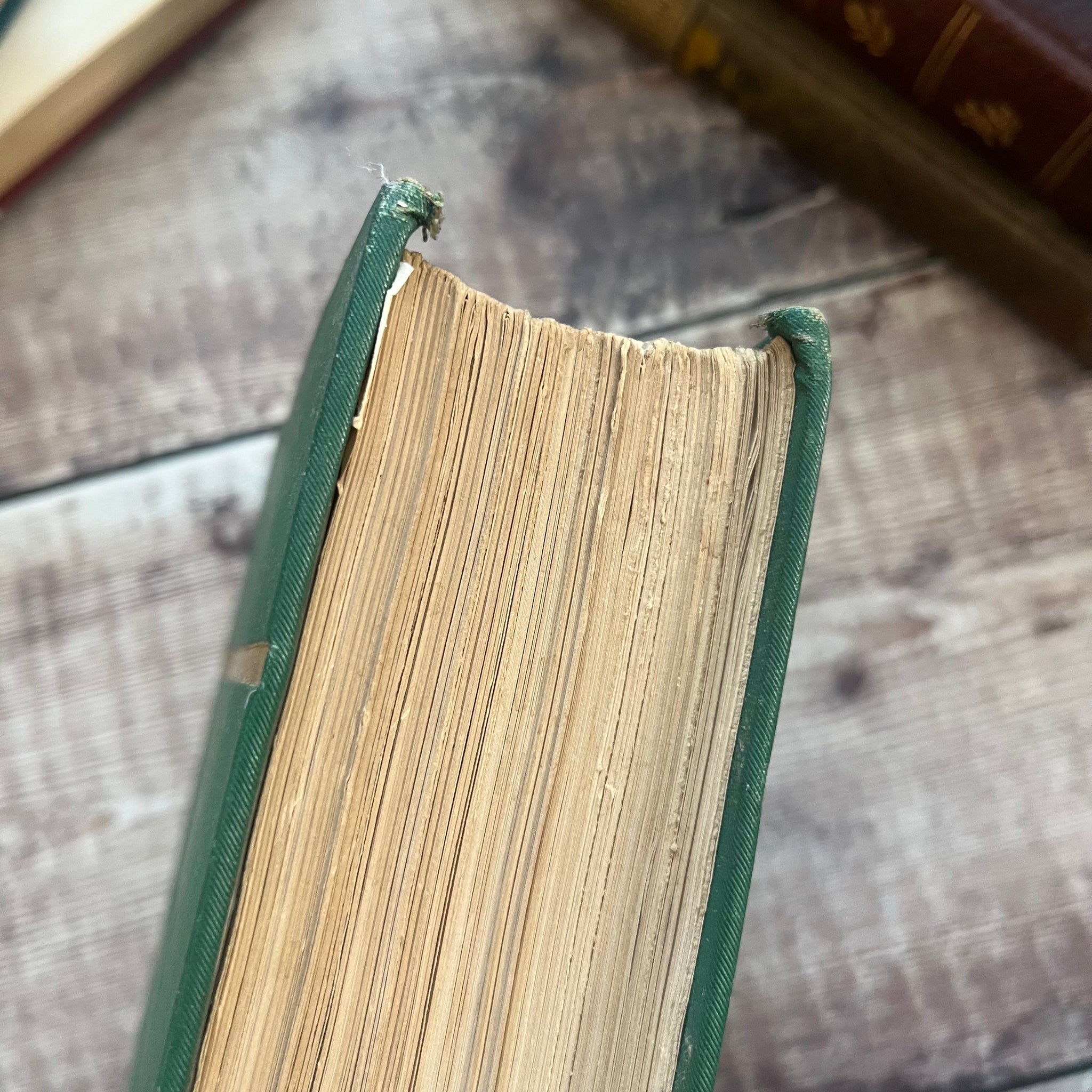 Inside, there is a written inscription on the half title page and the pages are clean and bright, with just some age toning and sporadic foxing. There are occasional cracks to the gutter in places through the book, but the pages remain tightly bound. There is a tear to the edge of the Contents page and creasing to the top corner of the title page which wasn't trimmed correctly and sticks out from the edge of the text block.