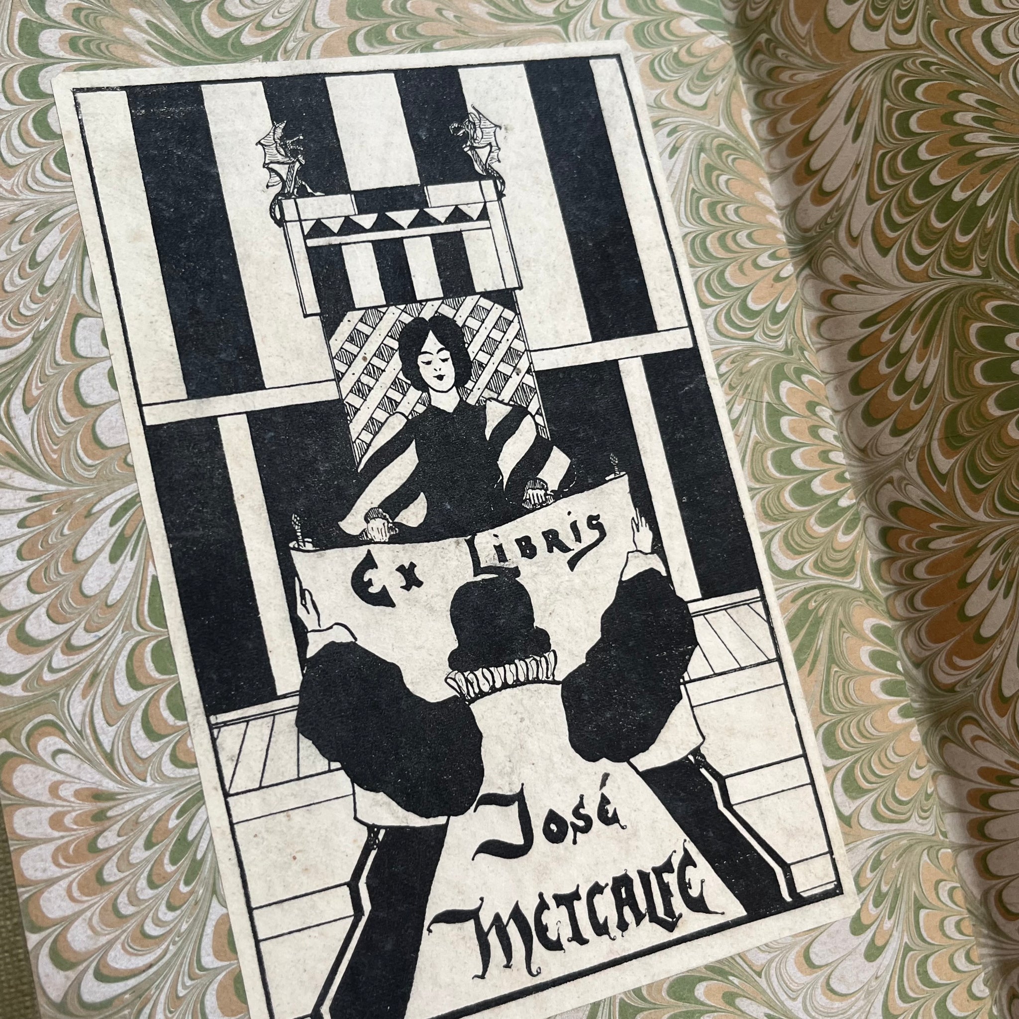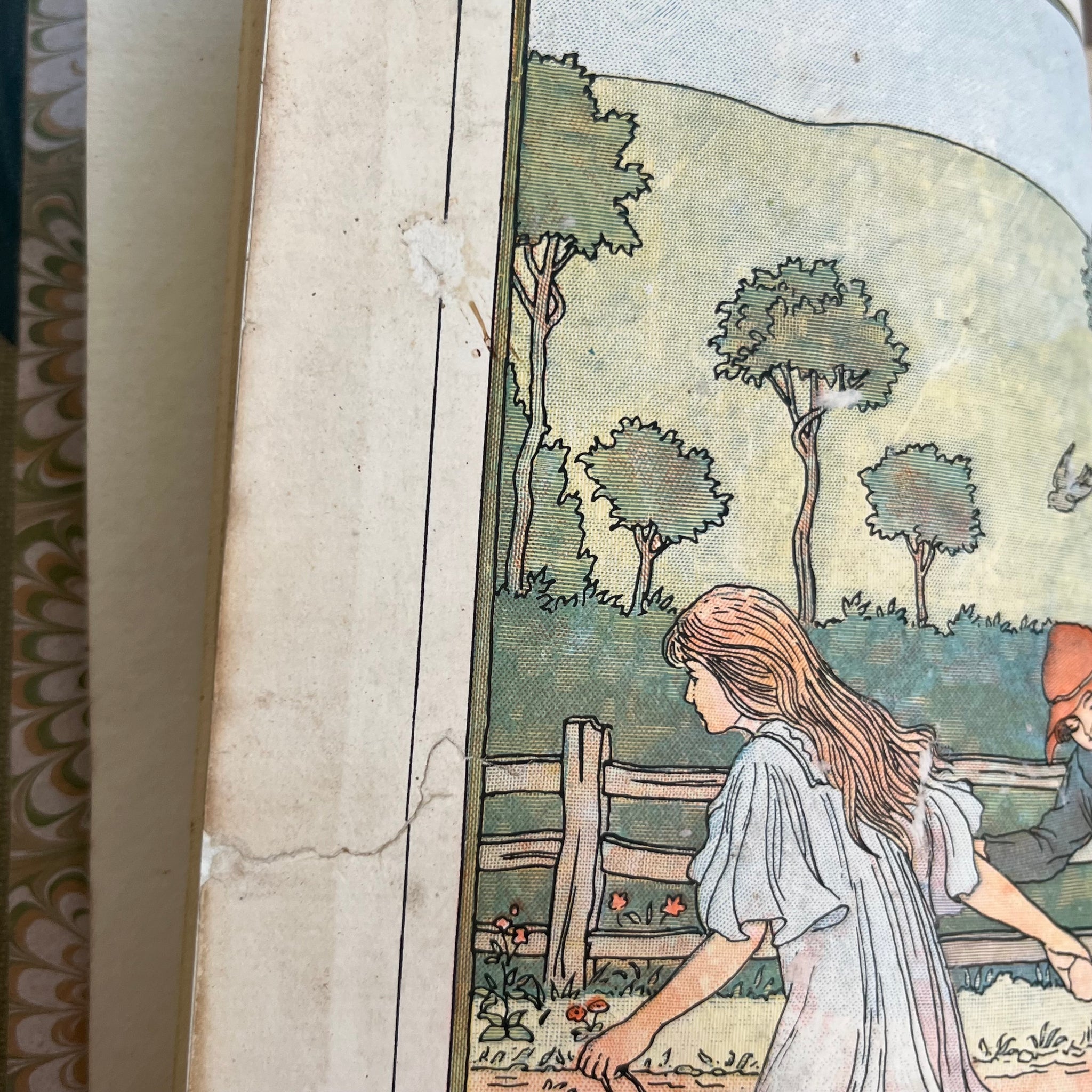 Inside, there is a name plate glued to the front pastedown; the endpapers are beautifully marbled. The endpapers show light age toning and sporadic foxing, with occasional creasing. The front colour illustration before the title page has been repaired neatly with tape. There is a written name and date on the title page.