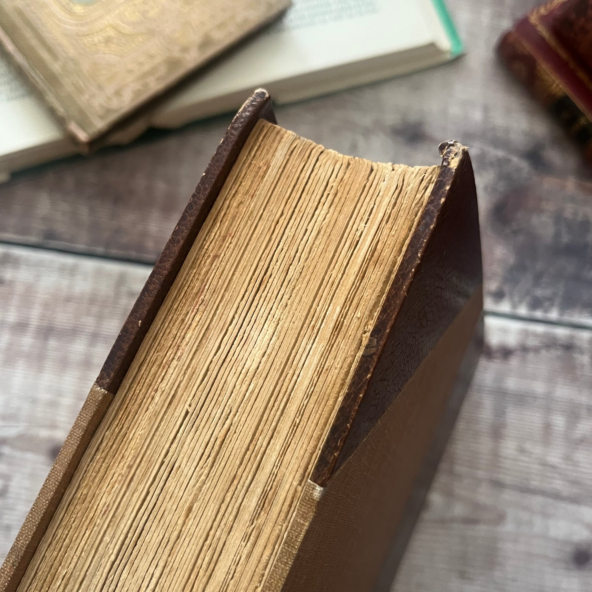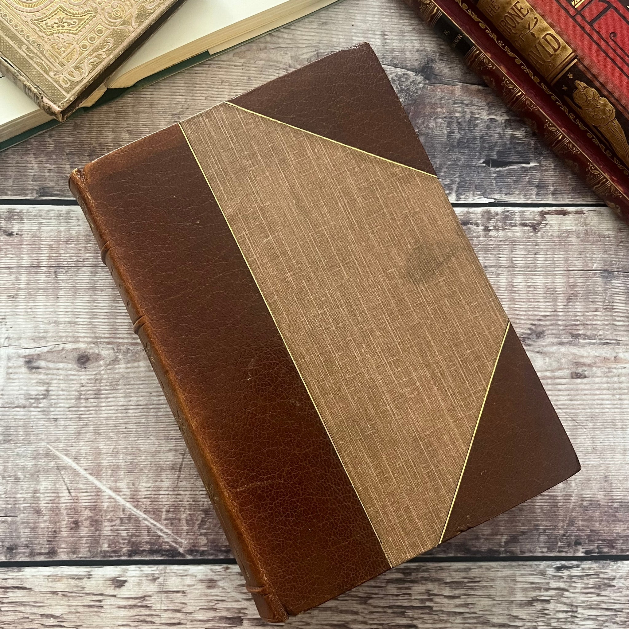 This beautiful antique edition of The Poetical Works of John Milton was published by Oxford Clarendon Press in 1900. So the book is from the very end of the Victorian era. The book is bound in half Morocco, with brown cloth boards and three raised bands to the spine. The spine also features delicate floral gilt work in an art nouveau style. Top edge gilt.