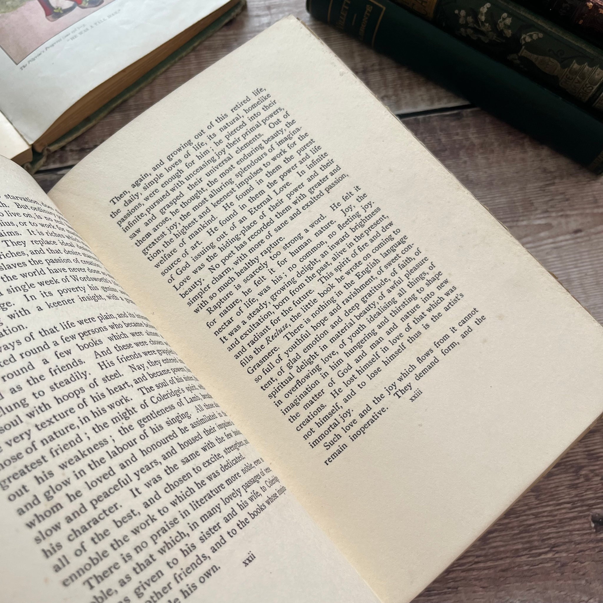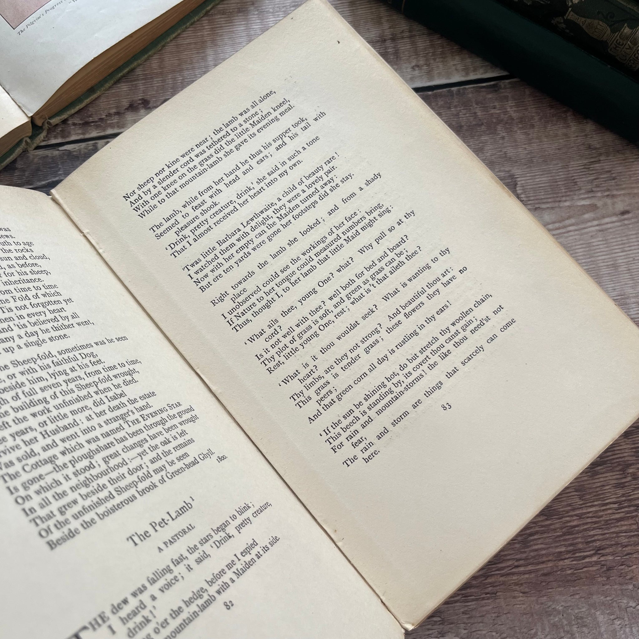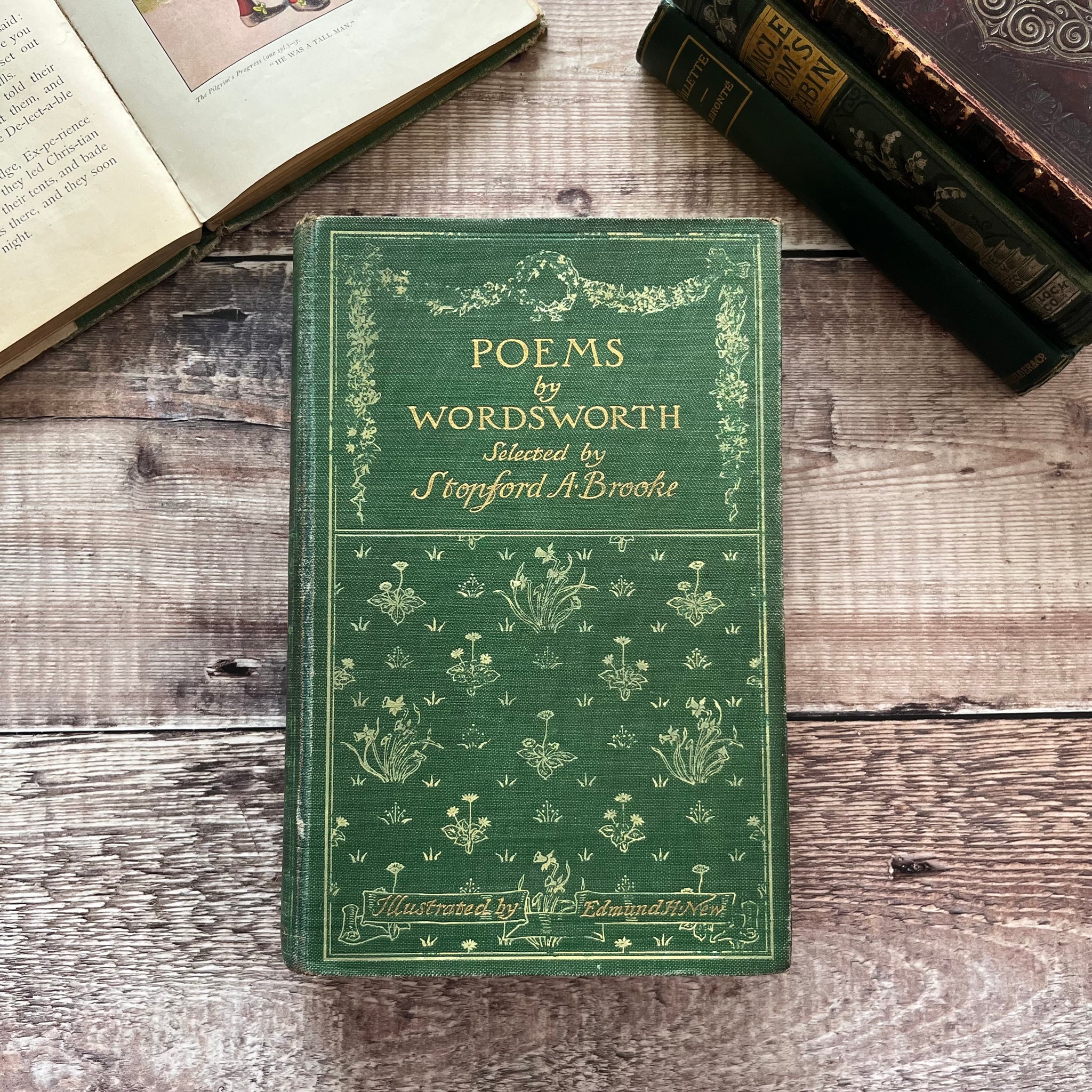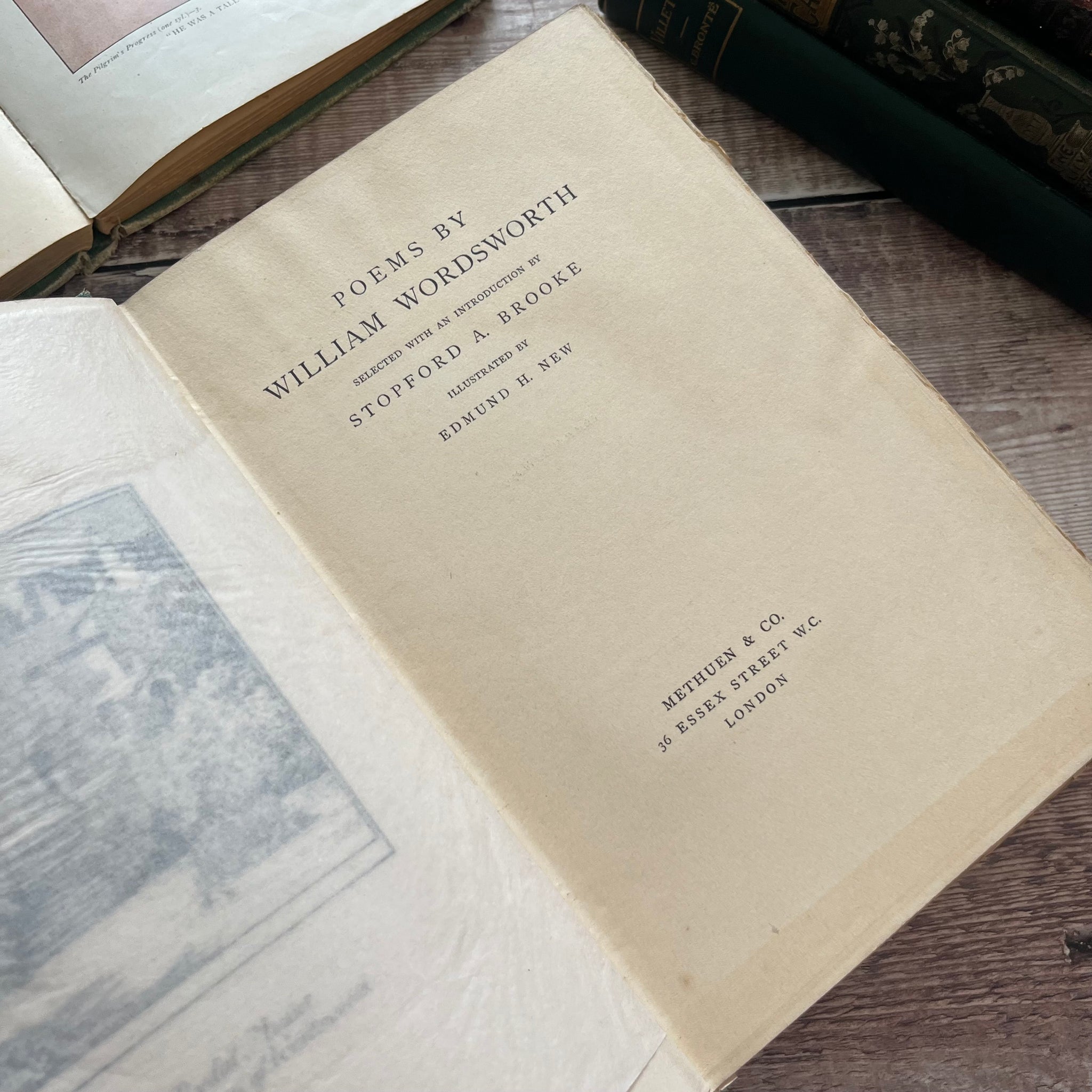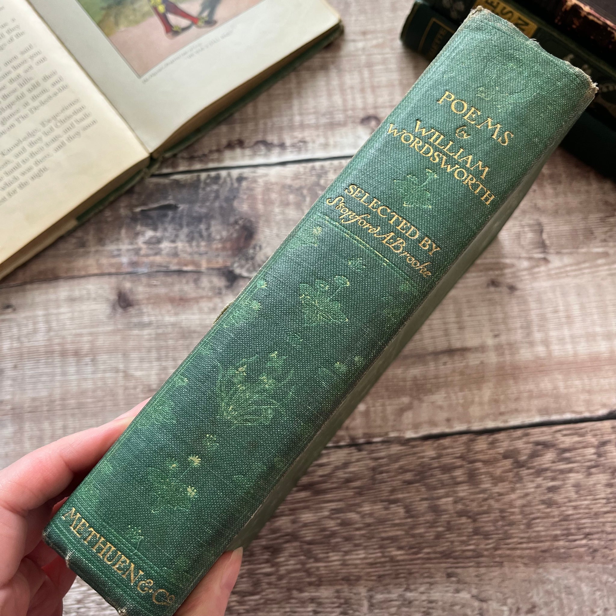 This antique edition of Poems by Wordsworth was published by Methuen and Co in 1907. So the book is from the Edwardian era. It is bound in green cloth with pretty floral decoration to the front board and spine.