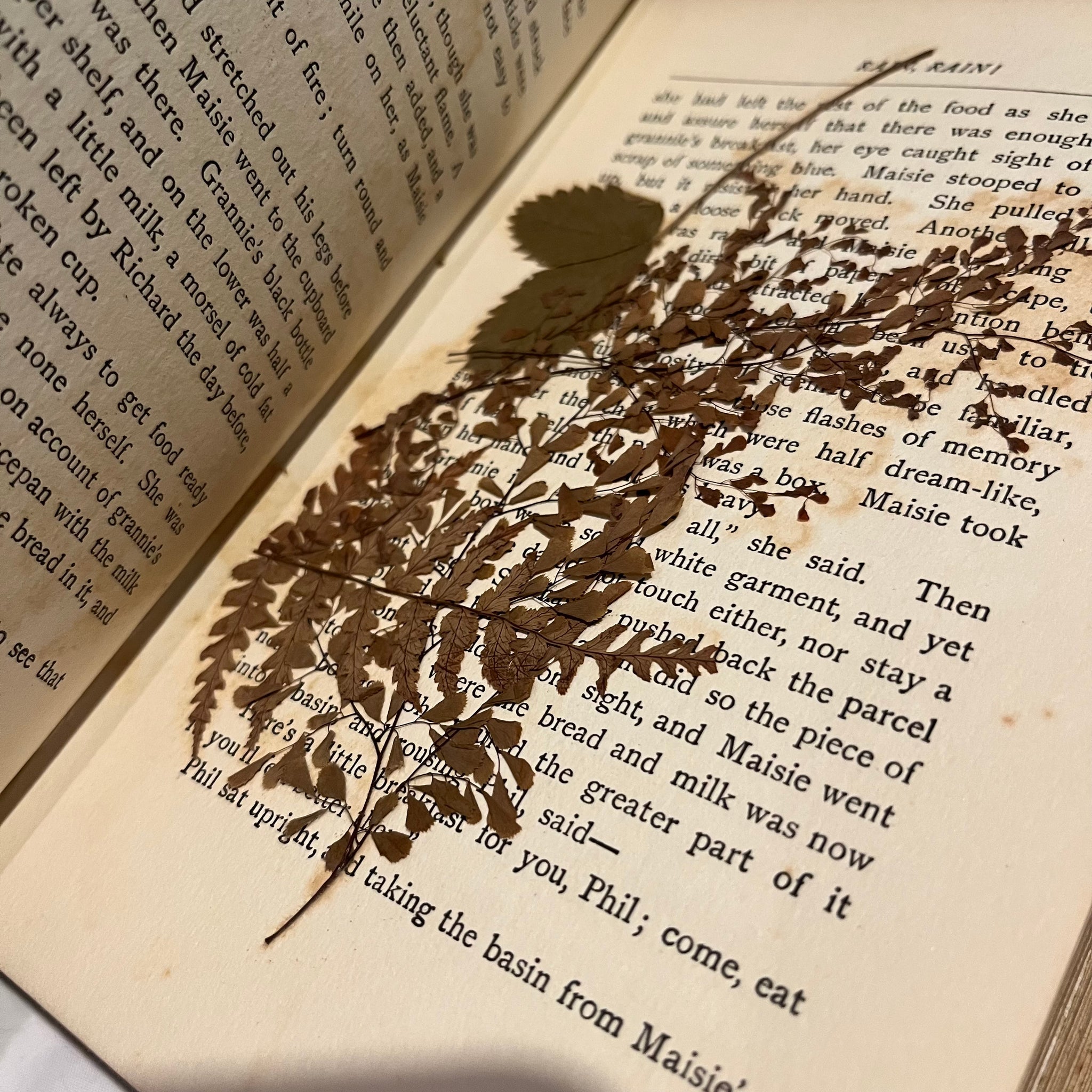 Inside, the pages show age toning throughout with sporadic foxing and age staining. There is a written inscription on the verso of the frontispiece and there are some pressed plants tucked within the pages.