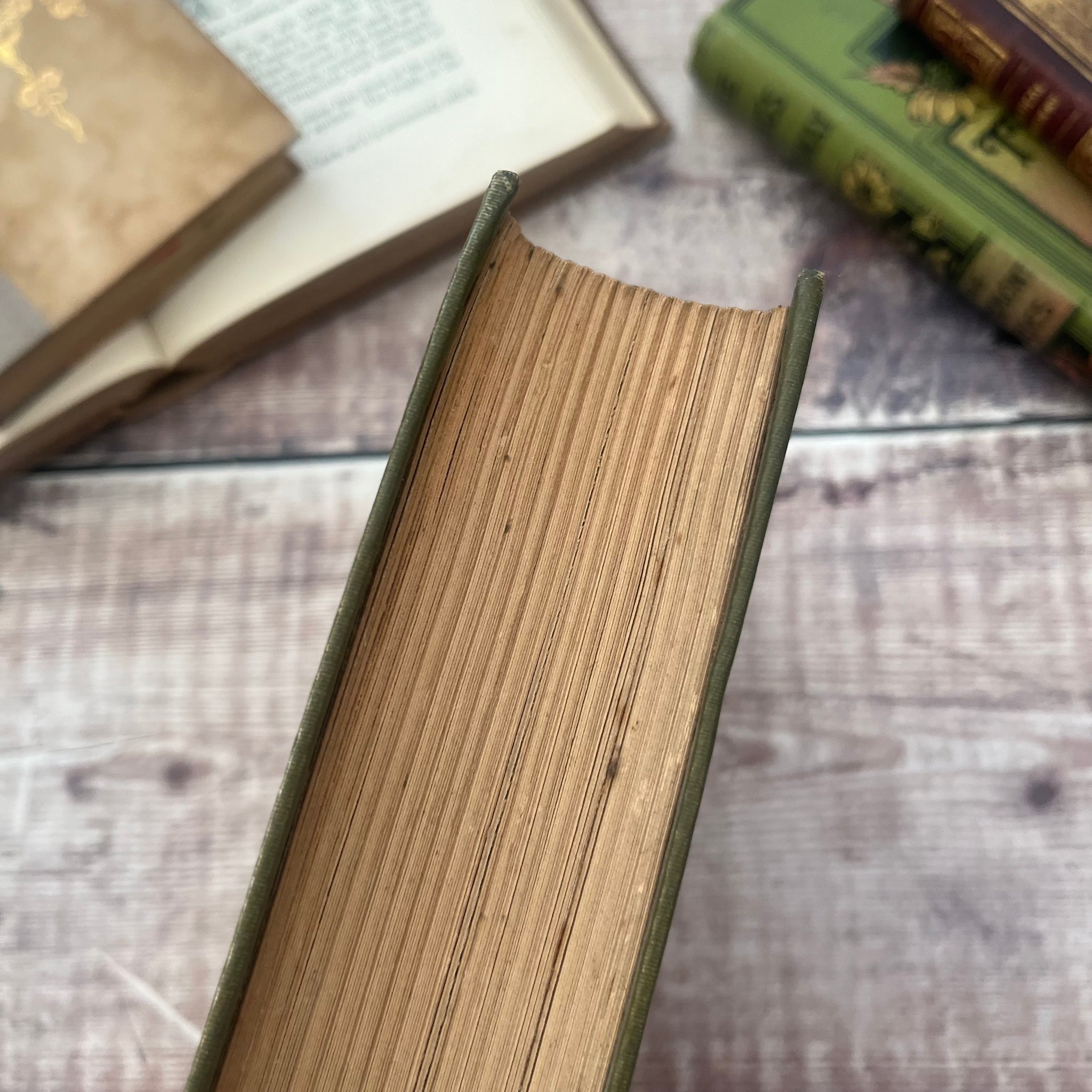 The book is bound in green cloth with pictorial decoration to the front board and spine - it features knights helmets and weapons which makes it very attractive. It's in very good condition but does show a pronounced forward lean. There are some minor marks to the boards and some small air bubbles under the cloth. The spine is sunned with crushing to the spine ends.
