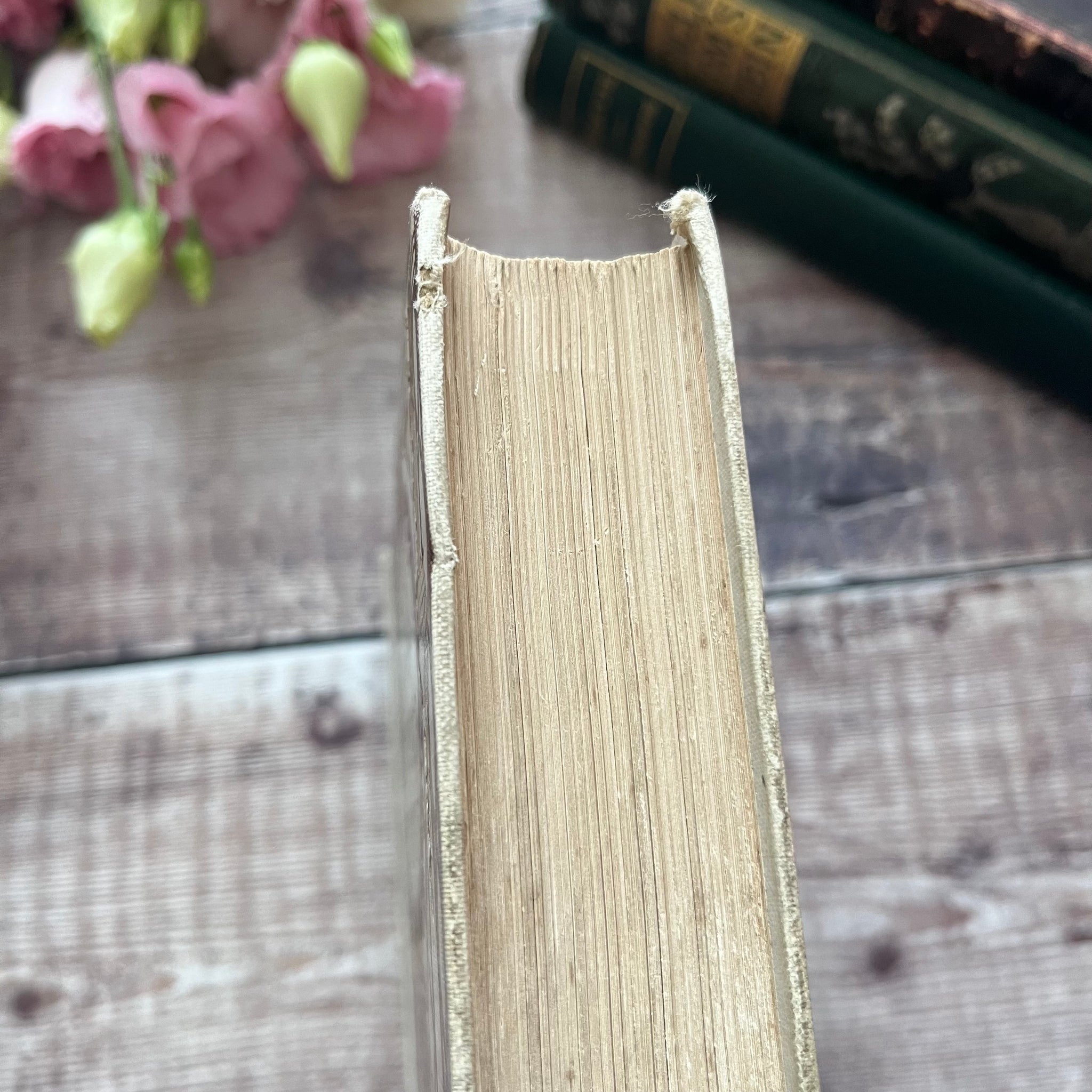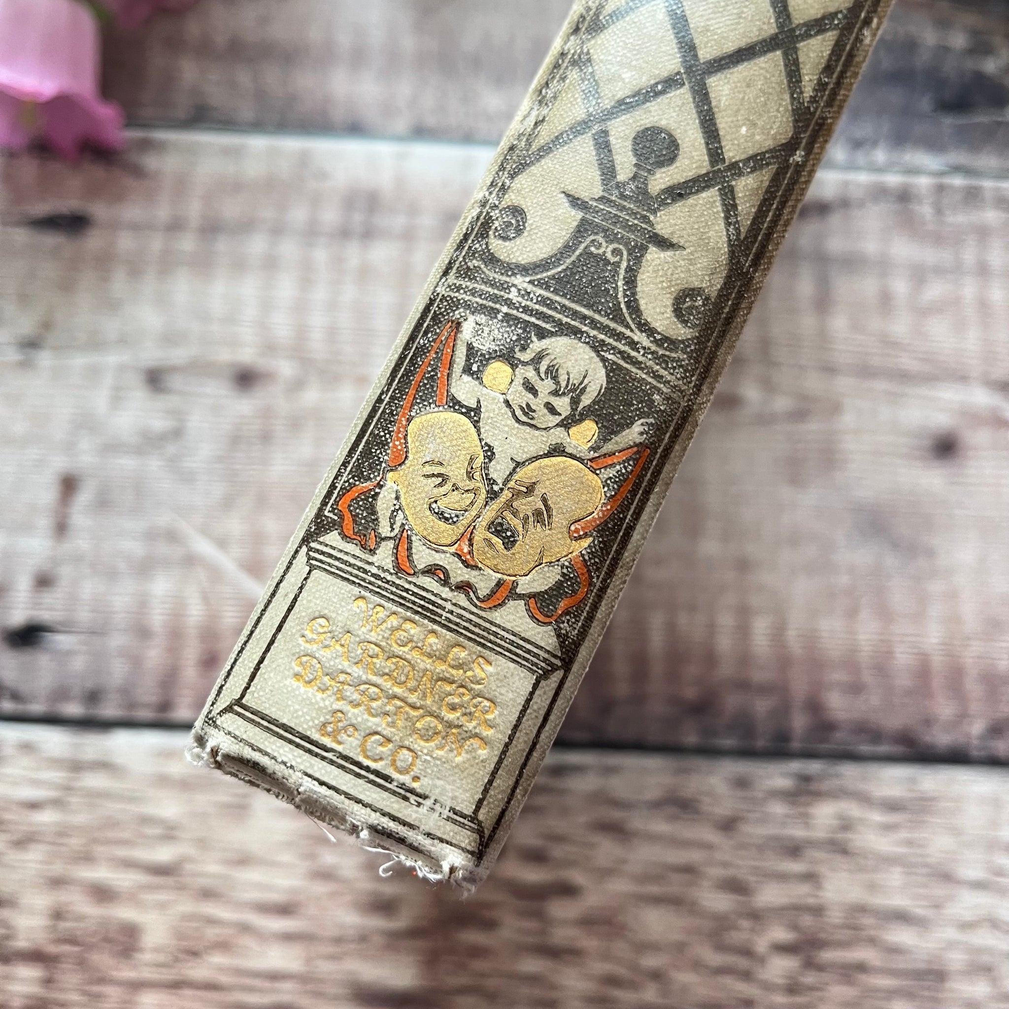 It's bound in pale beige cloth with stunning pictorial decoration and gold gilt to the front board and spine. It's in good condition, but there is significant soiling and darkening to the cloth. There is some minor marking and rubbing to the boards and the corners show light wear. There are some very small chips and holes in the cloth along the board edges. The spine is sunned and dulled, with rubbing to the decoration. Crushing to the spine ends has caused splitting in the cloth.