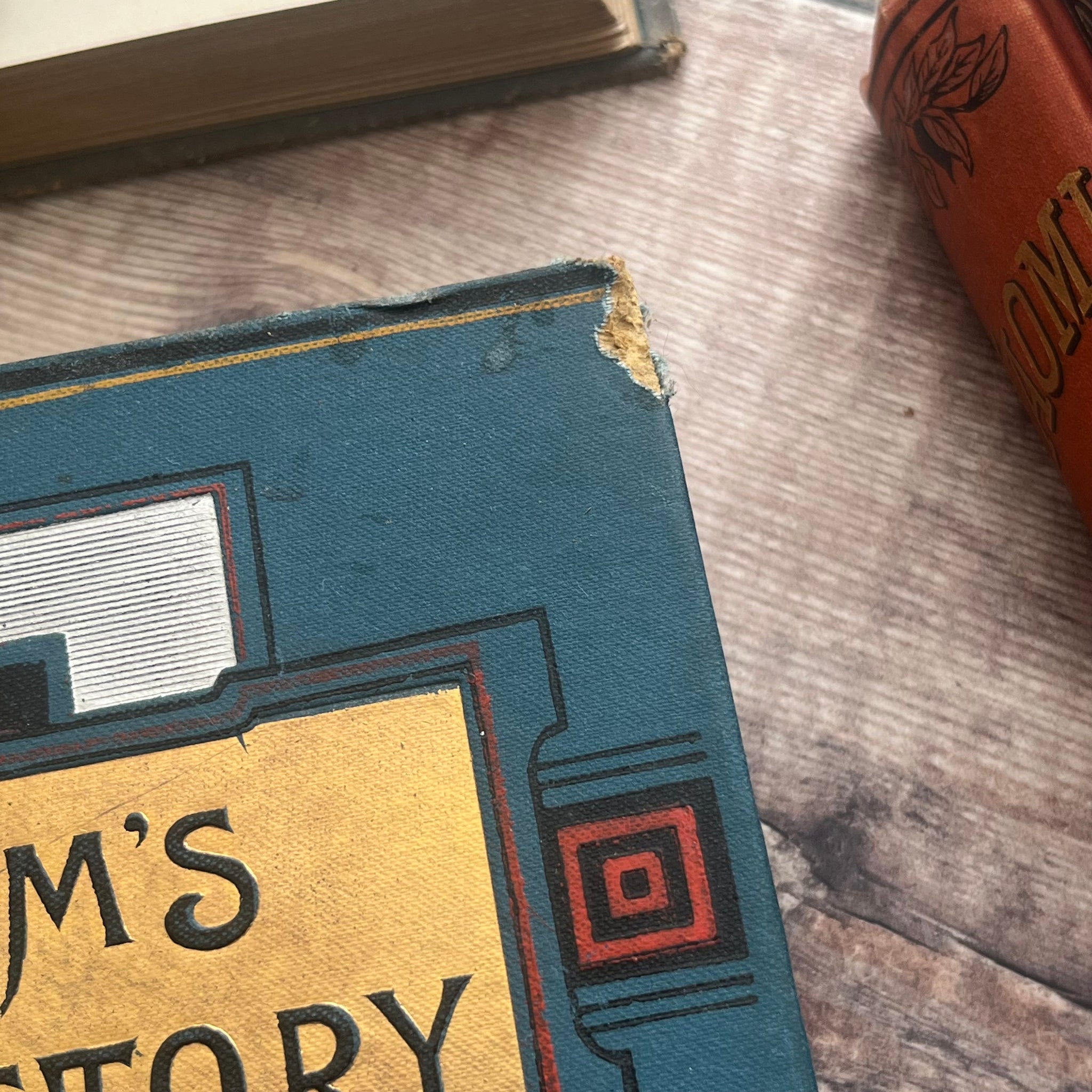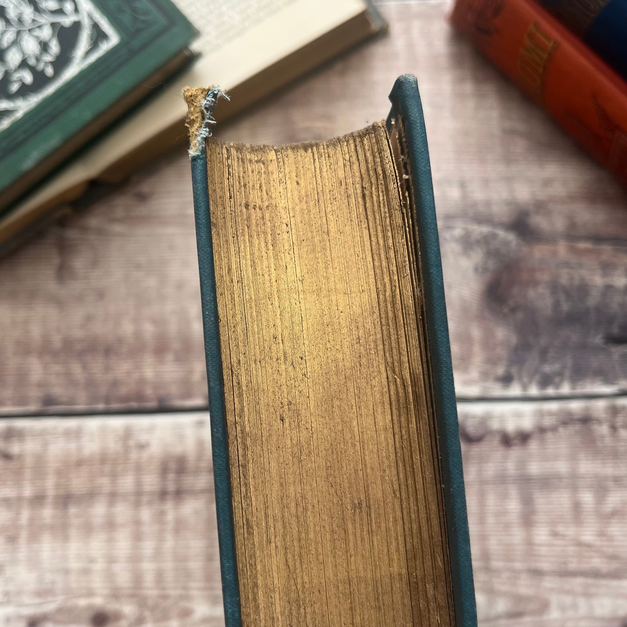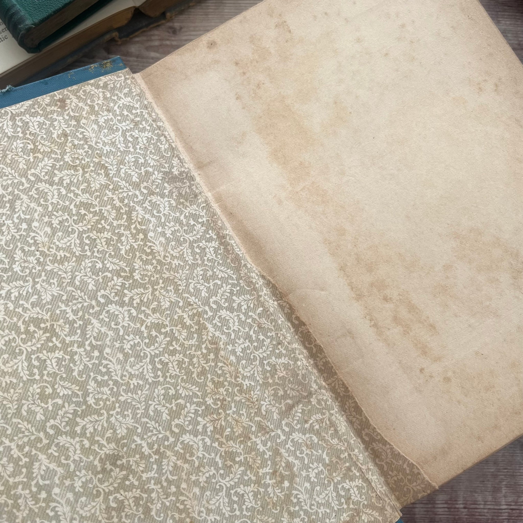 The book is bound in teal blue cloth  with beautiful floral decoration and gilt to the front board and spine. It’s in good condition, with the two most important condition points being the small areas of loss to the cloth (the top corner of the front board looks chewed, with some loss and fraying to the cloth, and there is another hole in the cloth along the top edge of the front board). Other than this though, the cloth is clean and bright, with only minor marks to the boards. There is a scrape to the spine and the bottom corner is dented.