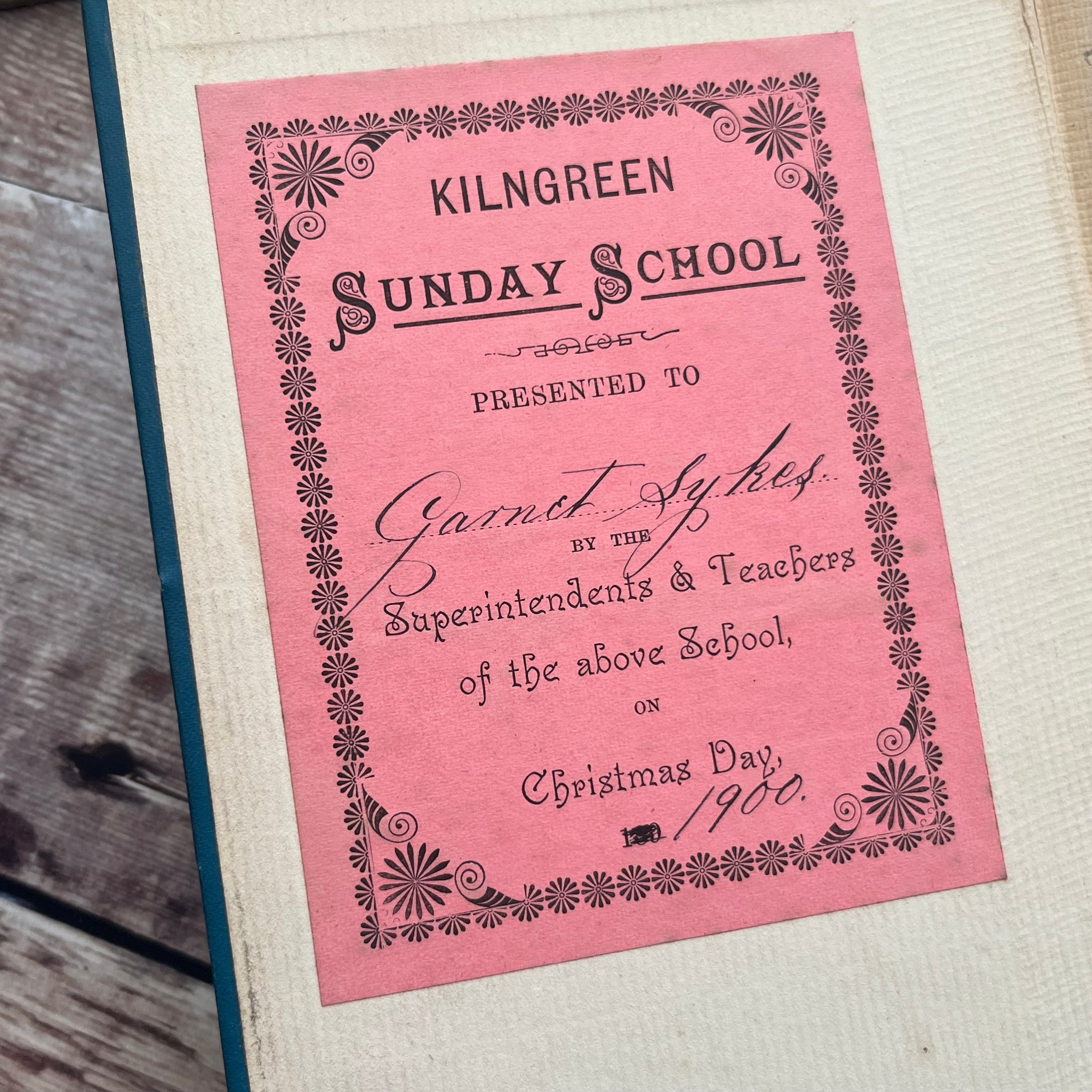 The book is beautifully bound in blue cloth with pictorial decoration to the front board and spine. It's in very good condition with just some light wear to the corners and the boards show minor marking - there is also a faint stain to the back board. There is some chipping to the decoration and a small dent to the edge of the front board.