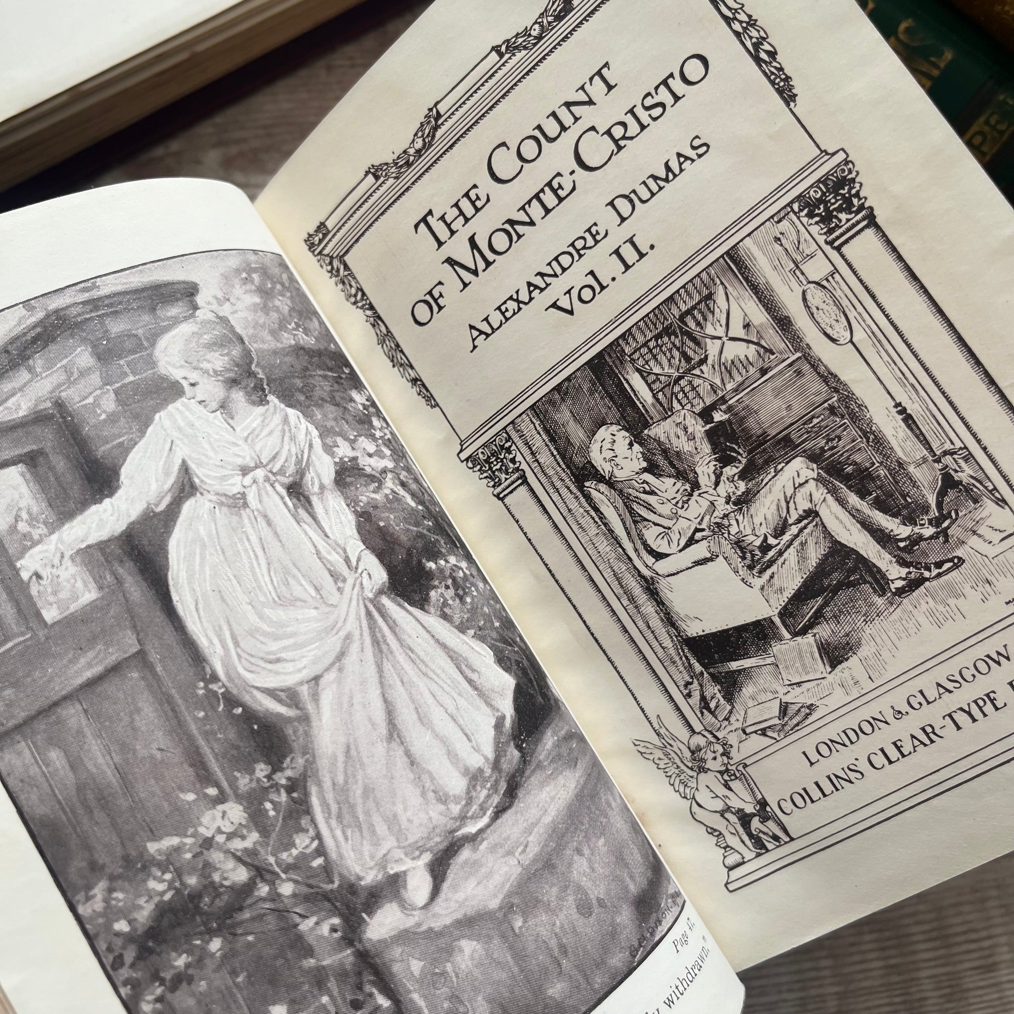 This beautiful antique two volume edition of The Count of Monte Cristo by Alexandre Dumas was published by London & Glasgow, Collins Clear Type Press. The books themselves are undated but these editions were largely brought out in the 1910's to 1930's. So the books are approximately 100 years old.