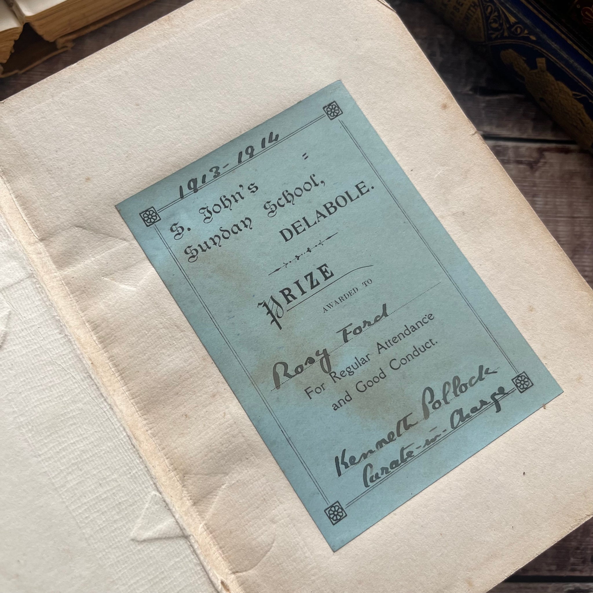 Inside, there is a presentation glued to the front free endpaper and an old rubbed out price to the top of the front pastedown. The pages show age toning and scattered foxing throughout, with occasional marking. There are cracks to the gutter in places but the pages remain securely bound. Please note that the book has a slight musty odour.