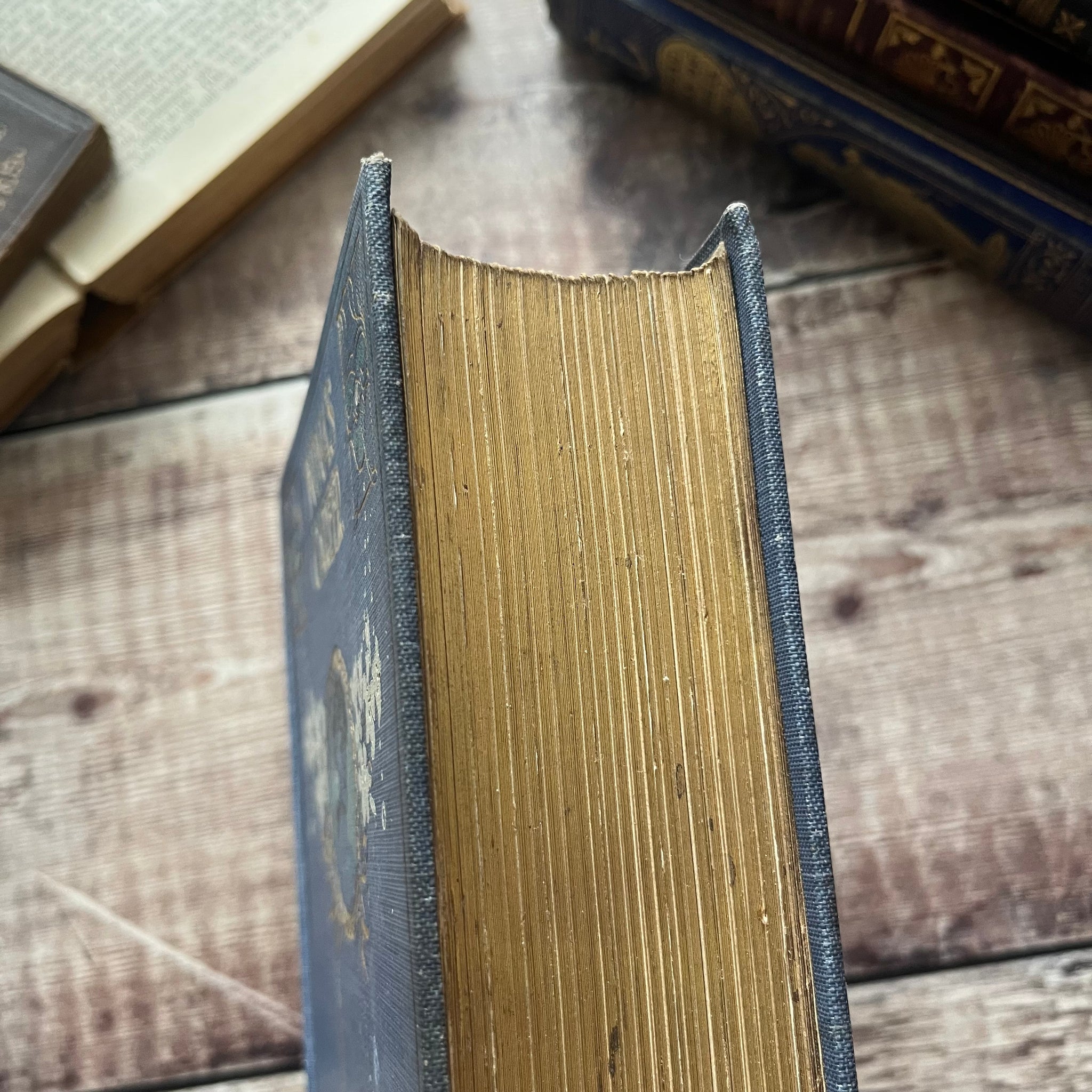 The book is prettily bound in pale blue cloth, with pictorial decoration and gilt to the front board and spine. The decoration has quite an art nouveau feel to it. It's in good condition for it's age but there is wear to the corners which has caused slight splitting and fraying to the cloth. The gilt text block edges are marked and there is bumping and rubbing to the board edges. The boards show minor marking but the spine is more noticeably faded and marked. Crushing to the spine ends has caused minor splitting in the cloth. The spine edges are rubbed and there is the tiniest hole in the cloth at the back external hinge.
