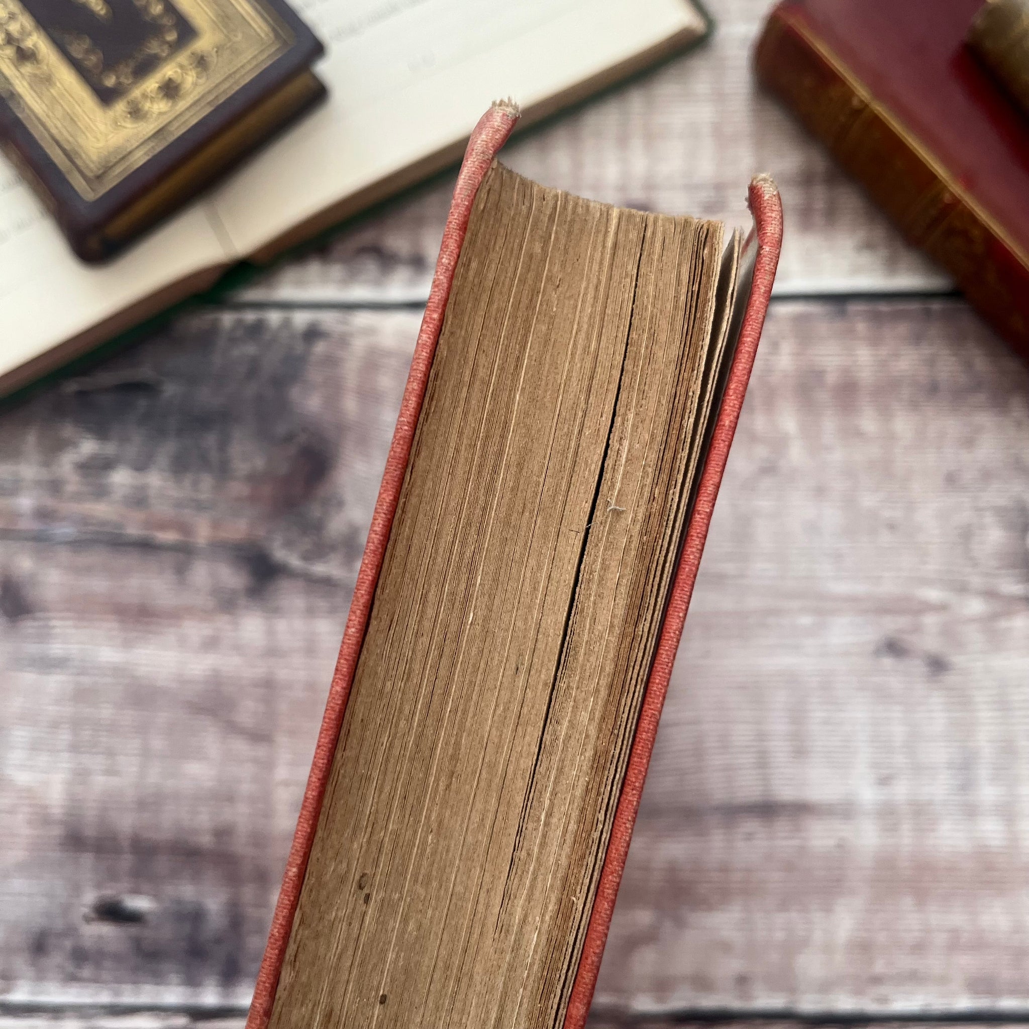 The book is bound in red cloth and is showing it's age. There is wear and crushing to the corners, as well as fading and marking to the boards. The book shows a forward lean and the boards are shaky. The spine is sunned, whilst crushing to the spine ends has caused minor splitting in the cloth.