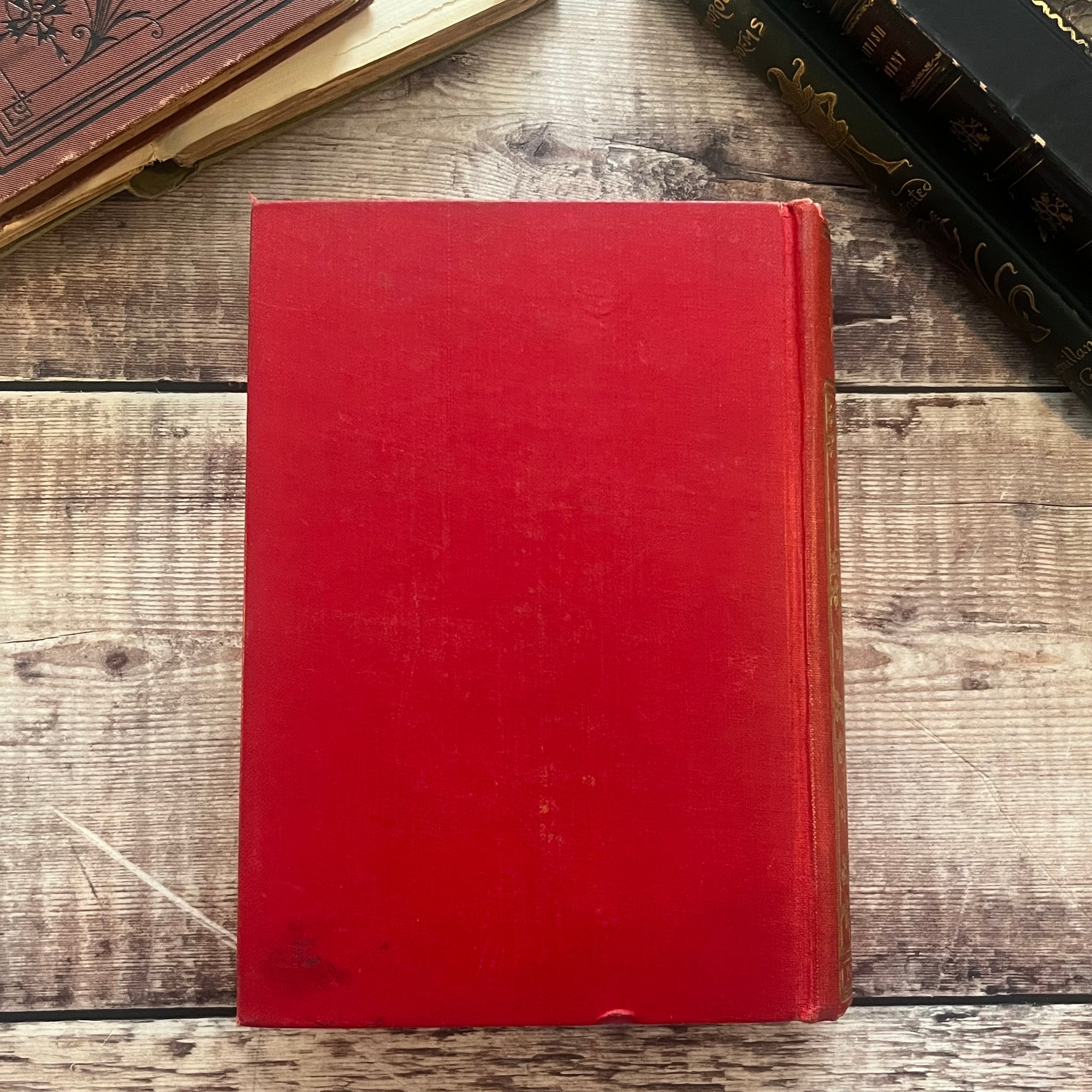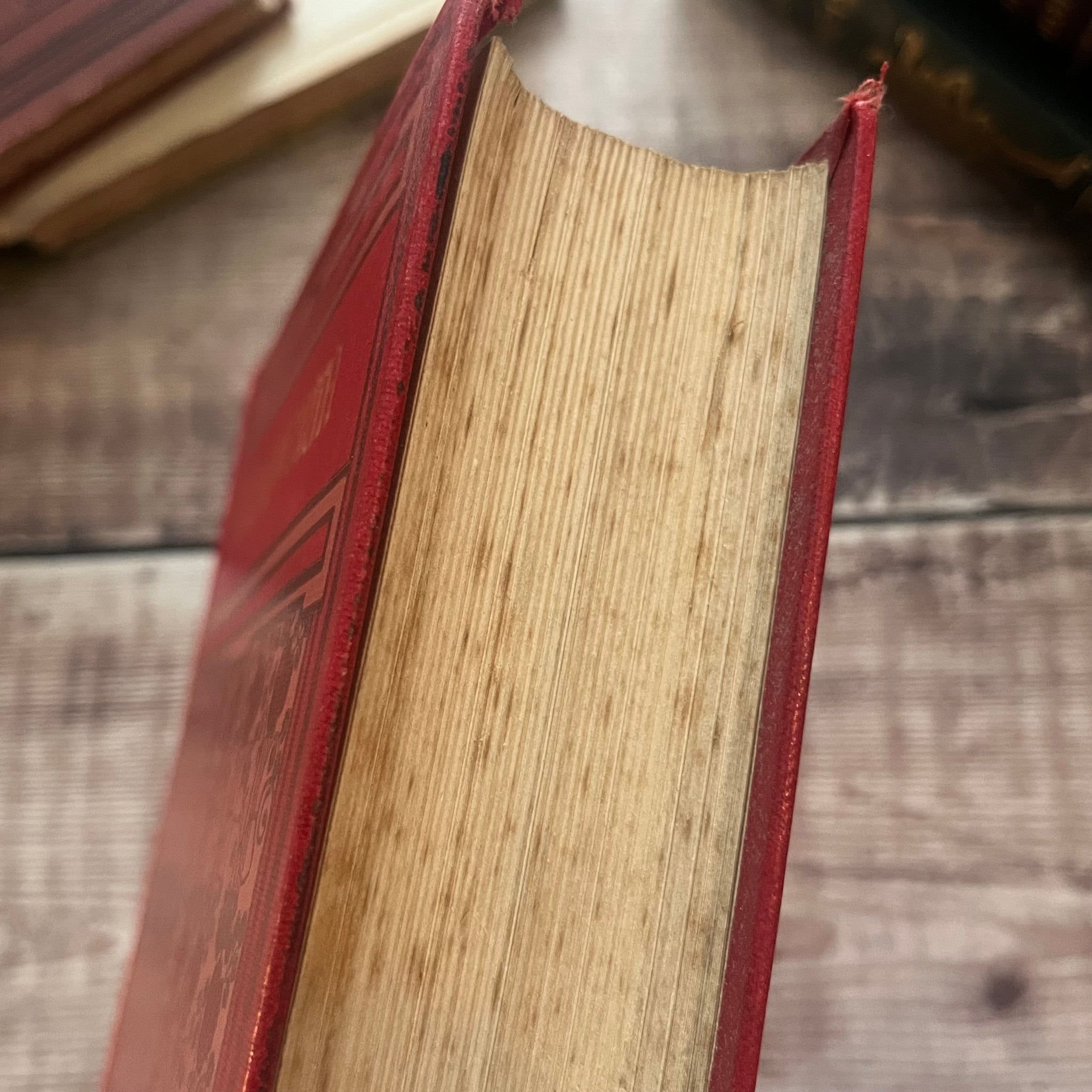 The book is bound in red cloth with beautiful floral decoration to the front board and spine. It's in very good condition but there is some wear to the corners which has caused minor fraying. The text block edges show foxing and there is a bump to the bottom edge of the back board. There is light wear to the bottom of the front board and the spine is lightly sunned.