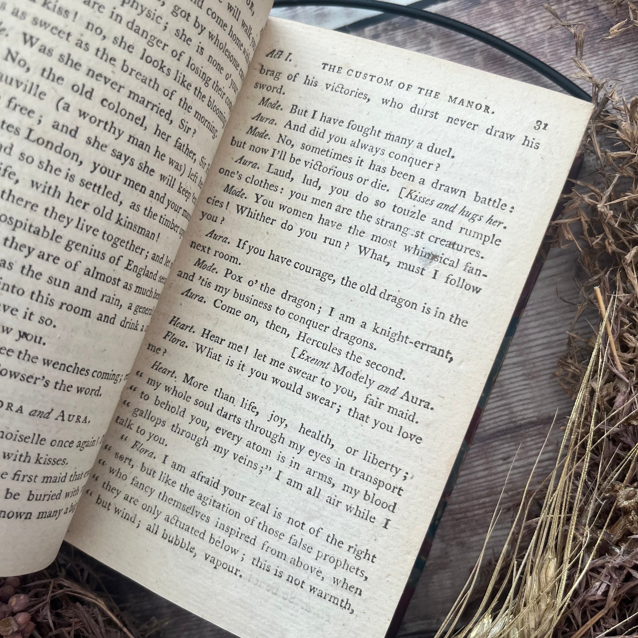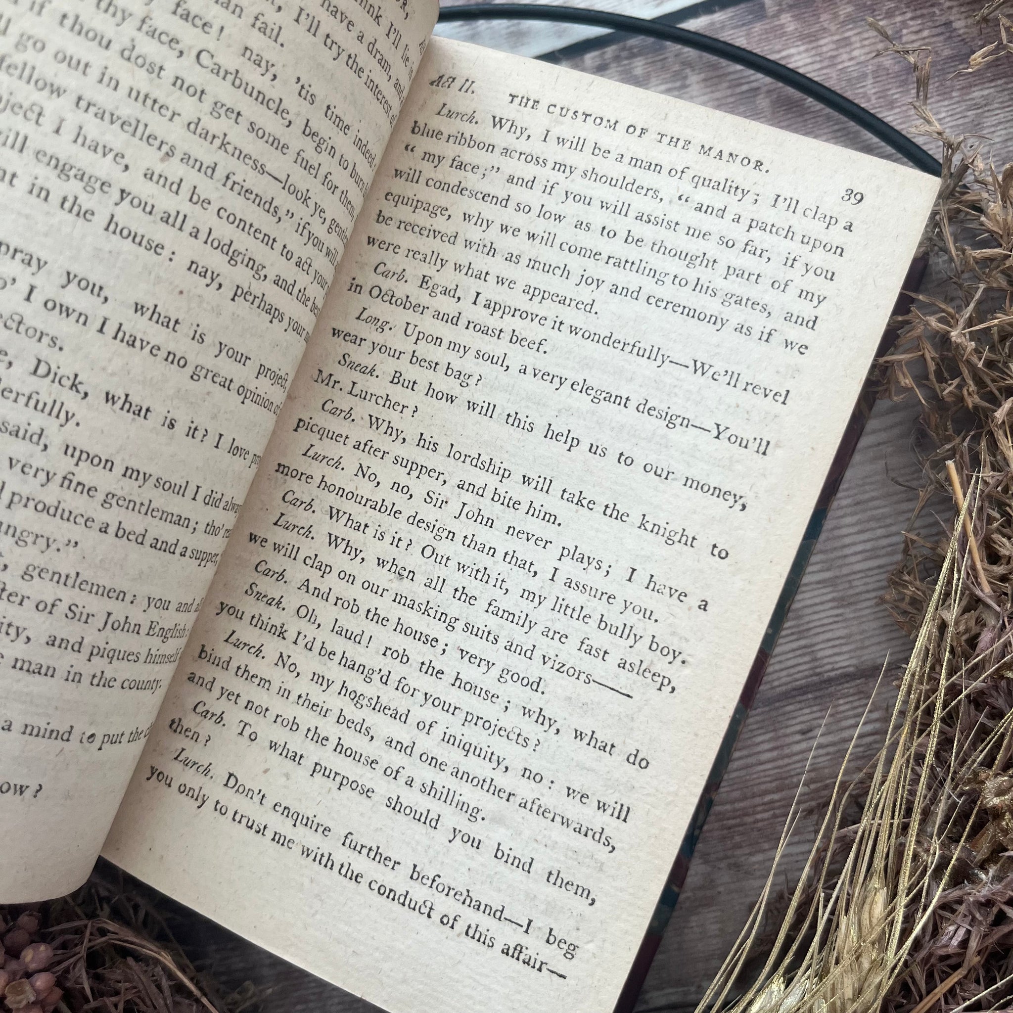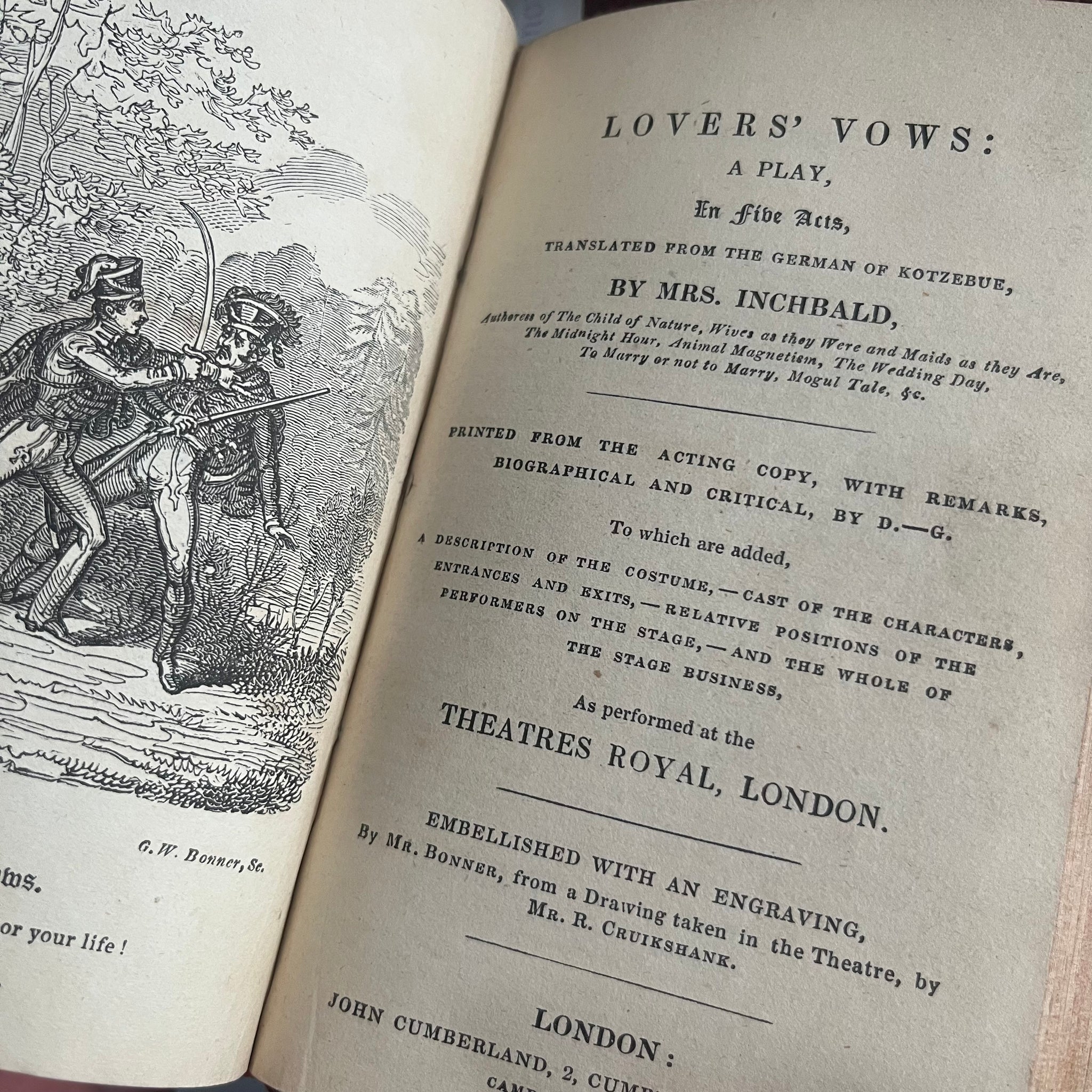 This absolutely stunning book contains several plays bound together as one (with differing dates of publication). The first is The Country Lasses; Or, The Custom of the Manor: A Comedy was adapted for Theatrical Representation, as Performed at the Theatre Royal in Covent Garden, London. It was written by Mr Charles Johnson and published in 1791 by John Bell. The book also features some other works, including The Gamesters by Shirley and Charles Johnson (1792) and Lovers Vows by Elizabeth Inchbald (a play mentioned in Austen's book Mansfield Park) and a few others - the latest is dated 1845.
