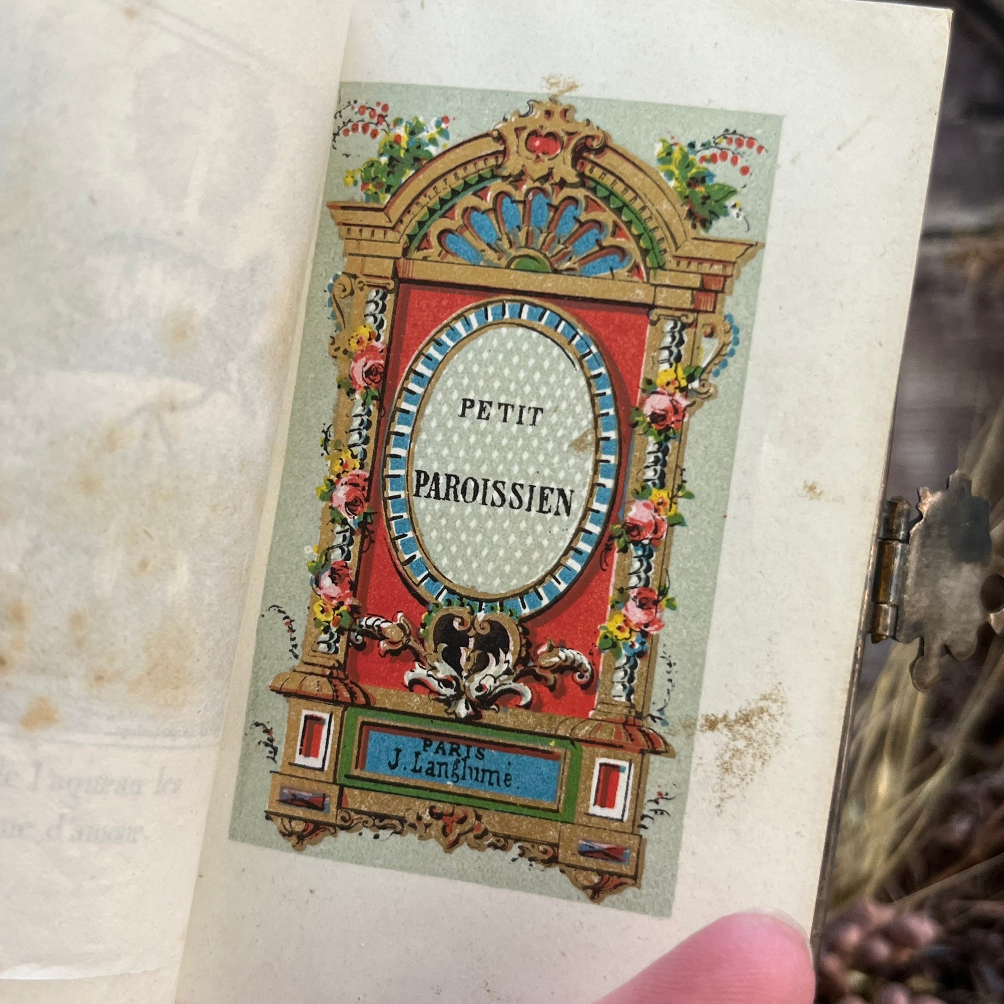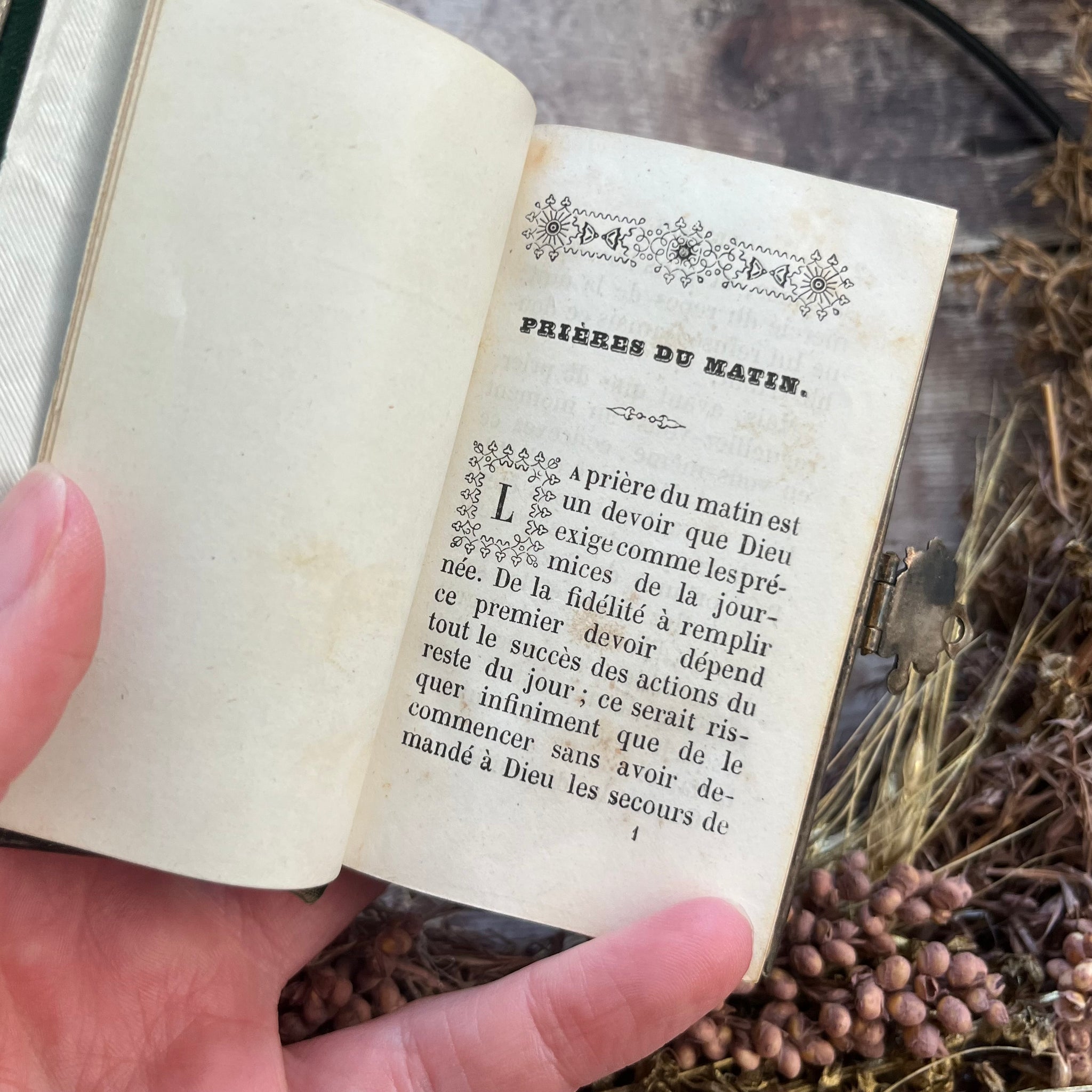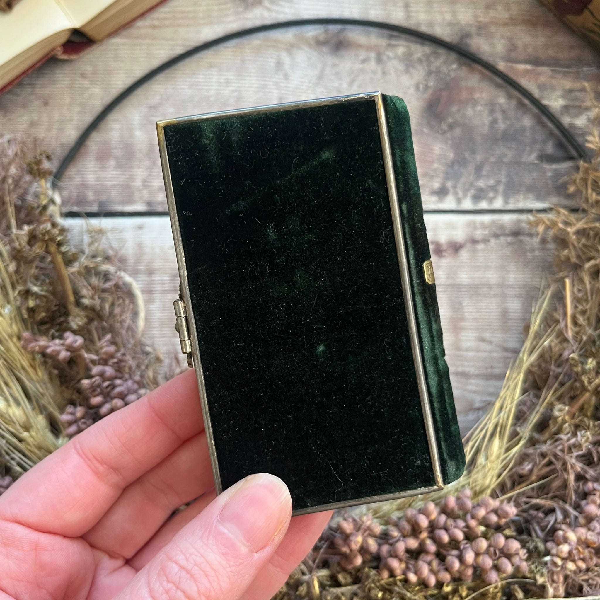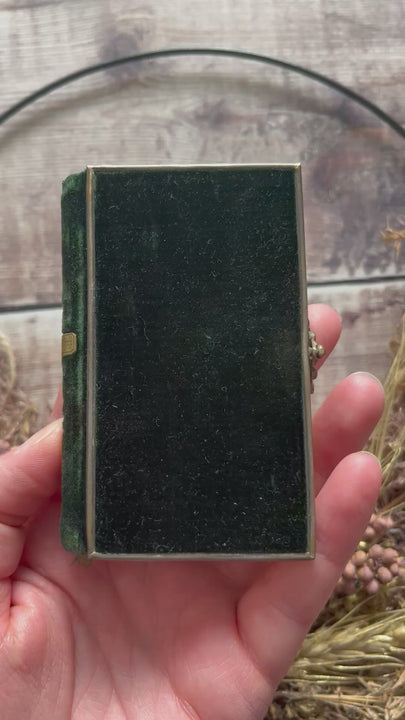This beautiful antique missal book is called Petit Paroissien features a stunning, deep green velvet binding and an ornate metal clasp with four cherub faces at the corners. All edges are gilt.