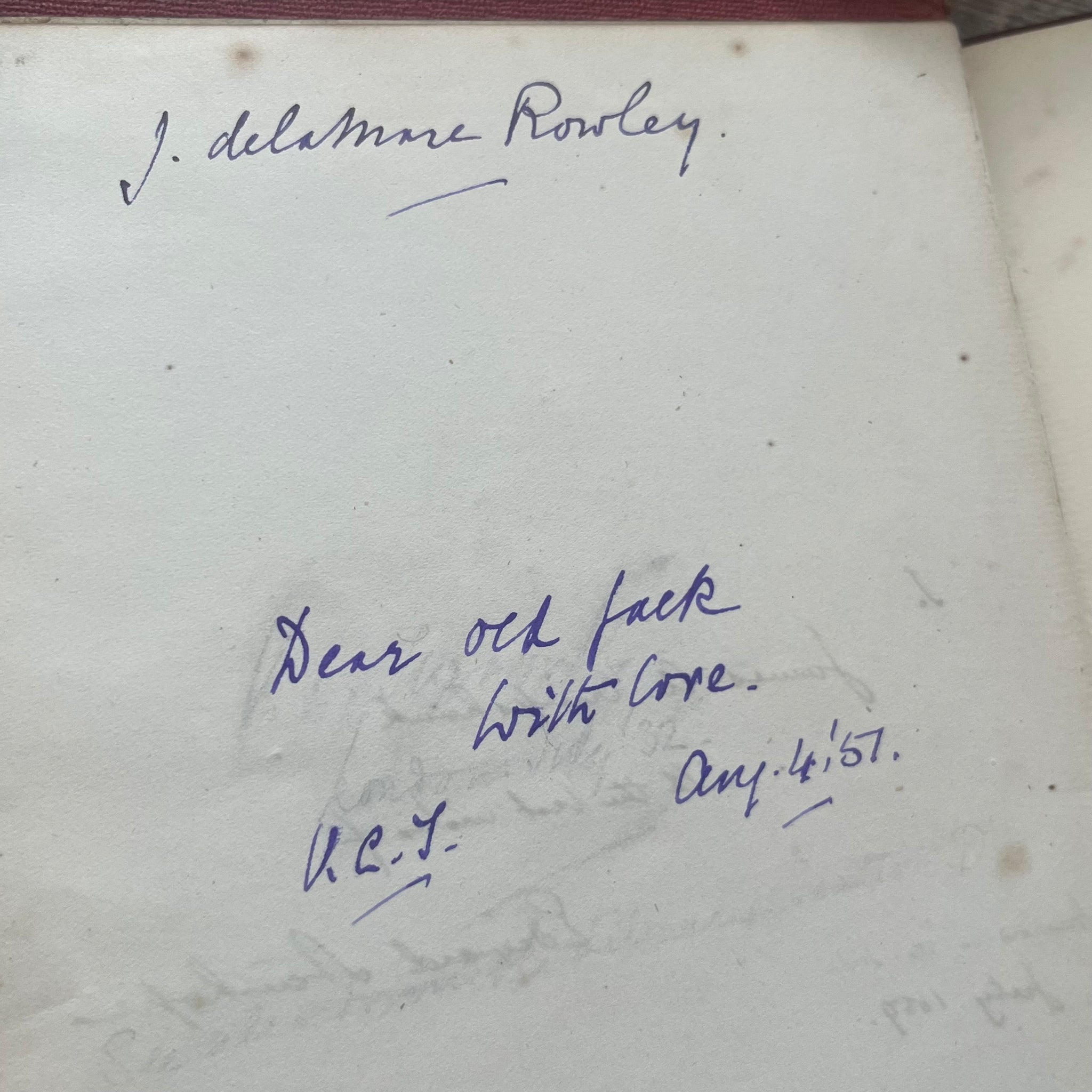 Inside, there is pencilled writing to the front pastedown and a neatly written inscription on the front free endpaper. On the reverse of the FFEP there is another inscription. The pages show age toning and there is quite significant foxing throughout. There are superficial cracks to the gutter in places but the pages remain tightly bound.