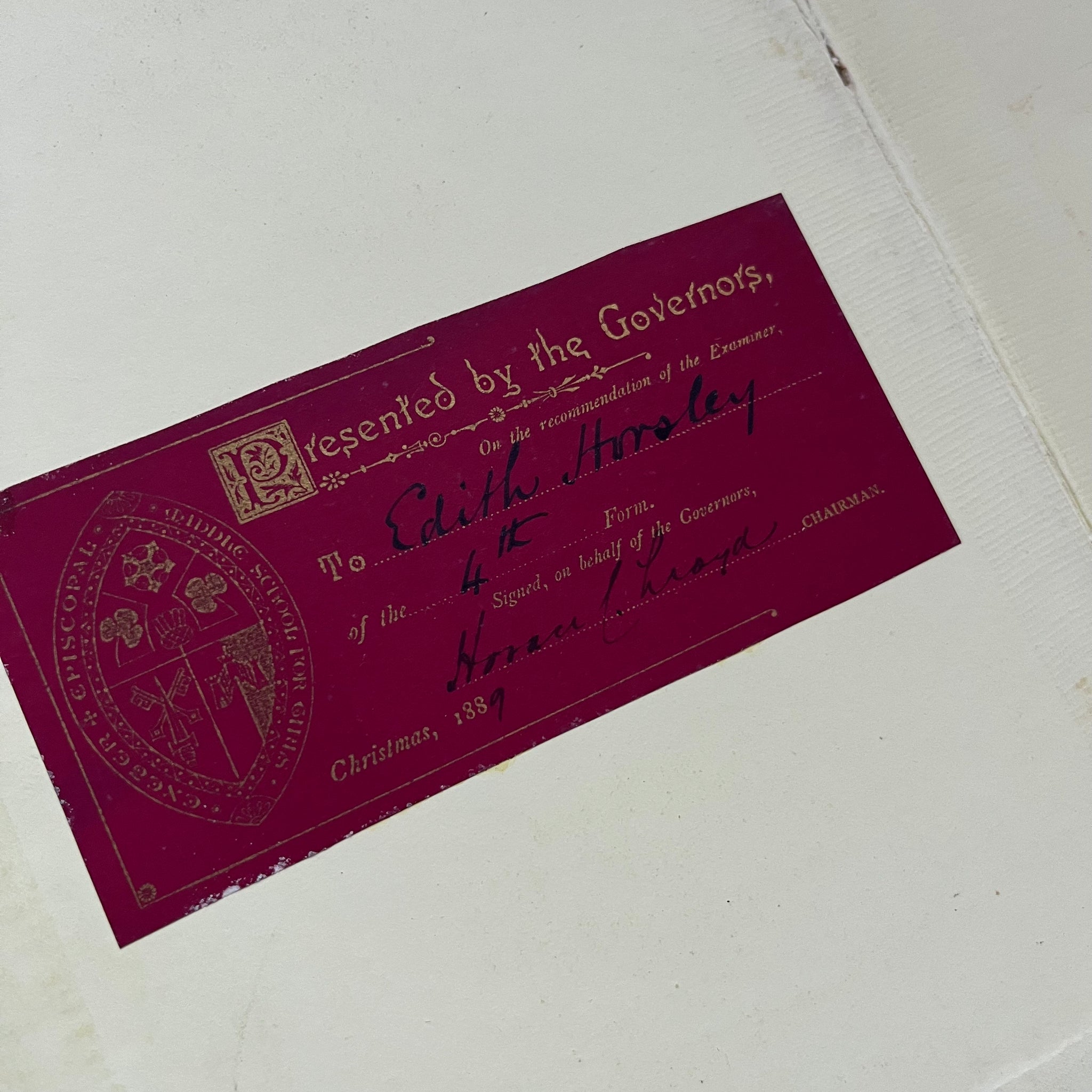 This beautiful book is bound in brown cloth over bevelled boards with stunning blind stamped decoration in gilt and dark brown to the front board and spine. It features delicate gilt flowers and birds which make this a really striking binding. The text block edges are gilt.