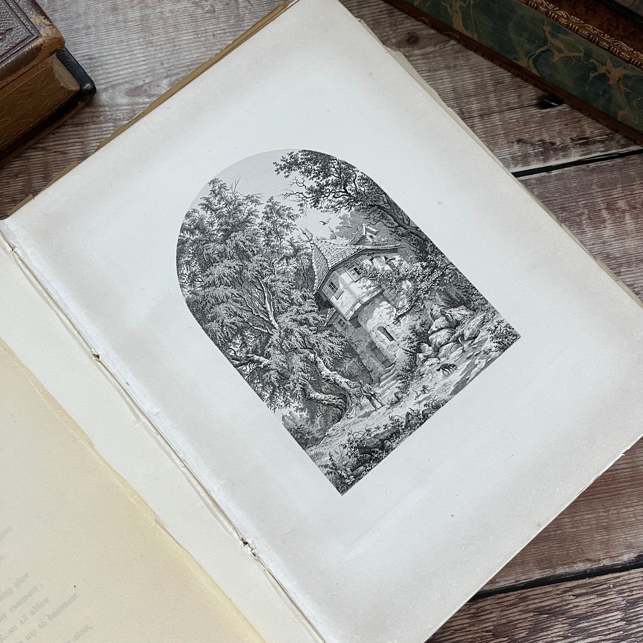 Inside, there is a presentation plate glued to the front pastedown and the hinges are lightly cracked. All of the tissue guards are attached with significant wear and tear to the edges and loss to the tissue in places (this is what can be seen sticking out the edges of the text block - the pages themselves remain tightly bound). The pages show age toning throughout, with occasional foxing and marking in places but the text remains clear and bright. There are some cracks to the gutter in places but the pages are tightly bound.