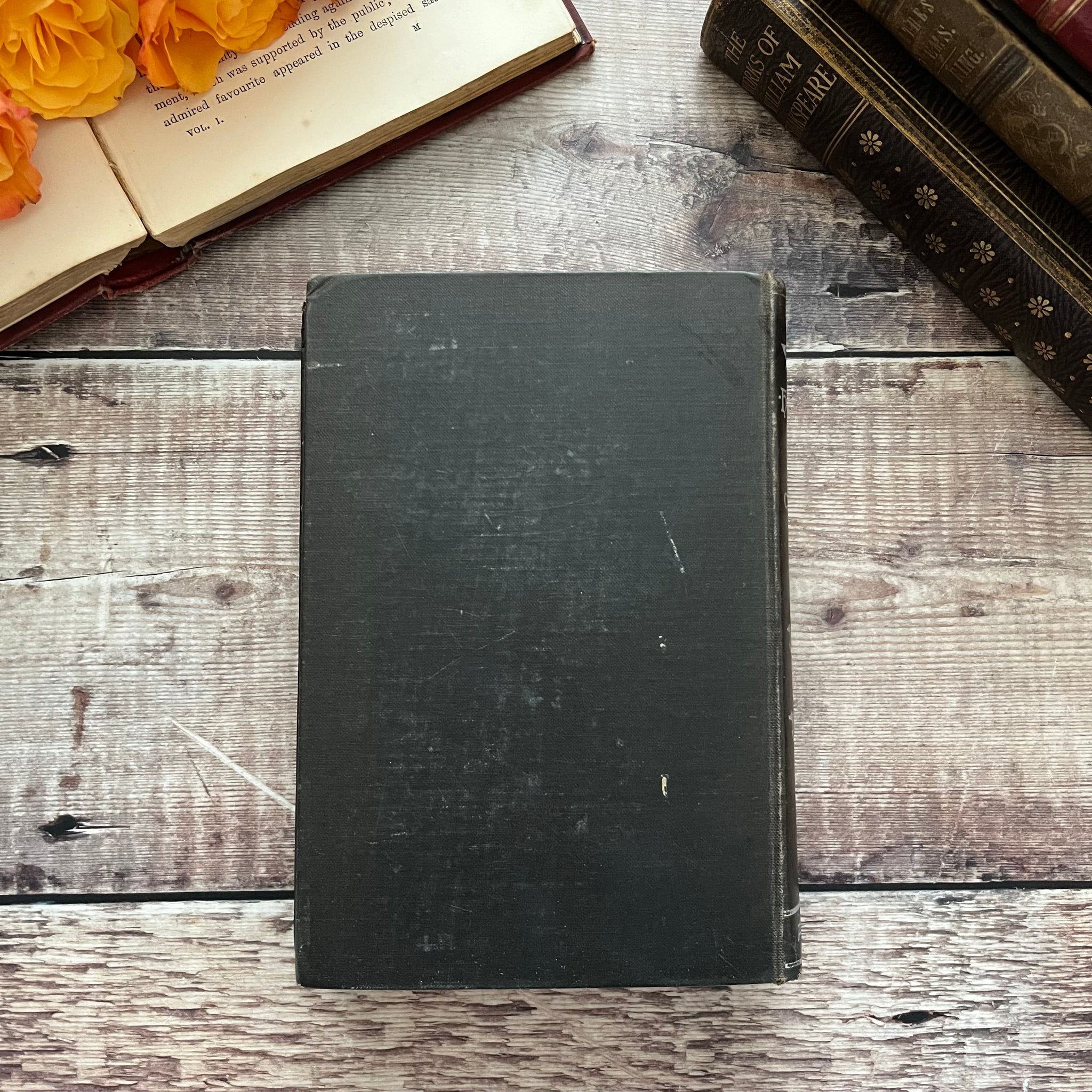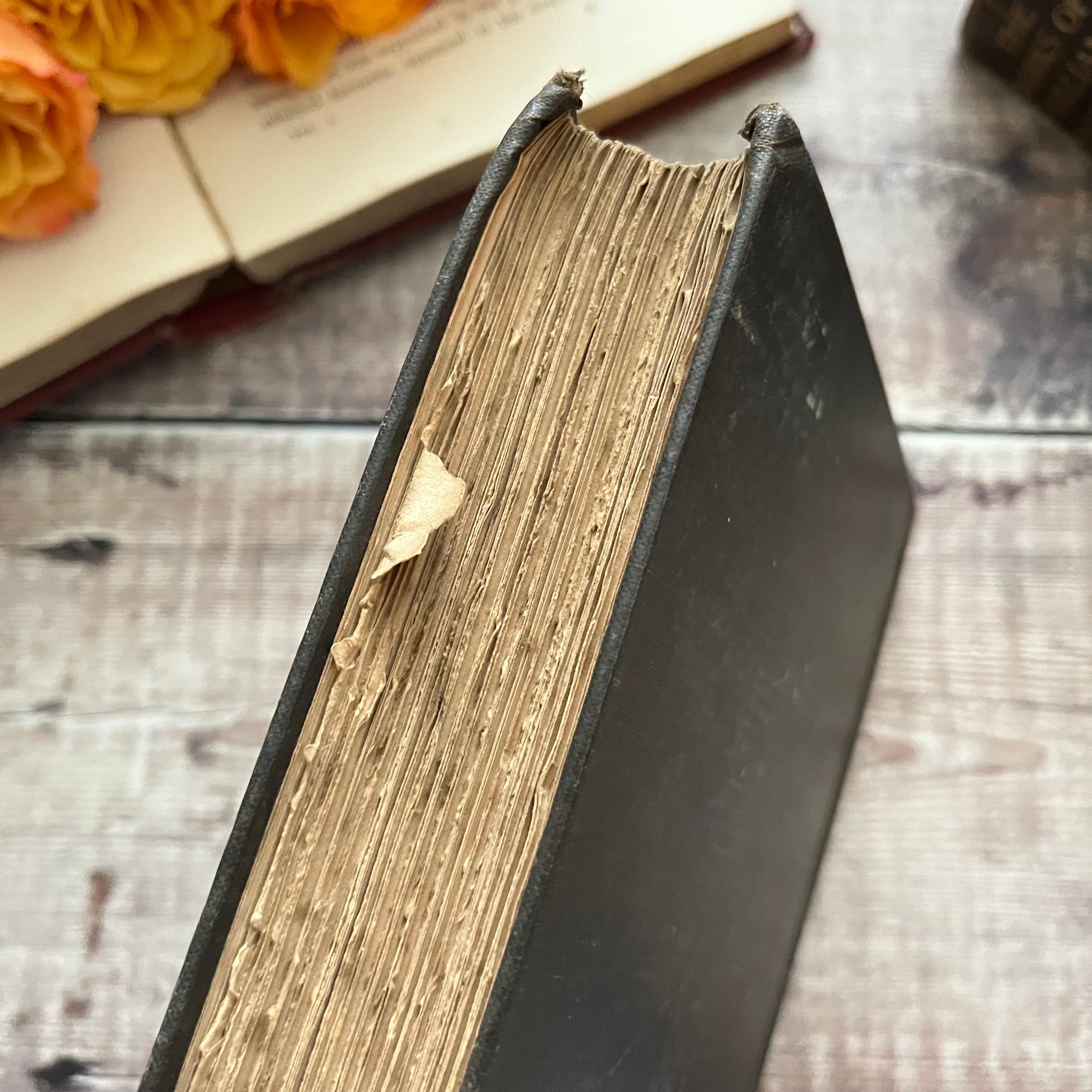The book is bound in black cloth with stunning gilt decoration blind stamped to the front board and spine. It's a really striking binding and in good condition for it's age. The book shows a forward lean and there is light wear and crushing to the corners. The boards have some light marking and scuffing, and there is bumping to the bottom edge of the back board. The spine is very faintly sunned, with crushing to the spine ends which has caused some minor splitting in the cloth. There is a small hole in the cloth of the spine, just to the right of the gilt flowers.