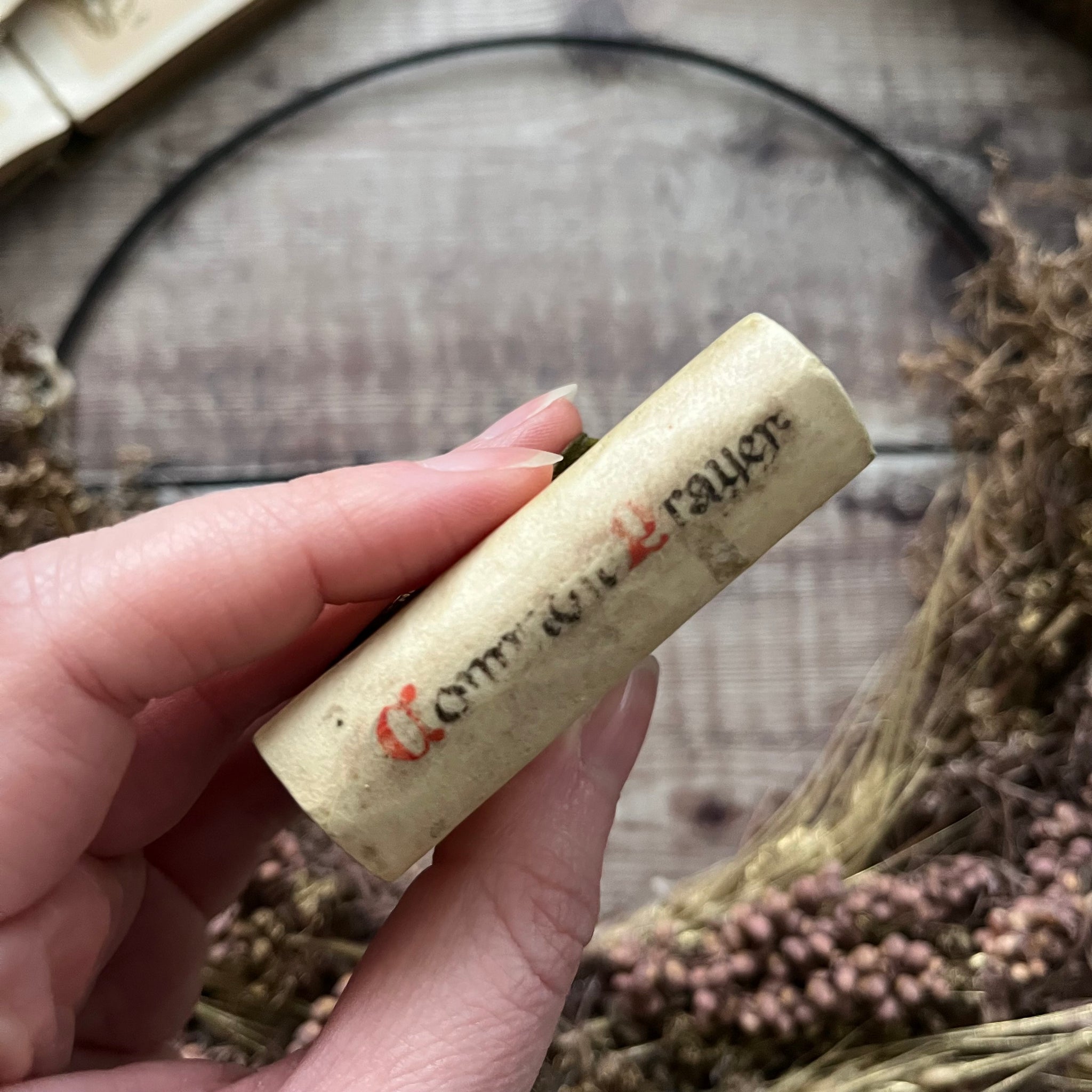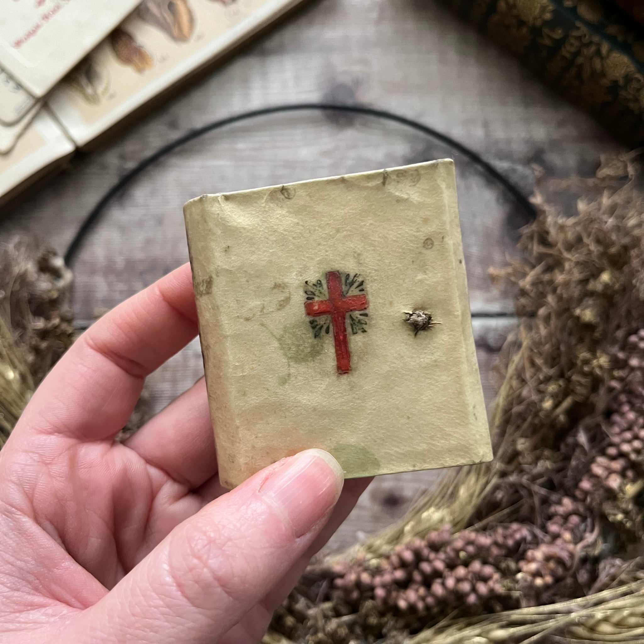 This beautiful and unique edition of the Book of Common Prayer was published by Oxford University Press. The book is undated but I'd estimate it to be circa 1910. It is bound in full vellum with a yapp binding, and has hand painted detail to the front. There is a velvet ribbon tie but this is sadly missing from the front from overuse and the back tie is frayed.
