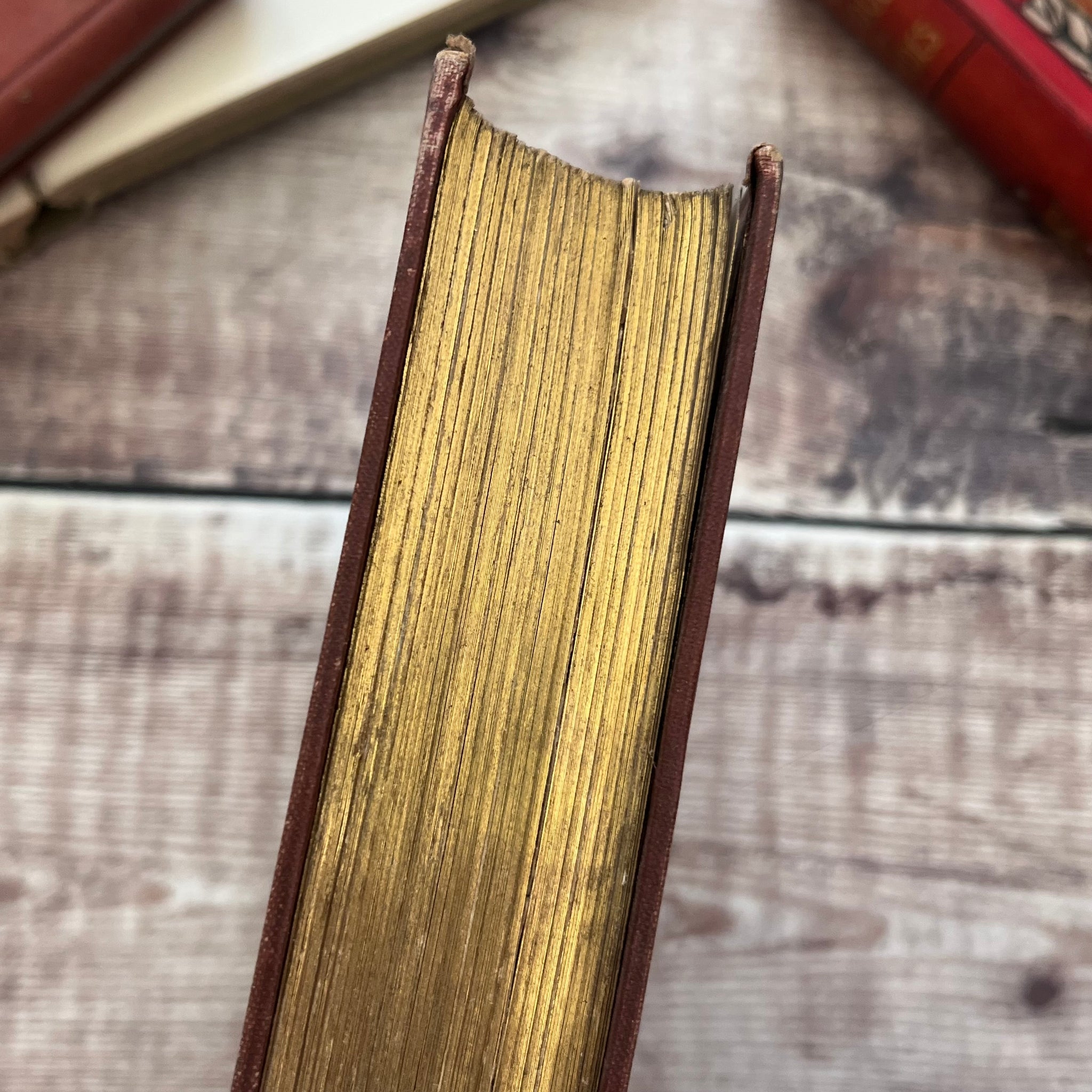 The book is bound in brown cloth with stunning gilt decoration to the front board and spine. It's in good condition but there are signs of wear. There is some rubbing and dulling to the gilt on the front and spine, and the book shows a slight forward lean. The corners show light wear and crushing. The back board shows some light marking and the spine is darkened, with rubbing to the spine edges. There is also crushing to the spine ends which has caused minor splitting in the cloth and faint scratches to the front board.