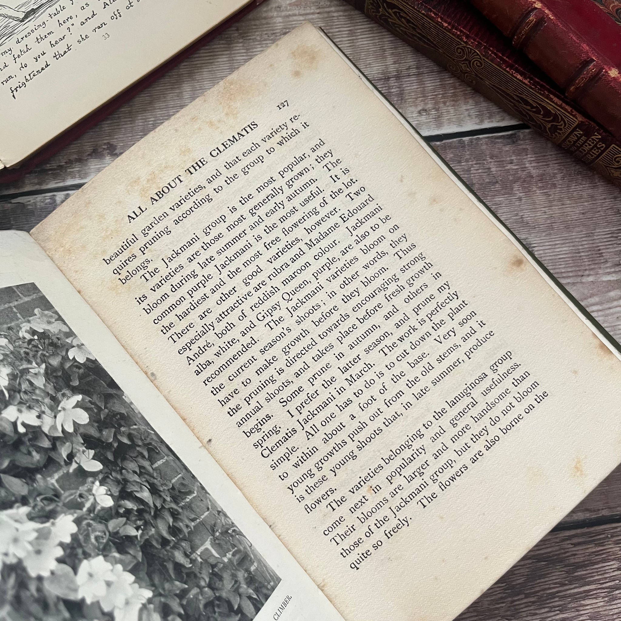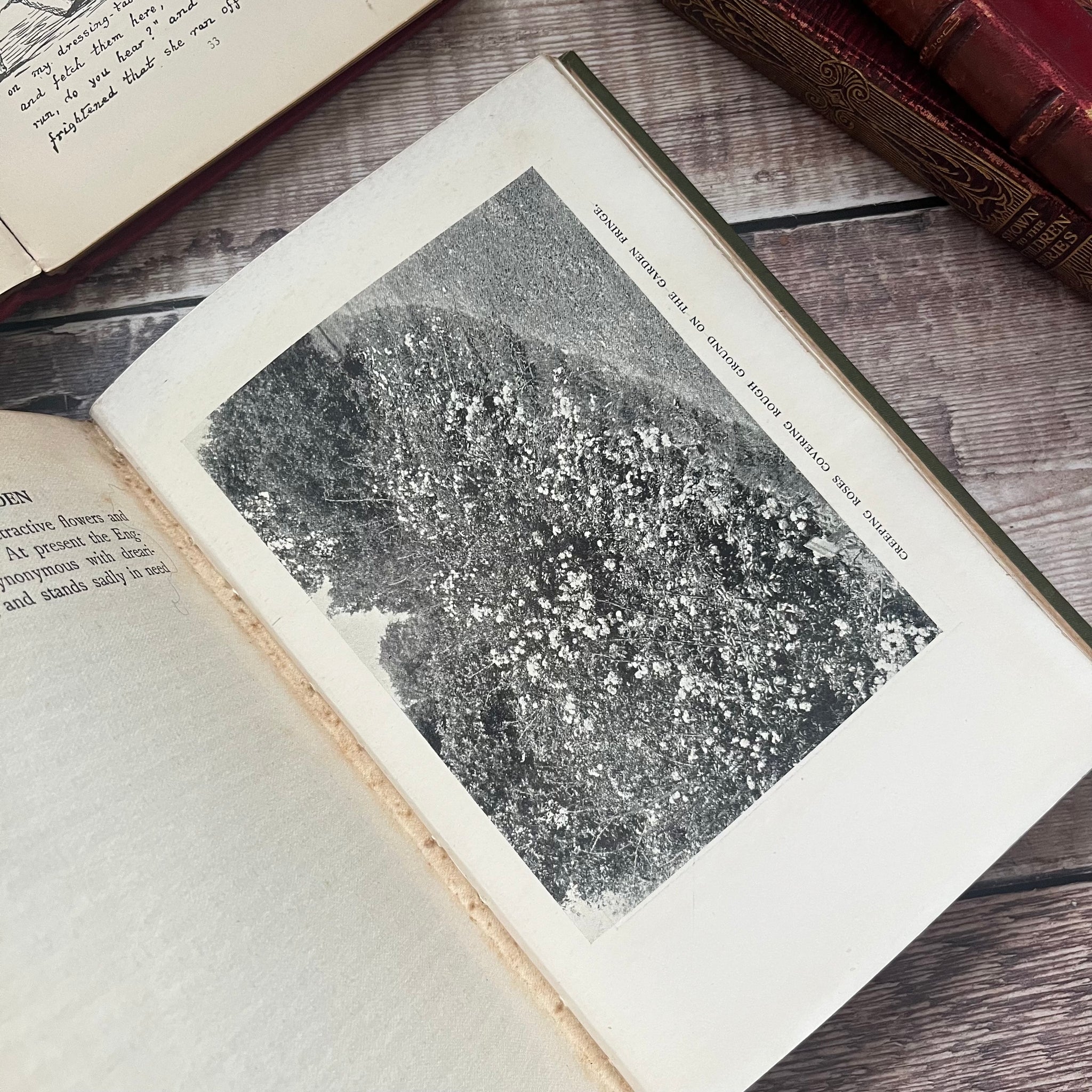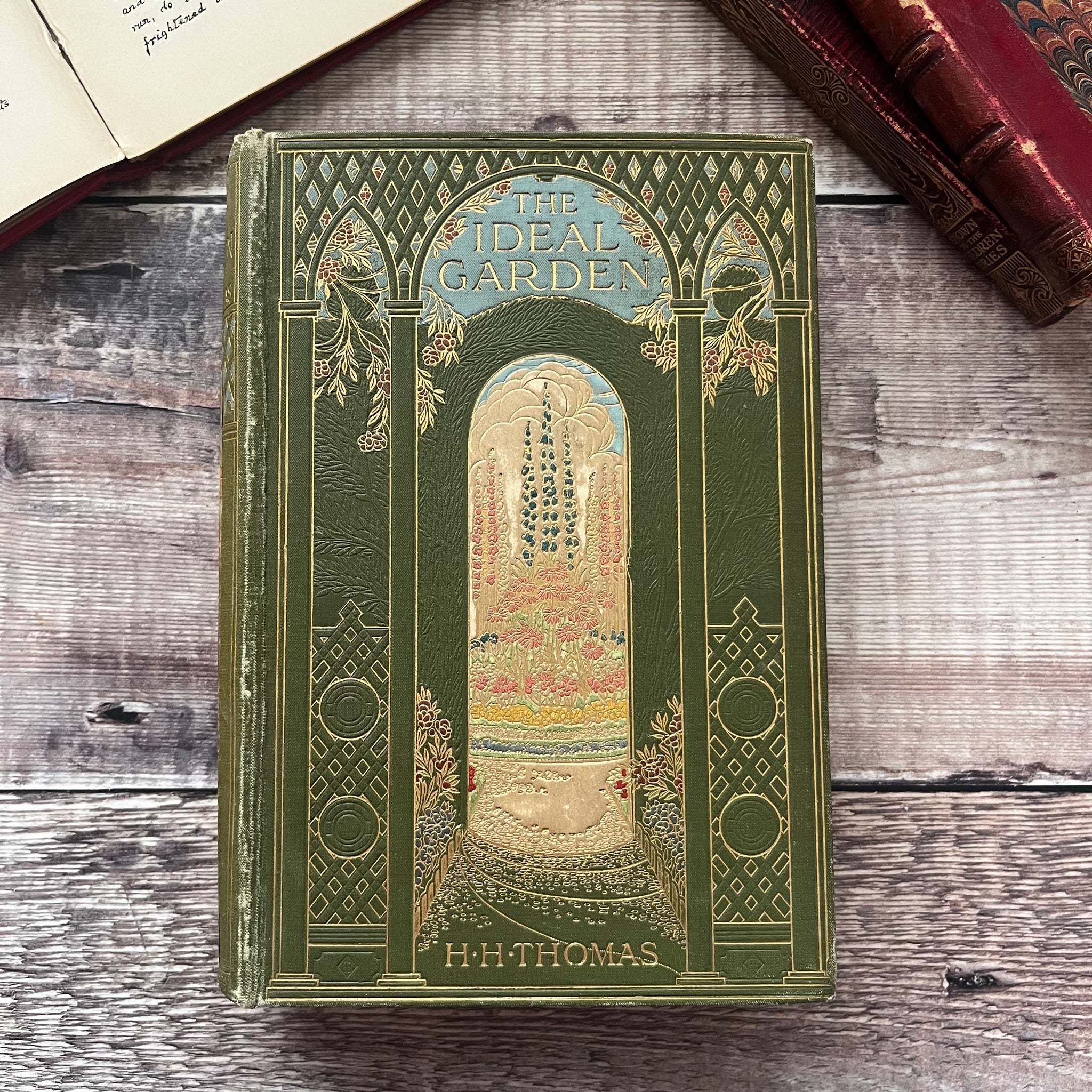 This beautiful second edition of The Ideal Garden by H.H.Thomas was published by Cassell and Company Ltd in 1910. This lovely vintage book is bound in green cloth with ornate decoration to the front board and spine. It's in good condition for it's age but there are a few condition points of note. There is light wear and crushing to the corners and foxing to the text block edges. There is light shelf wear to the board edges and some scuff marks to the back board. The spine is a bit sunned, with rubbing to the spine edges and crushing to the spine ends - this has caused splitting in the cloth at the spine ends.