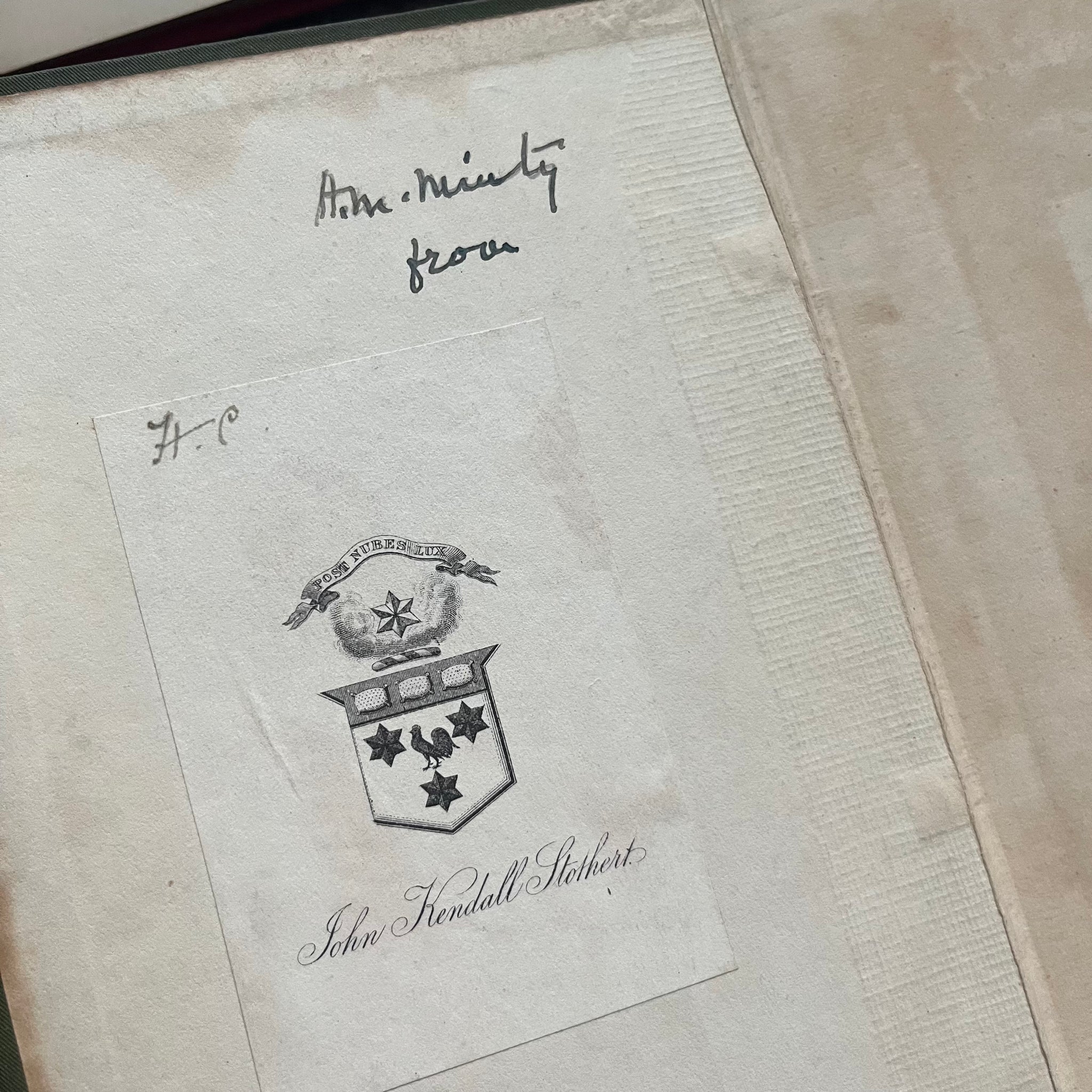 Inside, there is name plate and written dedication on the front pastedown. The endpapers are tanned and the pages show significant foxing throughout. The text block is a little shaky, with cracking to the gutter in places, but there are no loose pages.