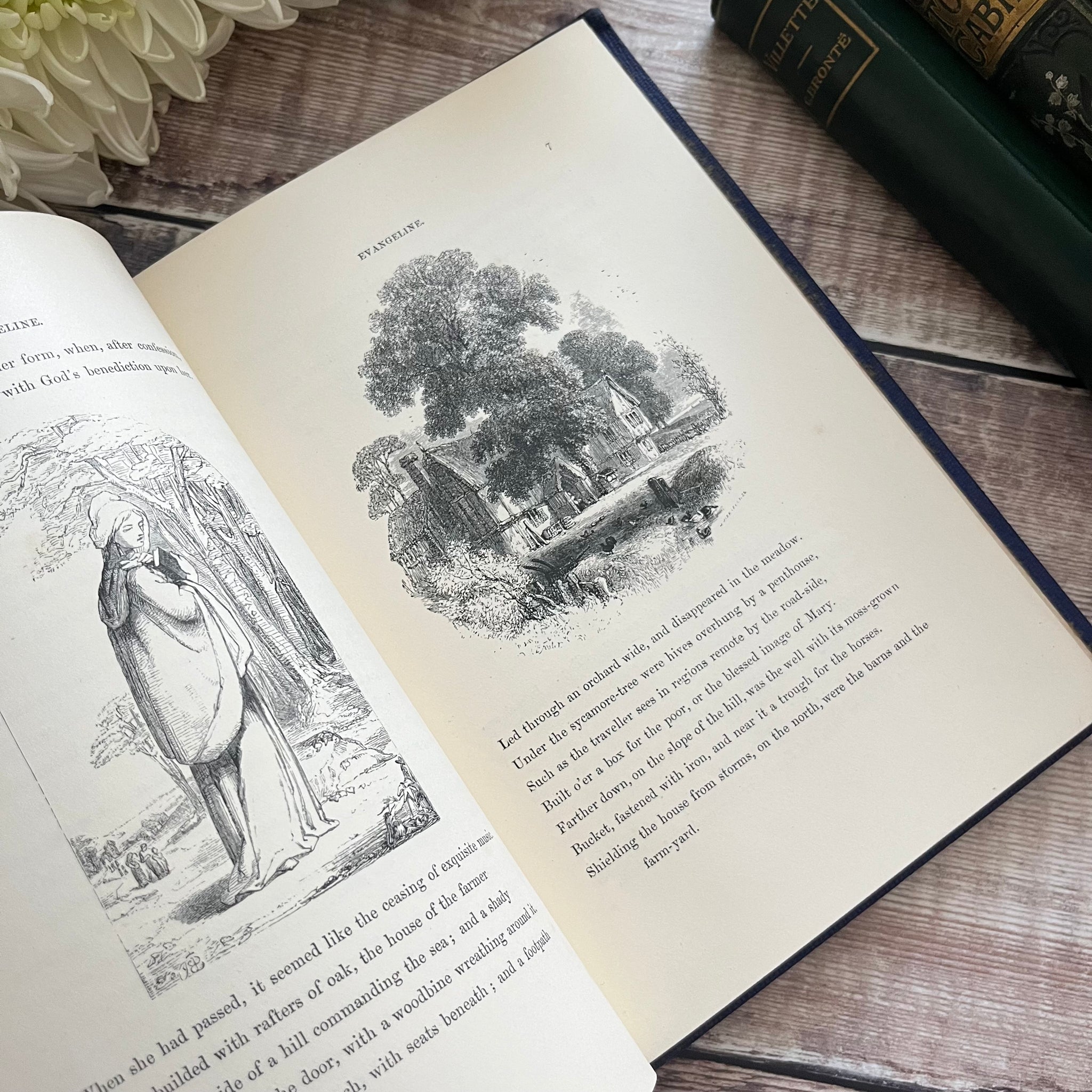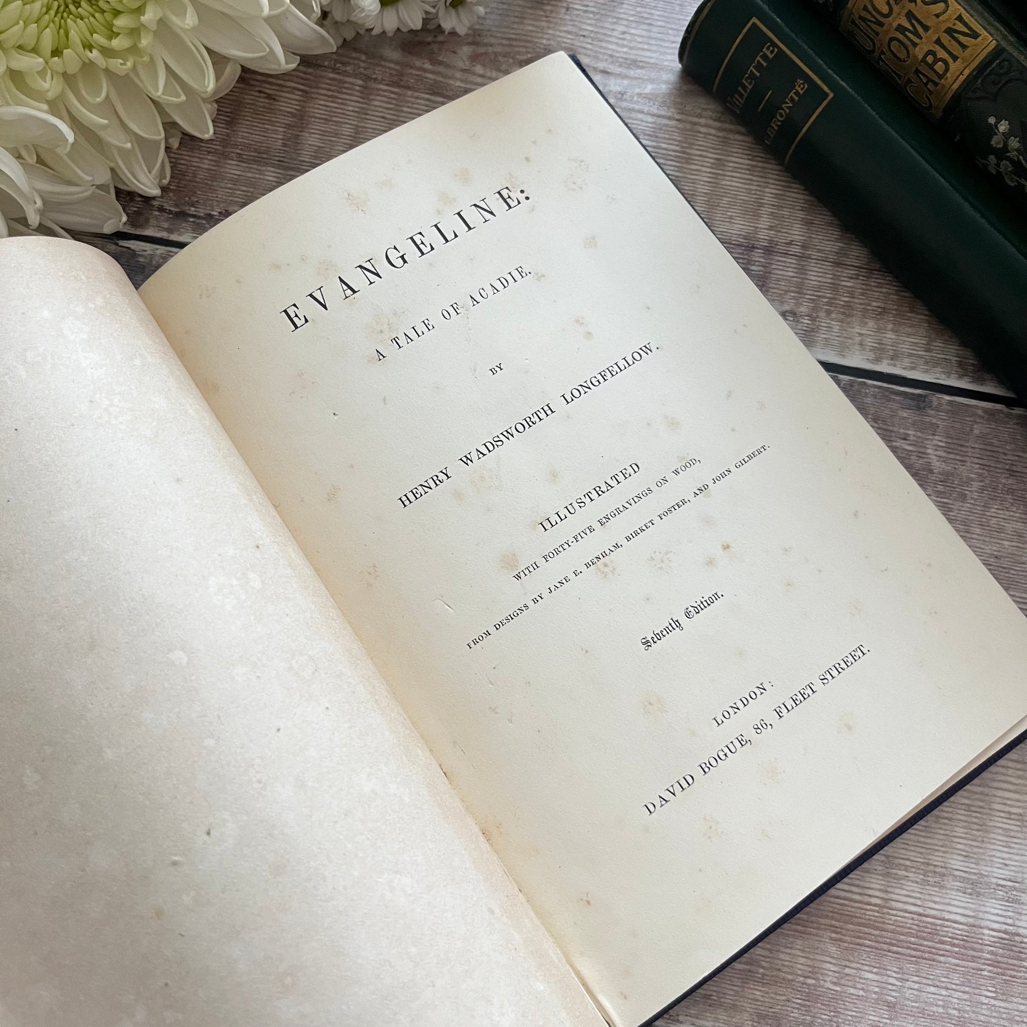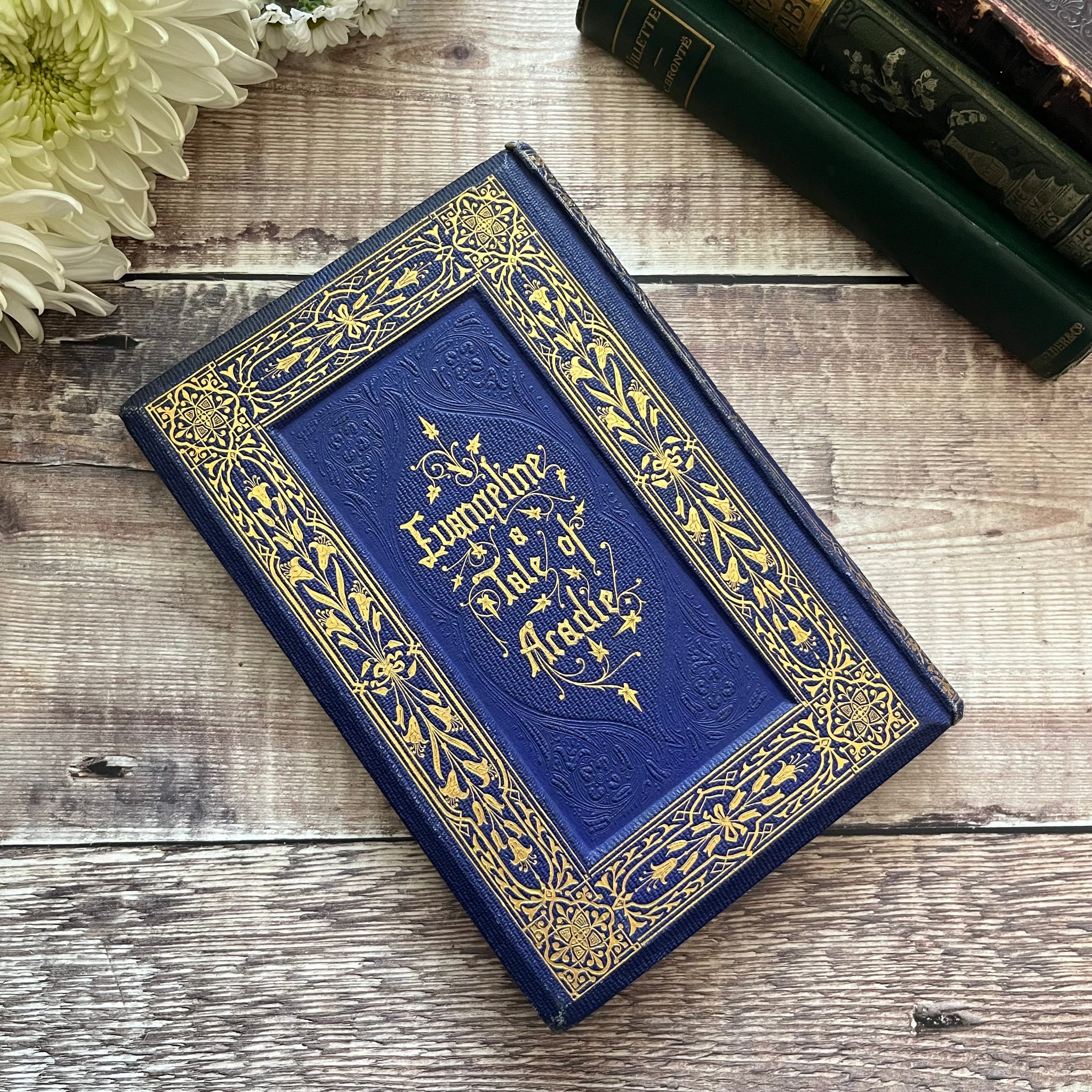 This stunning antique edition of Evangeline A Tale of Acadie by Longfellow was published by David Bogue. The book is undated but I'd estimate it to be mid Victorian. The book is bound in blue cloth with stunning gold gilt decoration blind stamped into the boards and spine. The boards are bevelled and the text block edges are gold gilt.