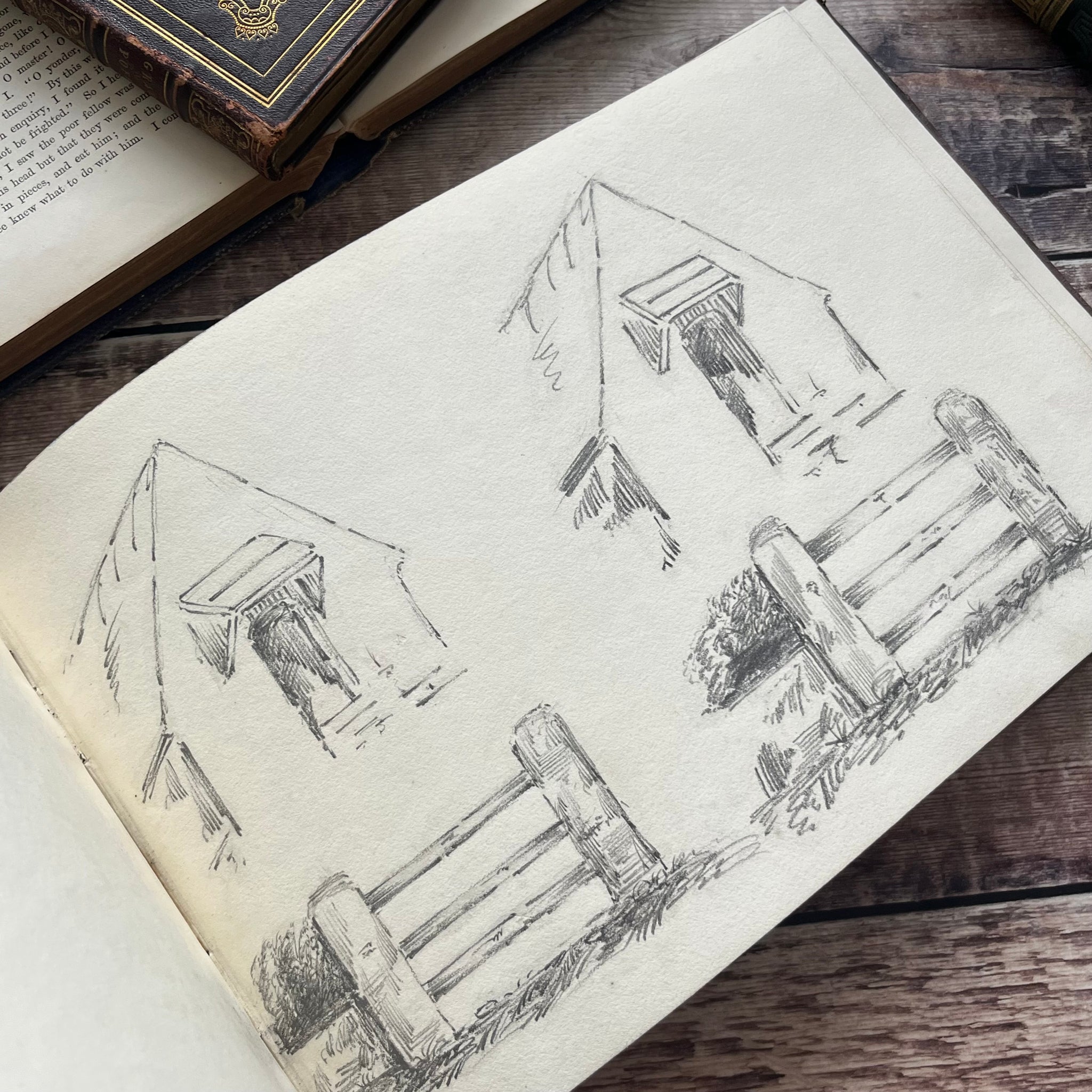 This treasure of a book features a collection of sketches in pencil , all with an architectural theme. It dates from the mid19th Century - the name Gordon Duff October 1854 is written on the verso of the FFEP.
