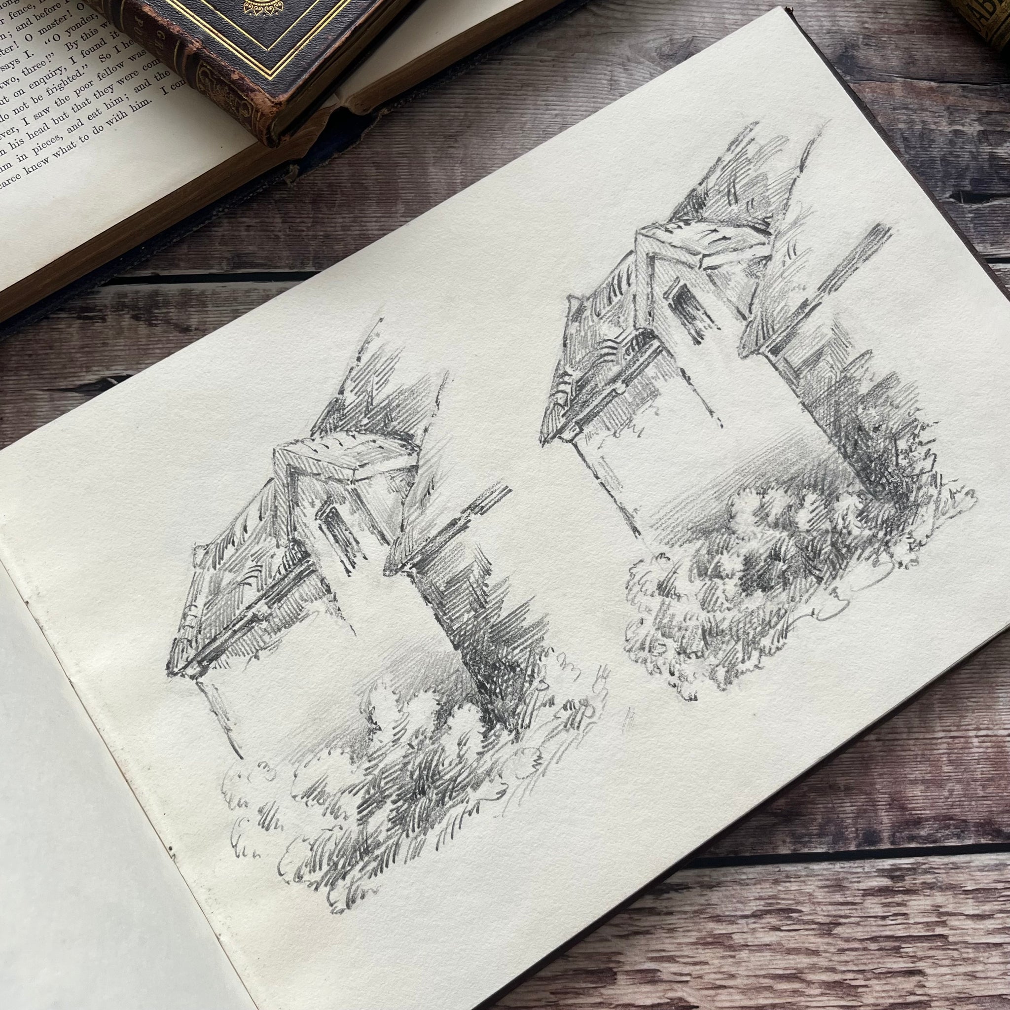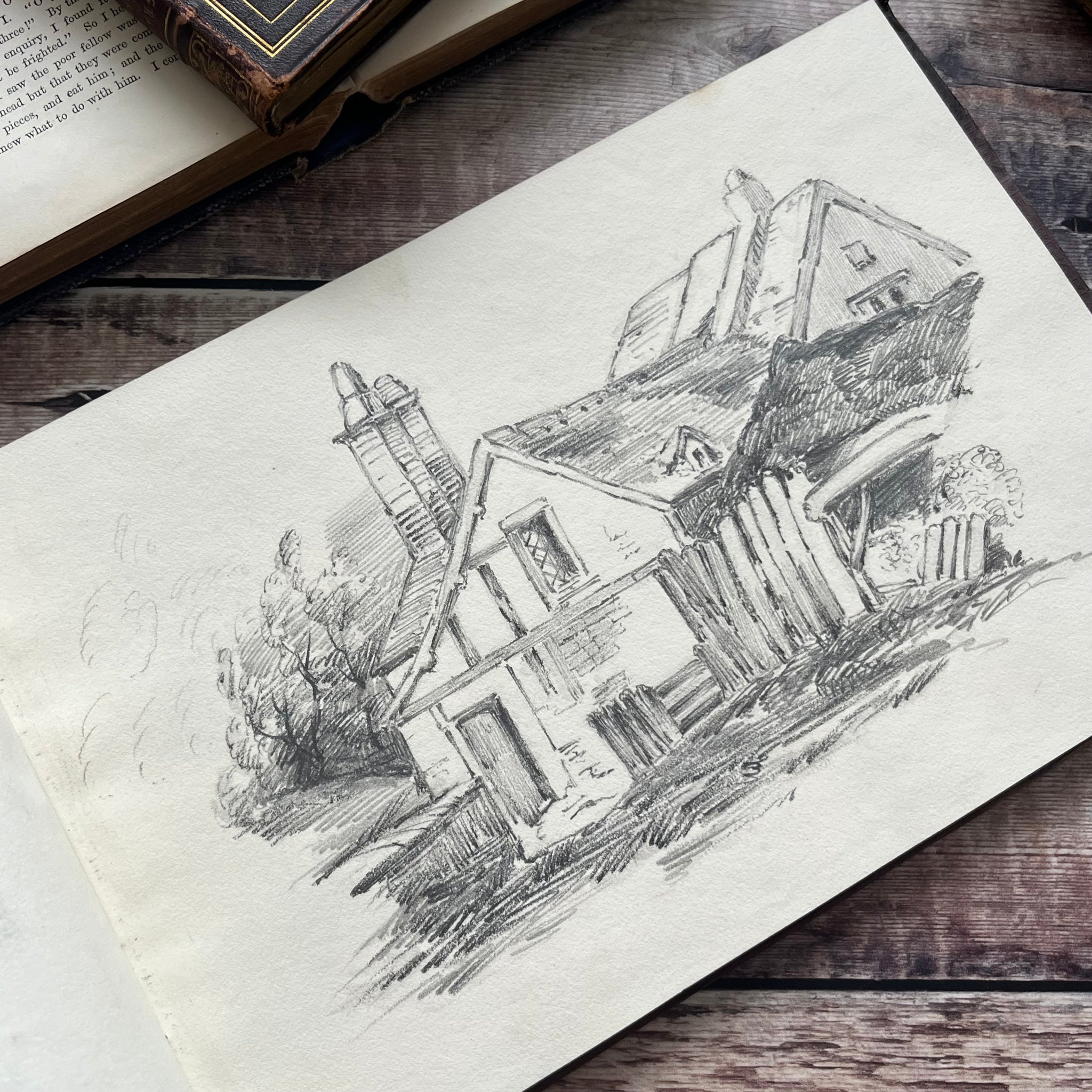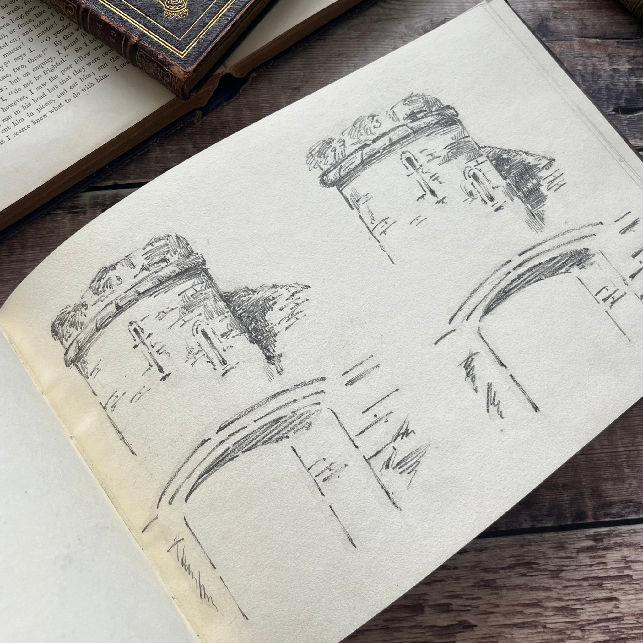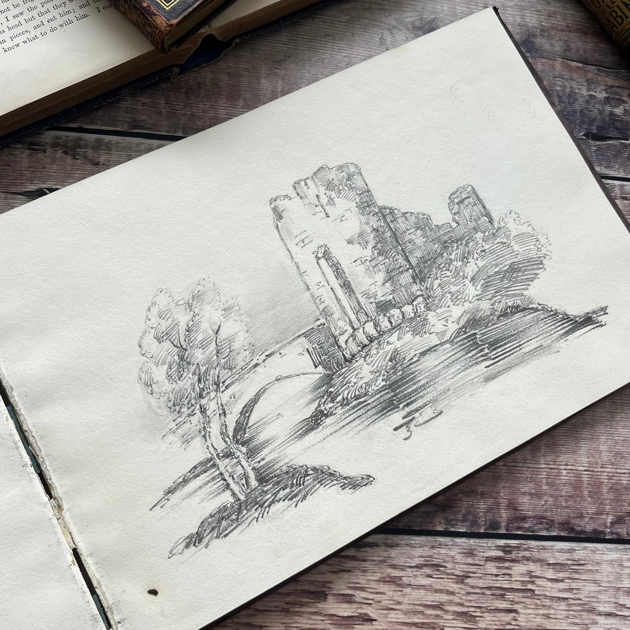 These original sketches were obviously created by someone with artistic talent - there's a beautiful collection of cottages, old historical buildings, farm buildings and even a seaside scene. There are 14 large pages of drawings some of which have multiple drawings per page. The pages are in excellent condition inside, with little foxing or age toning. The rest of the album is blank with tartan-style endpapers.