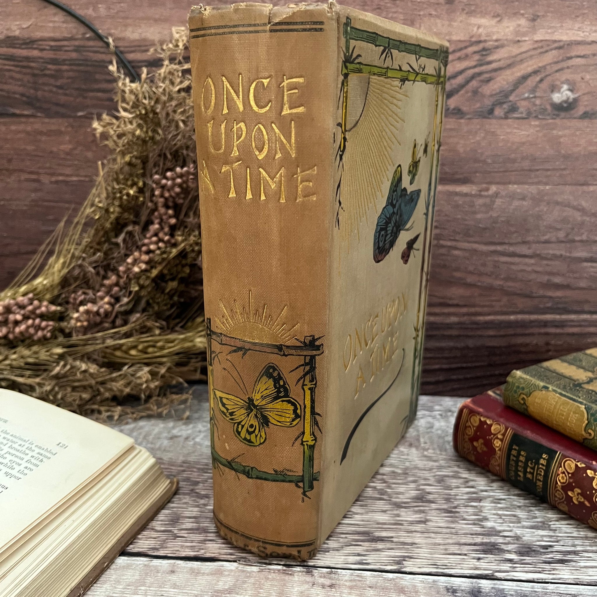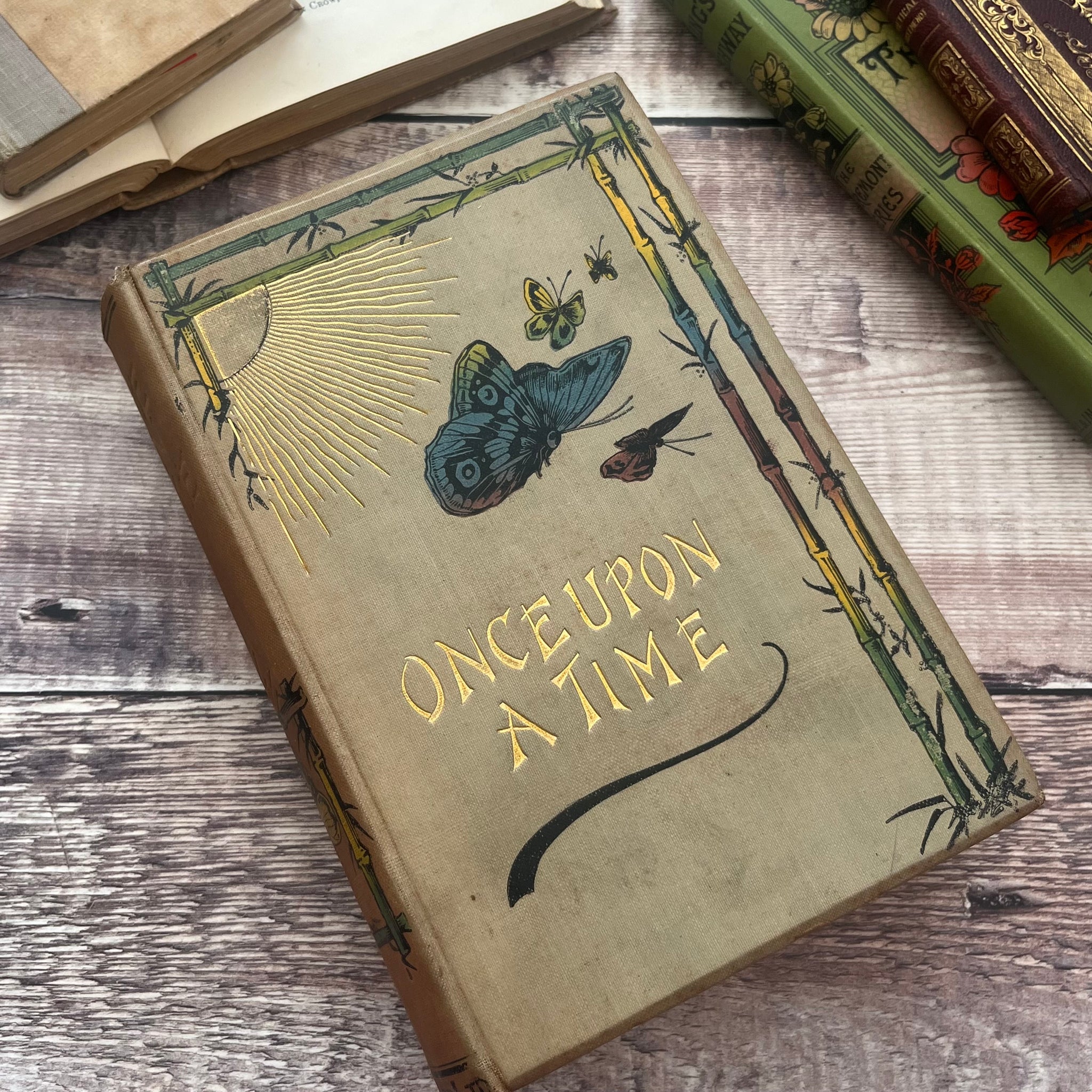 This stunning and rare edition of Once Upon a Time was published by Dean and Sons. I've found it very difficult to date as I can't find any other editions online! I'd estimate it to be from circa 1900. The book is bound in grey cloth over bevelled boards with beautiful pictorial decoration and gilt to the front board and spine. All edges are gilt.