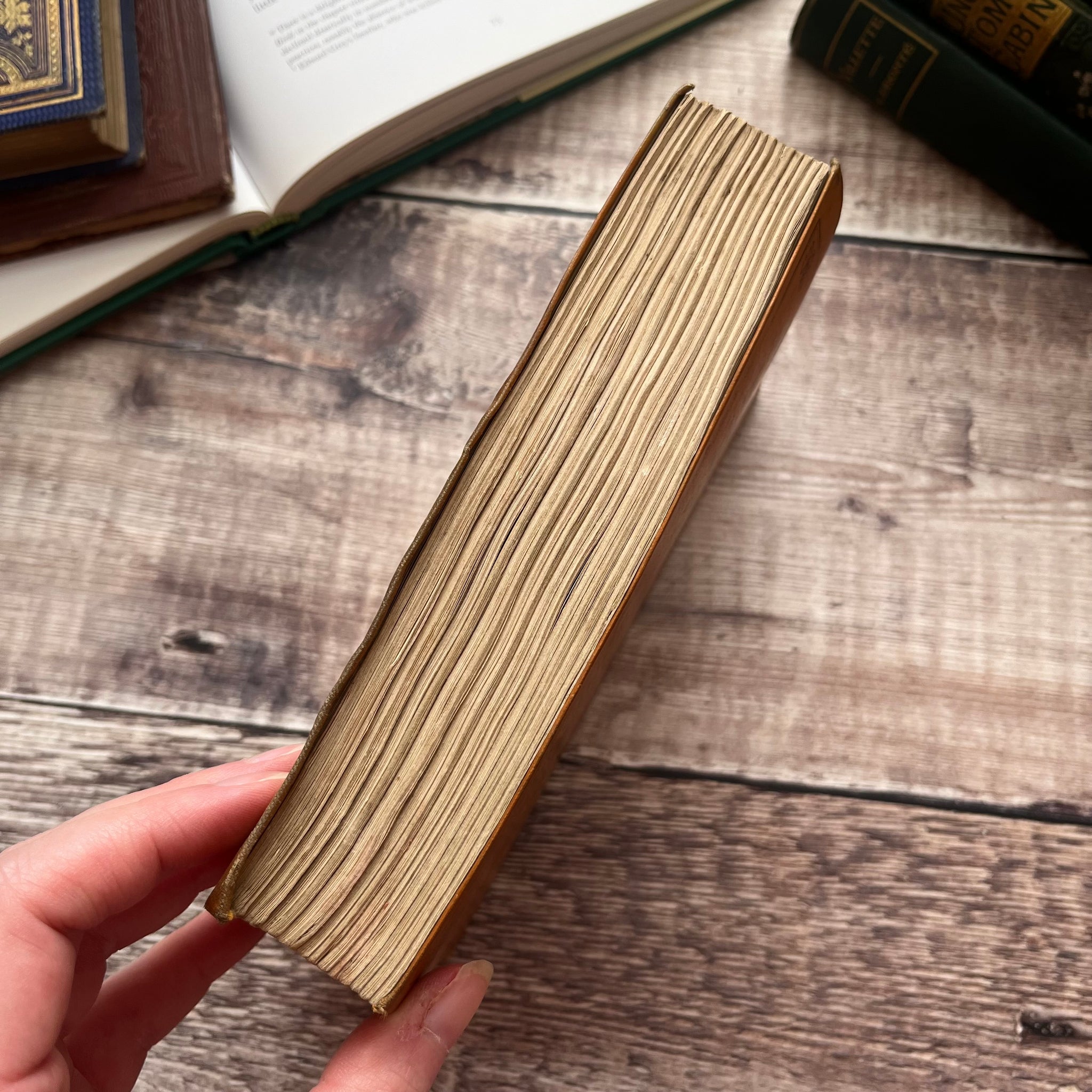 The book is in good reading order but as one can see from the photos, there is more wear to the outside. The black lettering and detail is almost completely rubbed away from the front board. There is soiling and marking to the cloth, with air bubbling to the cloth covering the front board and and bleached marking to the back board. The boards and text block are slightly warped, and the corners show light wear and crushing. The spine is very discoloured and darkened, with crushing to the spine ends which has caused minor splitting in the cloth. There is also some rubbing to the black lettering on the spine.