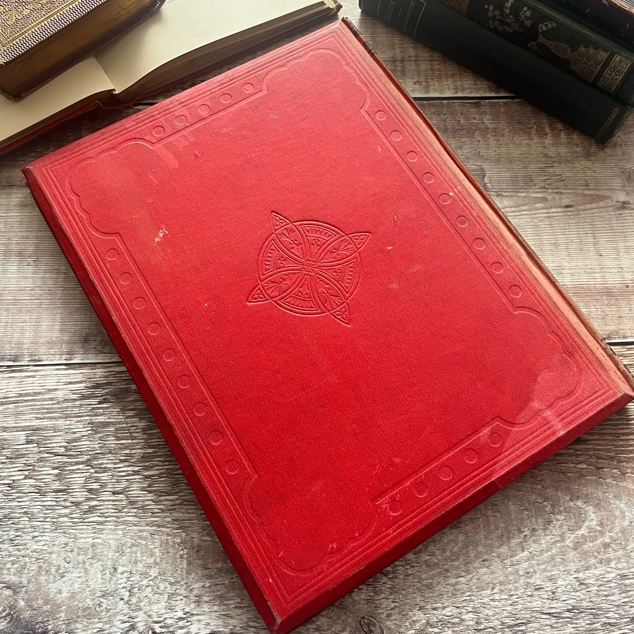 The book is bound in red cloth with ornate blind stamped decoration and gold gilt to the front board. It's a really beautiful book, despite it's wear, but I have priced it accordingly.