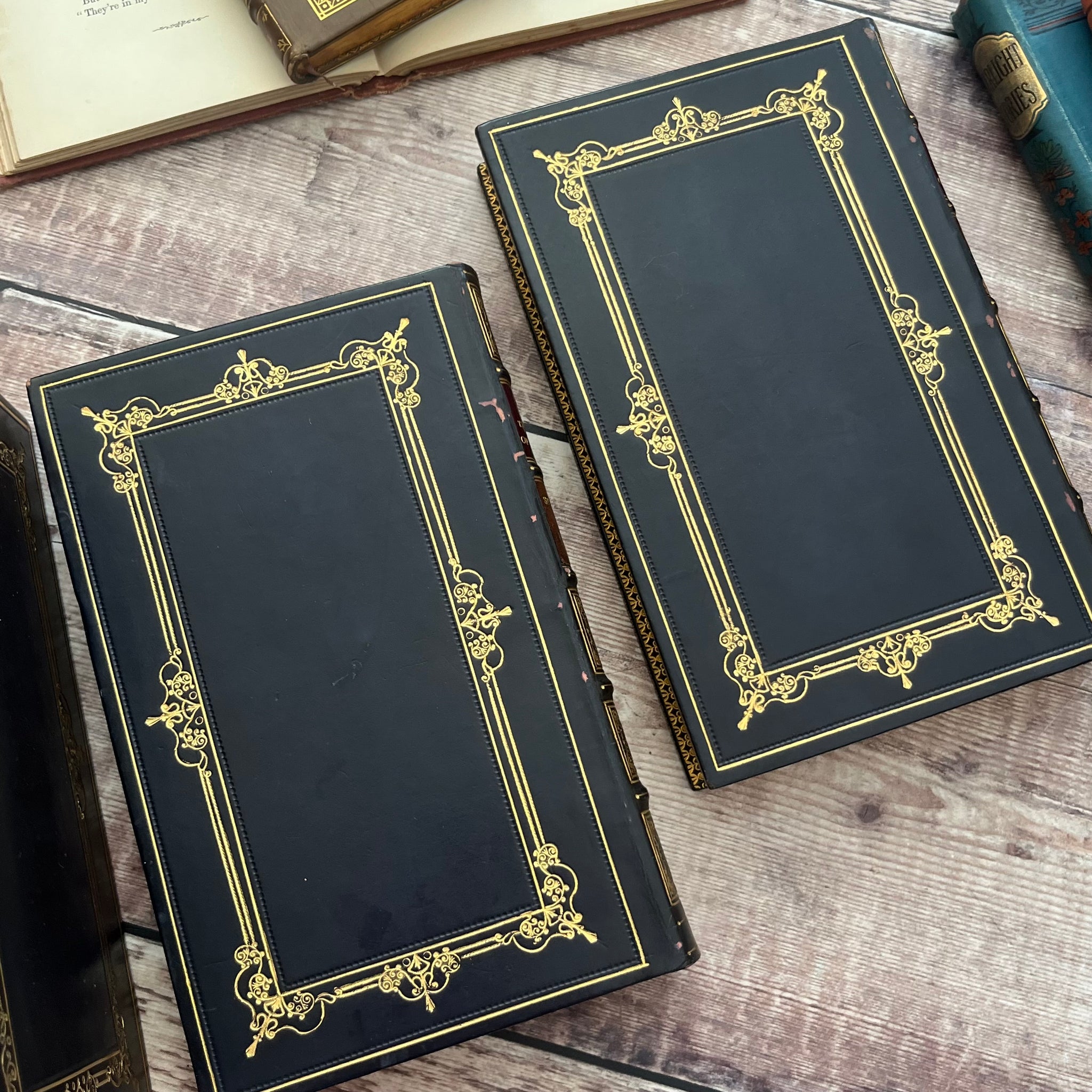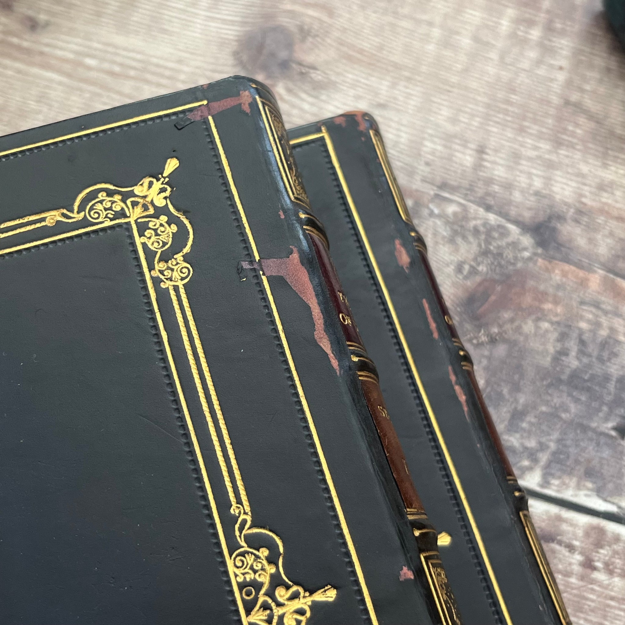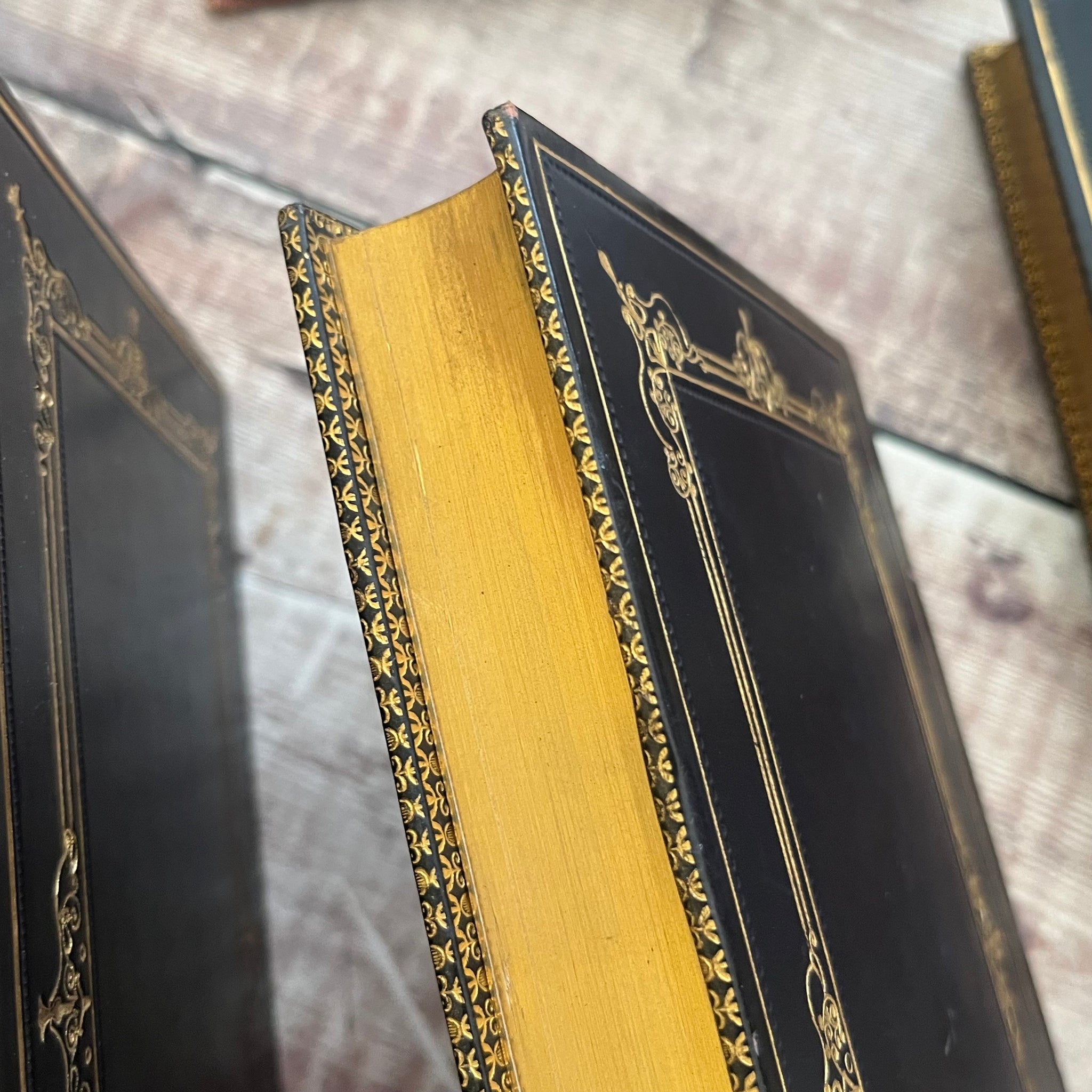 The books are in very good condition and have obviously been well looked after. Sadly there are two which are missing a large part of their leather labels. The boards show scuffing, with occasional chips and peeling to the leather.