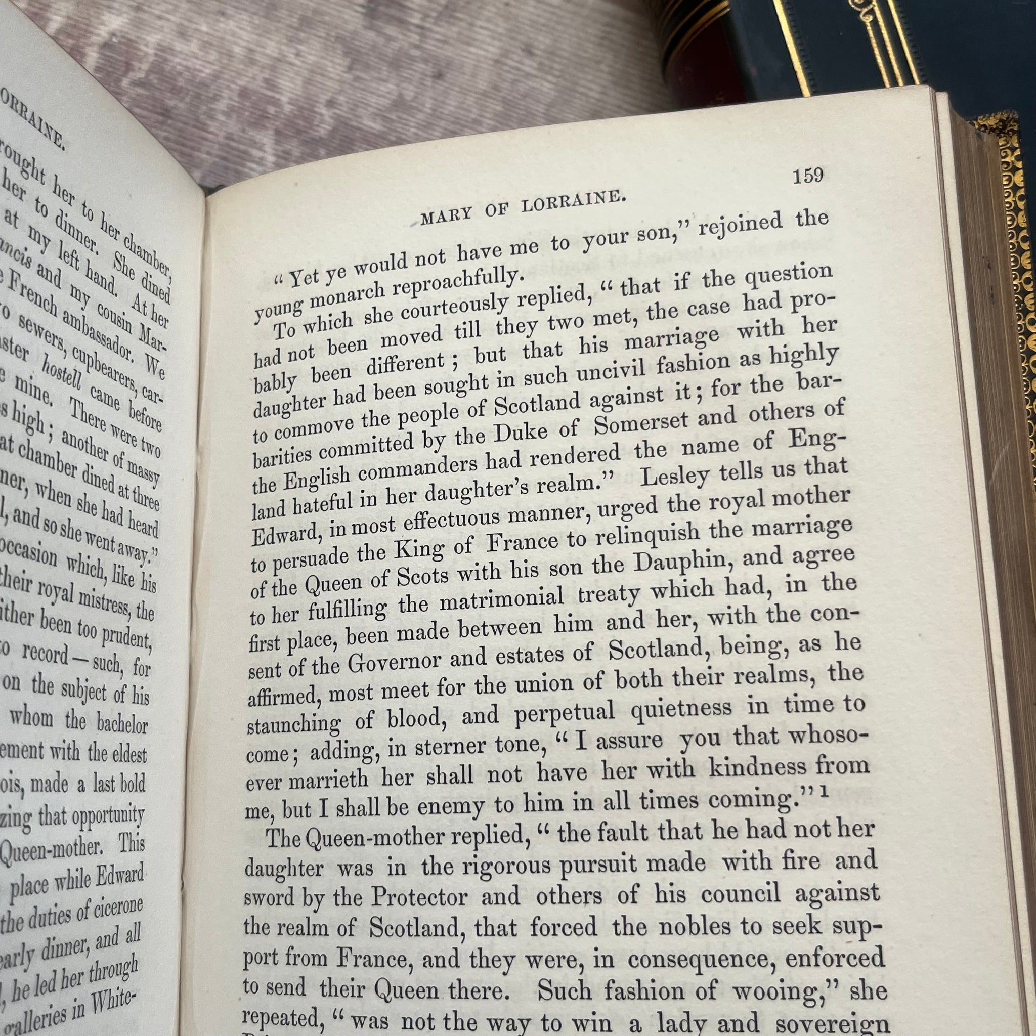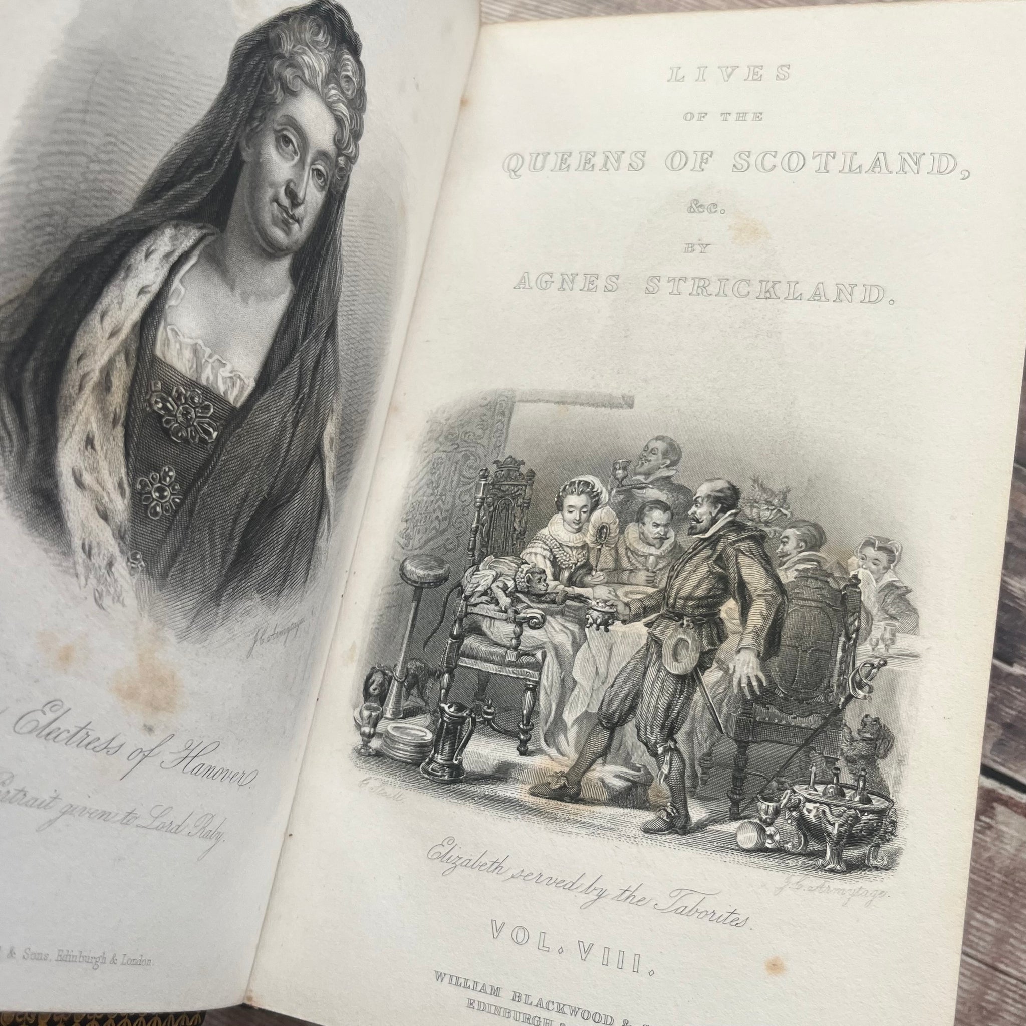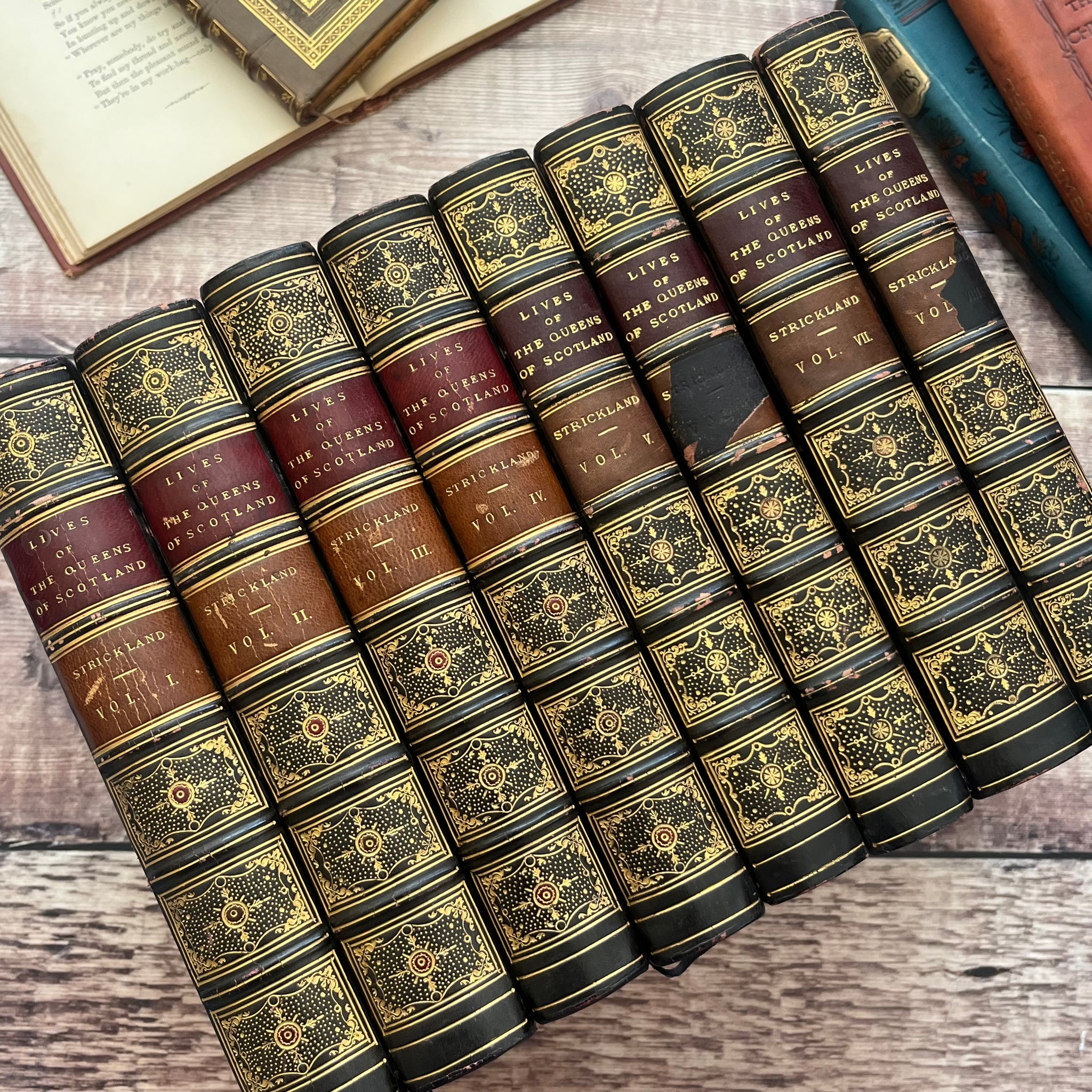This beautiful collection of the Lives of The Queens of Scotland and English Princesses was published by William Blackwood and Sons in the 1850's. The books are finely bound in full calf leather, with gilt decoration to the boards and all edges gilt. There are gilt inner dentelles and the spines feature five raised bands and gilt tooling.