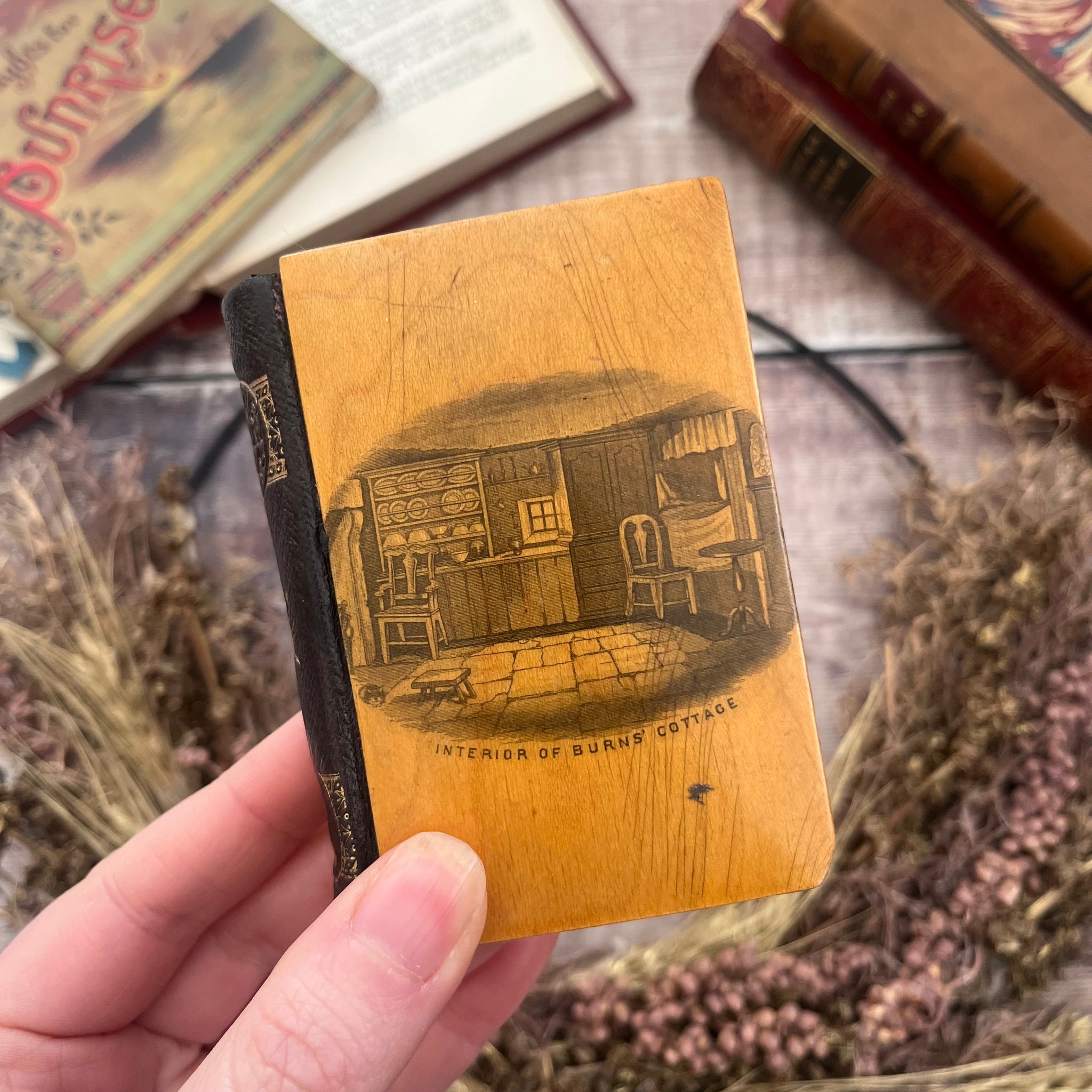 The book features a dark leather spine with gilt lettering and decoration. The boards are mauchline ware, and feature the interior of Burns' cottage on the front.