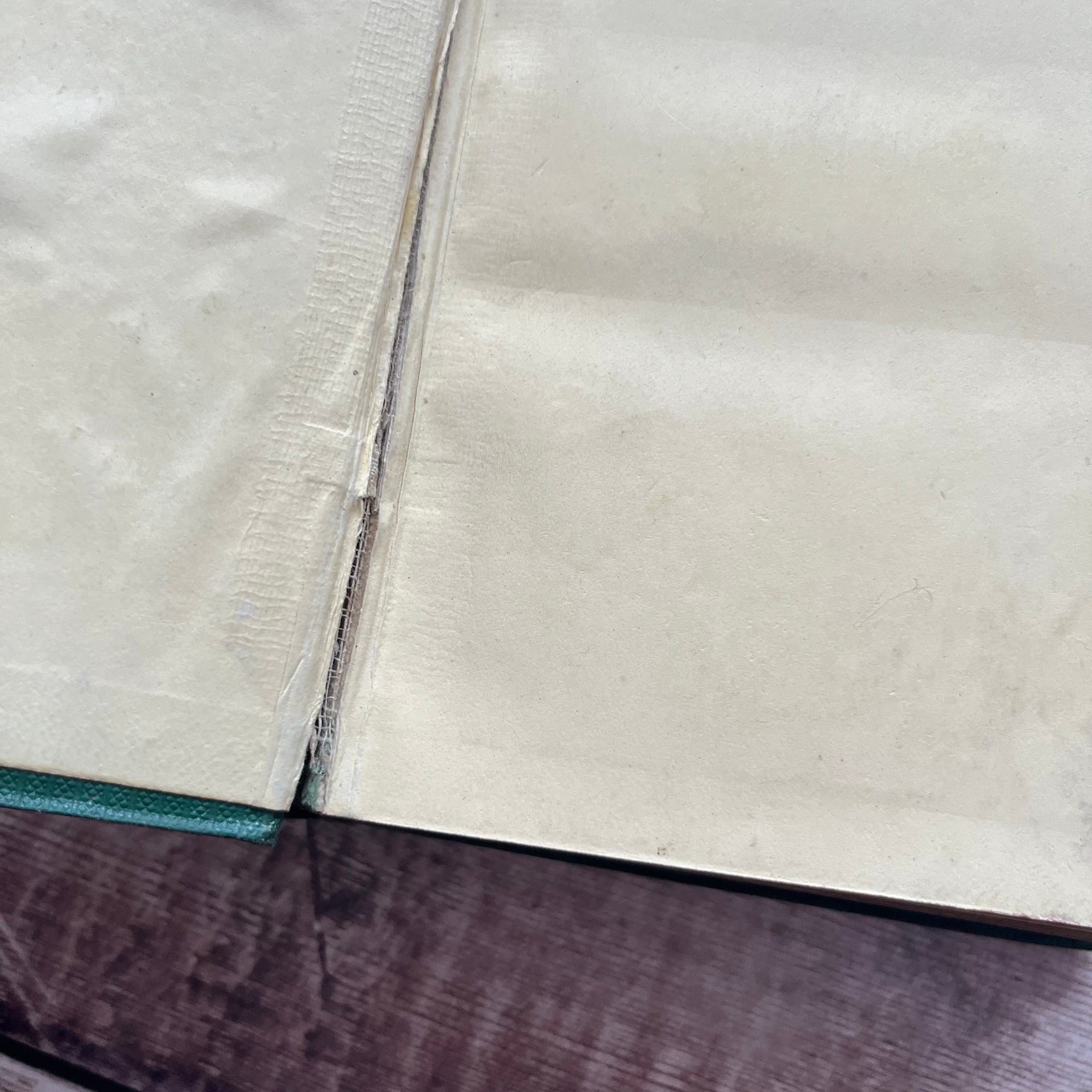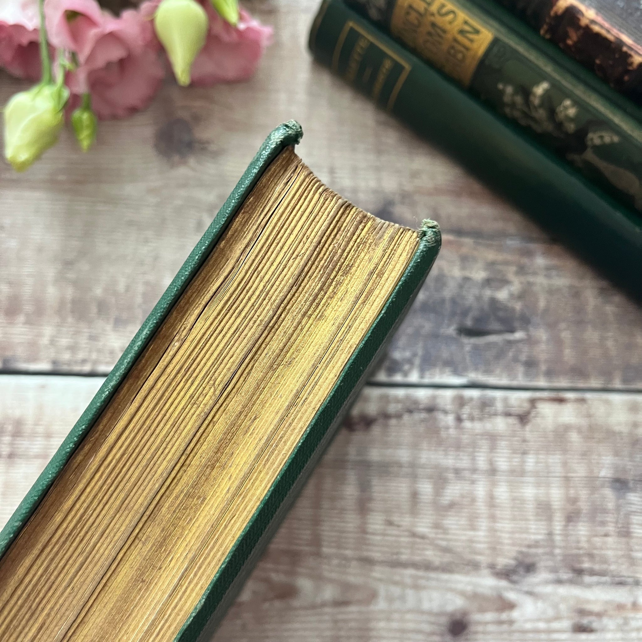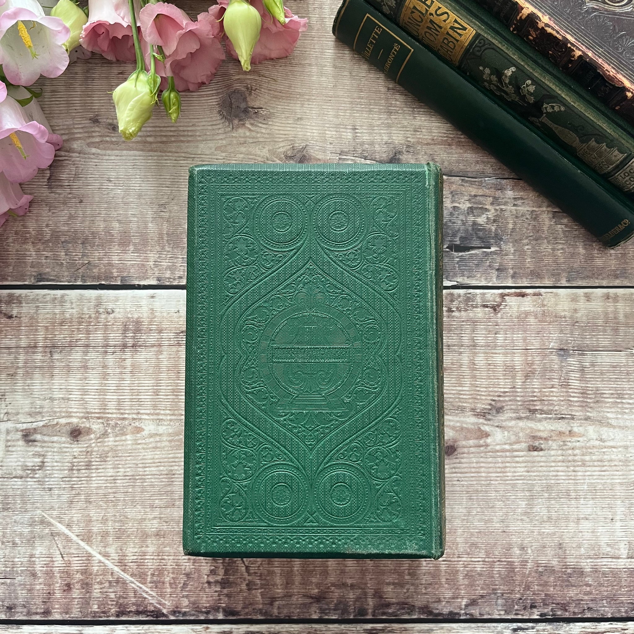 The book is bound in green cloth with elaborate gold gilt decoration blind stamped into the front board and spine. It's a really stunning example of the beauty of Victorian bookbinding. It's in remarkably good condition but there is some wear to the corners and the book shows a forward lean. There is light rubbing and marking to the boards, and the spine shows some rubbing. There is crushing to the spine ends.