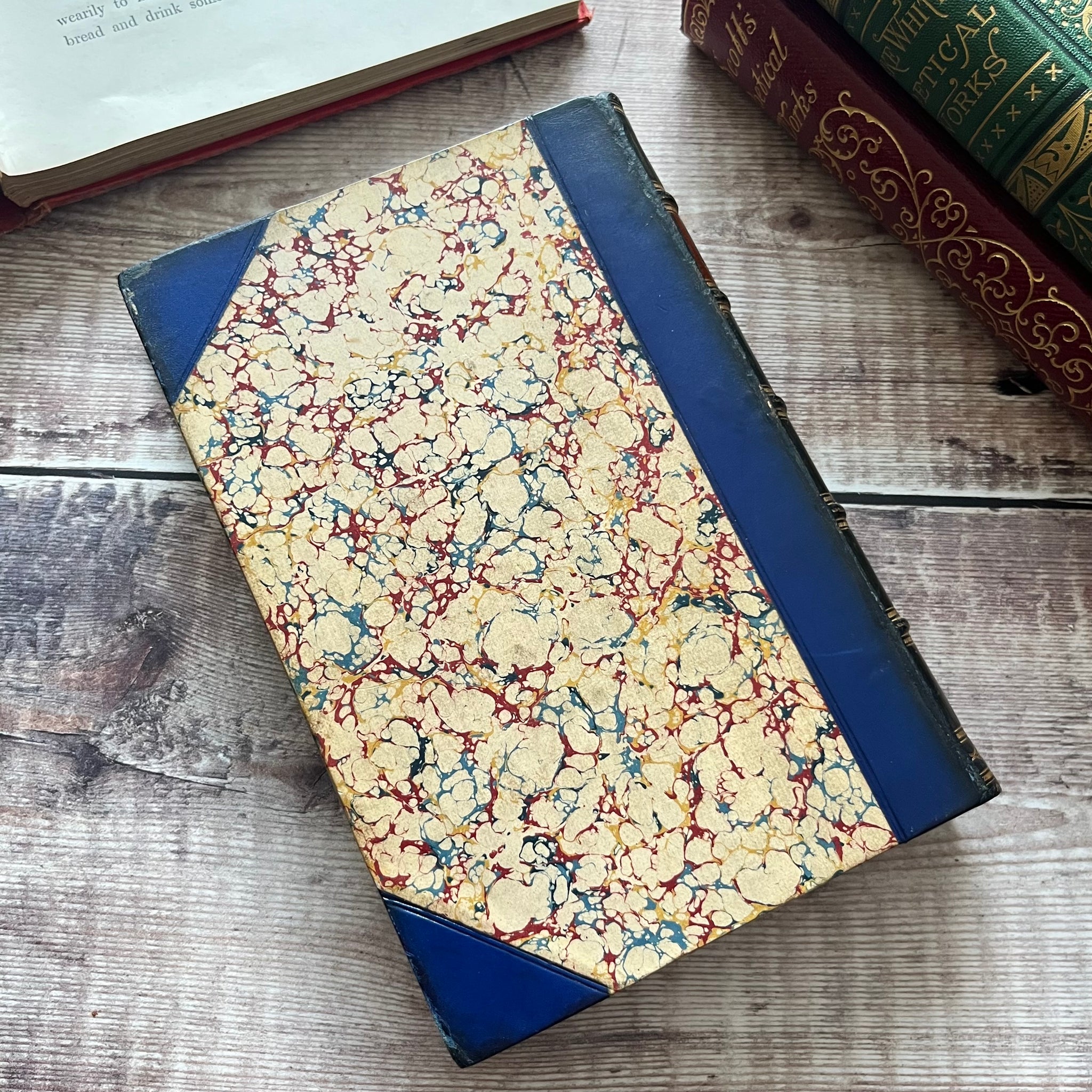 It is half bound in half calf leather with marbled paper boards, and the text block edges are marbled to match. It's in very good condition considering it's 150 years old. There is very light sunning to the spine with some minor chips to the leather. The corners are lightly worn with some minor loss to the surface of the leather, and the boards are lightly scuffed.