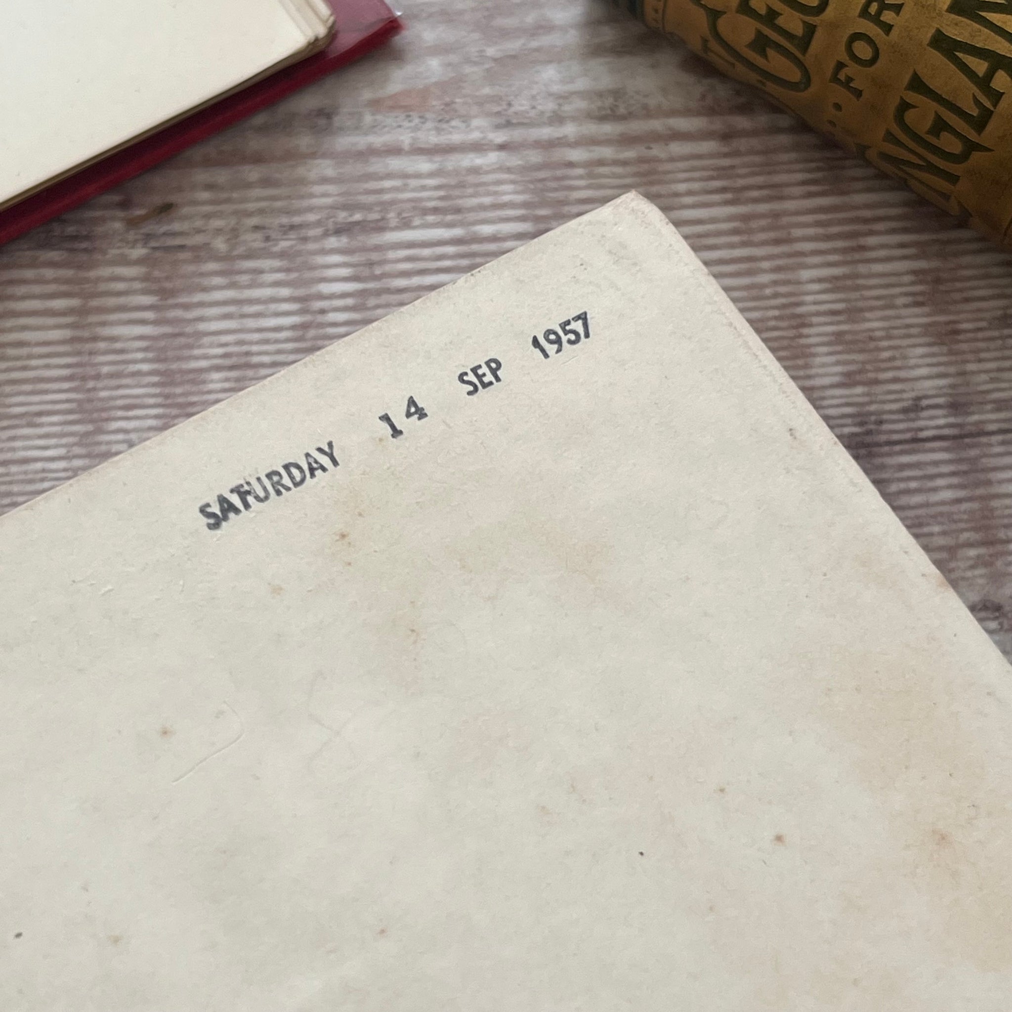 Inside, there is a date stamped on both the front pastedown and the FFEP. The pages are clean and bright with sporadic foxing. Some of the rough cut page edges are a little rougher than others.