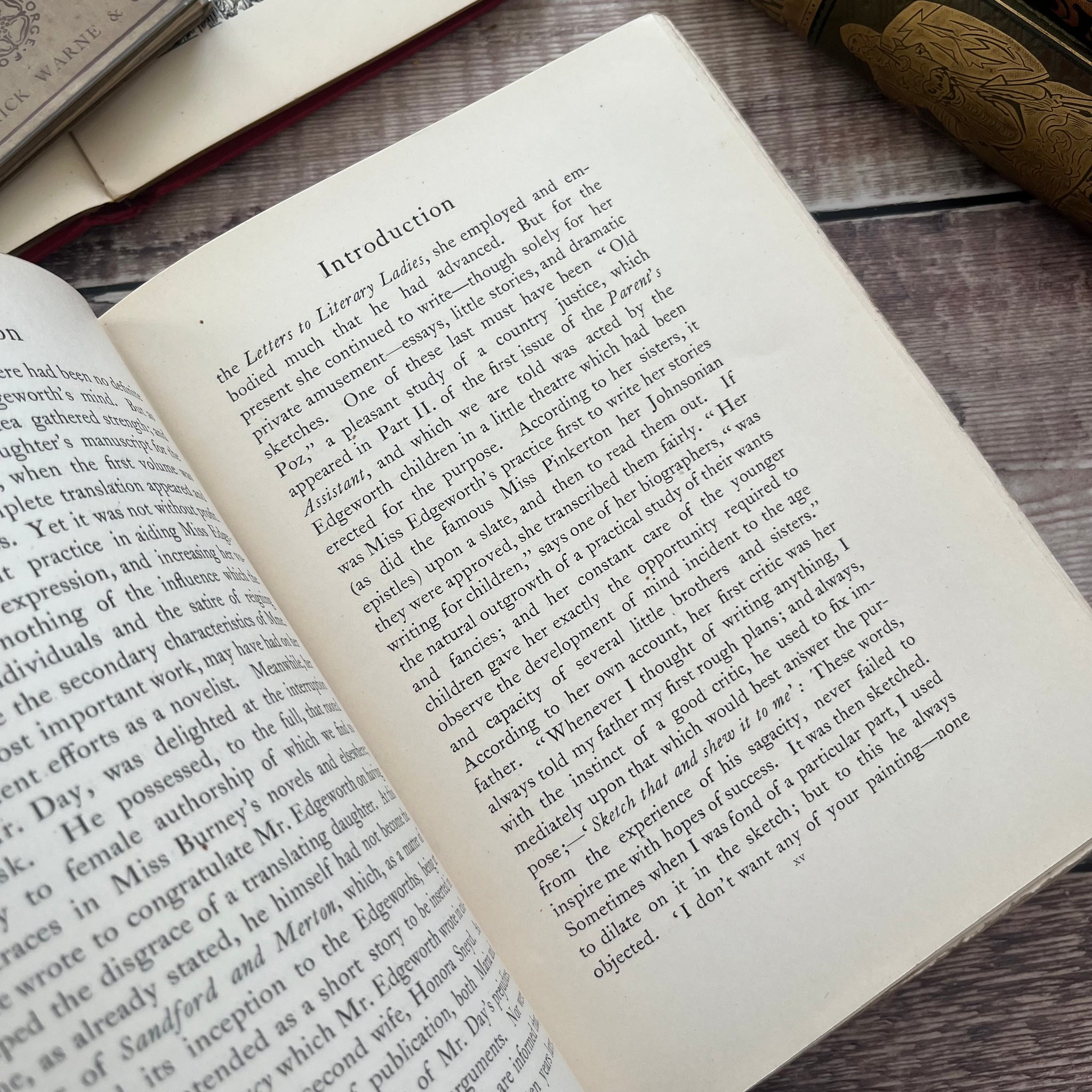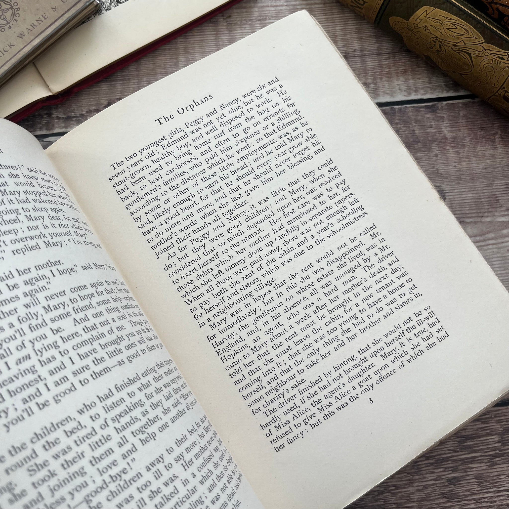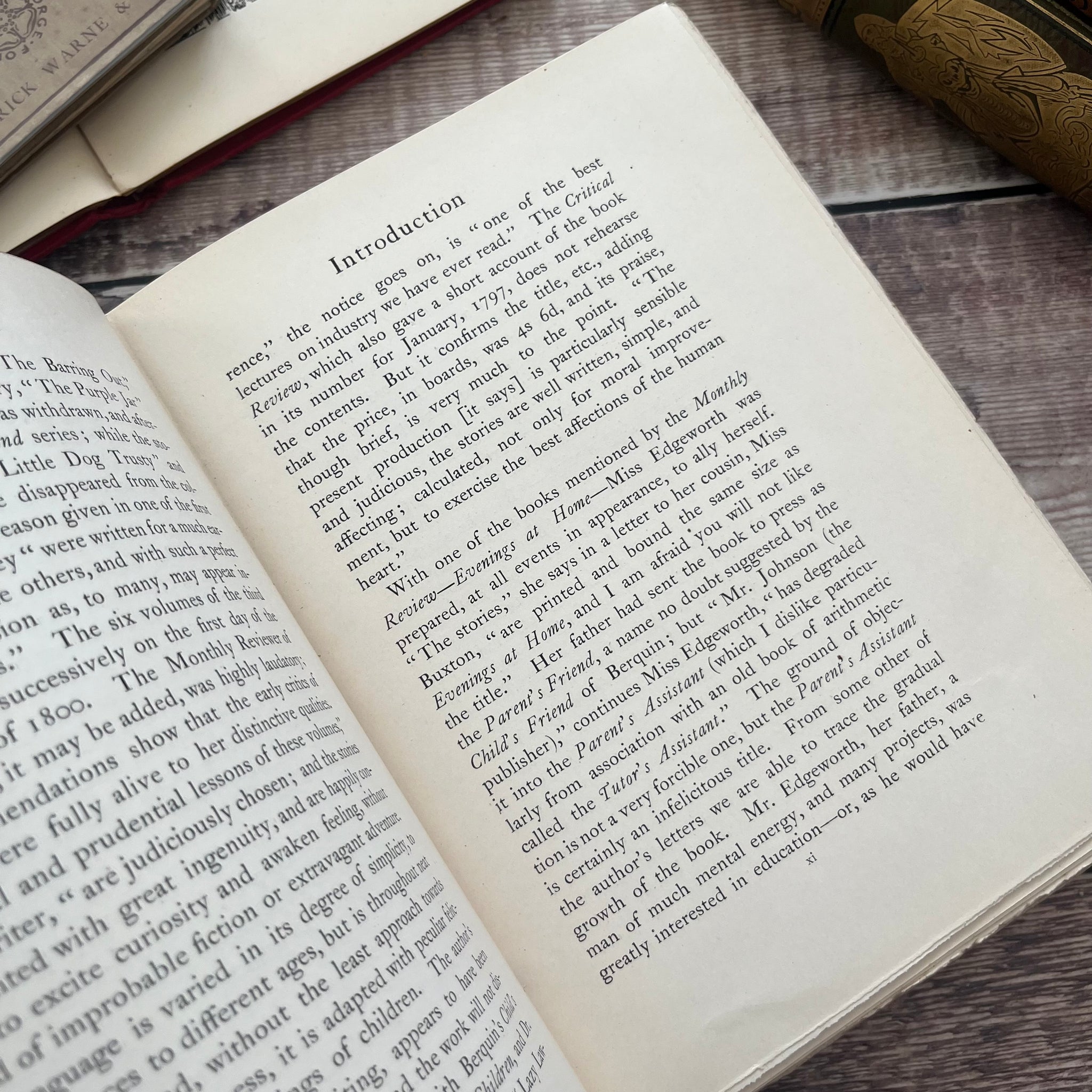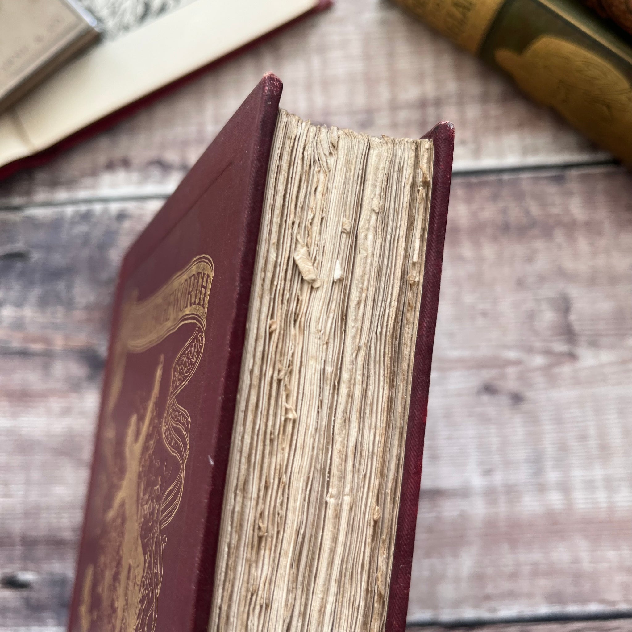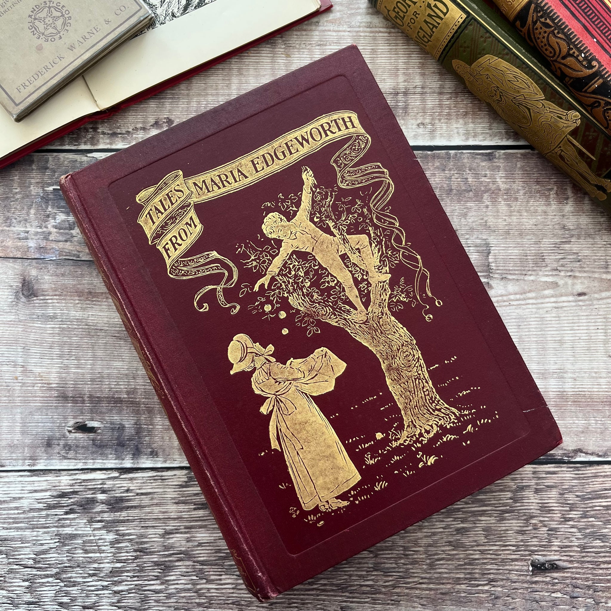 This beautiful edition of Tales from Maria Edgeworth was published by Wells Gardner Darton and Co in 1903. The book is bound in burgundy cloth with stunning gilt decoration to the front board and spine. It's in good plus condition with the most noticeable flaw being the damp damage to the edge of the back board. There is wear to the corners and the book shows a slight forward lean. There are minor marks to the boards and very slight air bubbling to the cloth in places. The spine is faintly sunned.