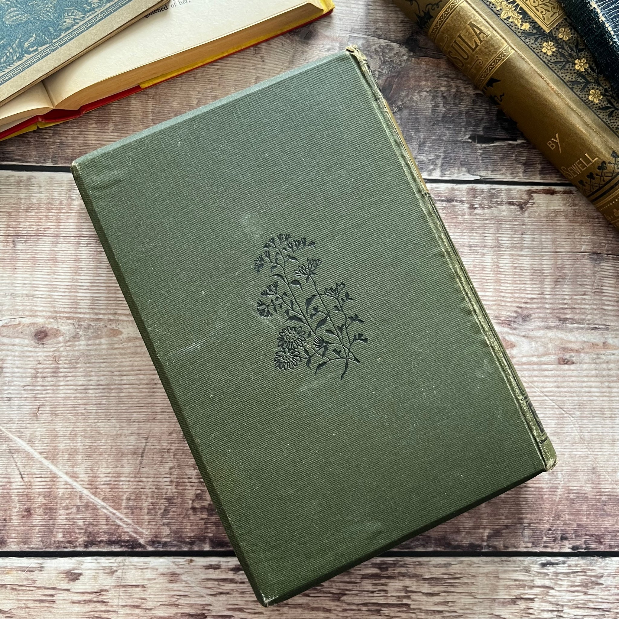 The book is bound in green cloth over bevelled boards, with blind stamped decoration in black and gilt to the front board and spine, and floral work to the back board. It's in good condition but has undergone some restoration work - the text block has been resewn as it was very loose. This means the book can be read and enjoyed for many years to come and the pages are securely bound. Some of the page segments stick out a little front the edge of the text block though. There is wear to the corners and board edges, and the boards show minor marks and air bubbling to the cloth. There is some rubbing to the gilt and the spine is sunned. Crushing to the spine ends has caused some splitting in the cloth.