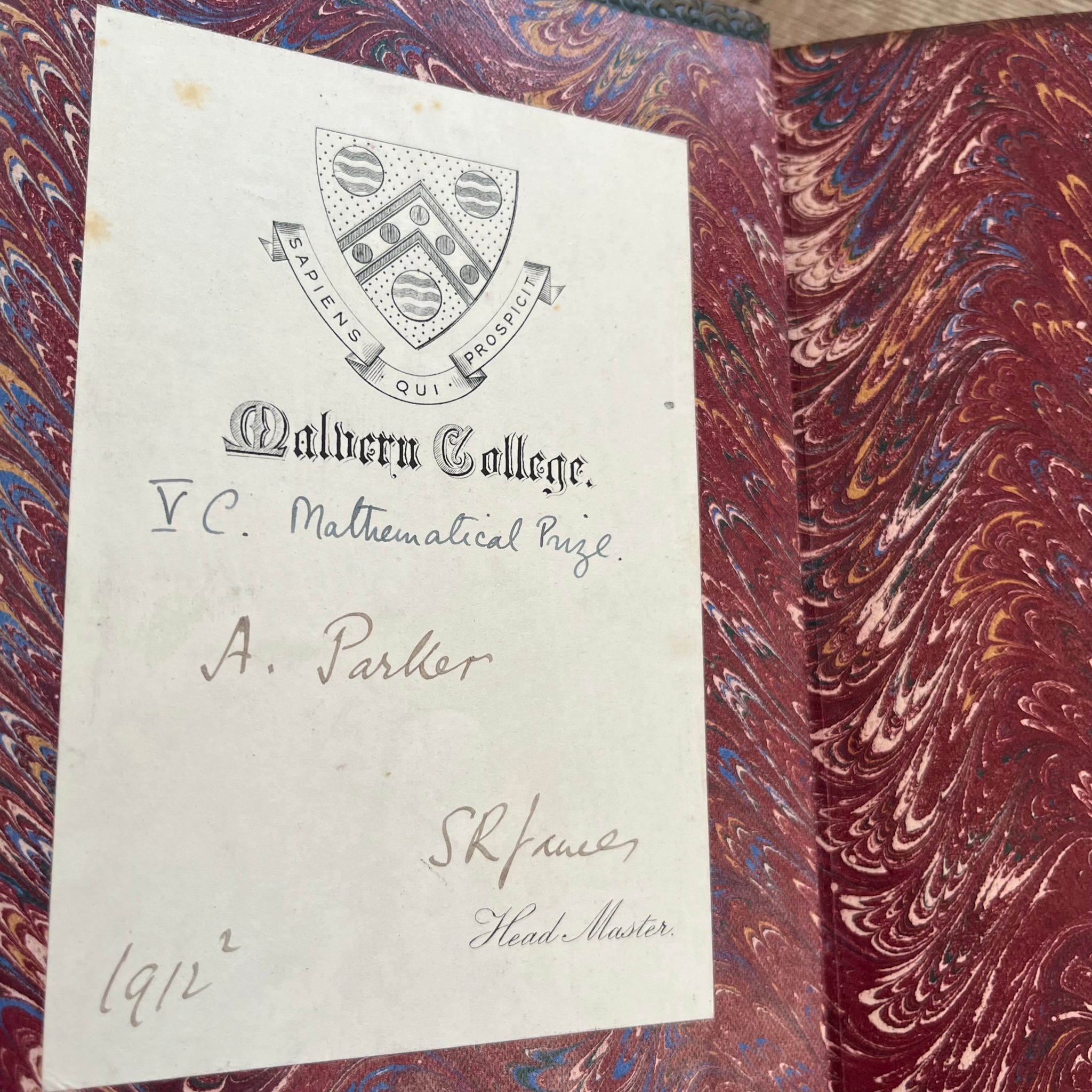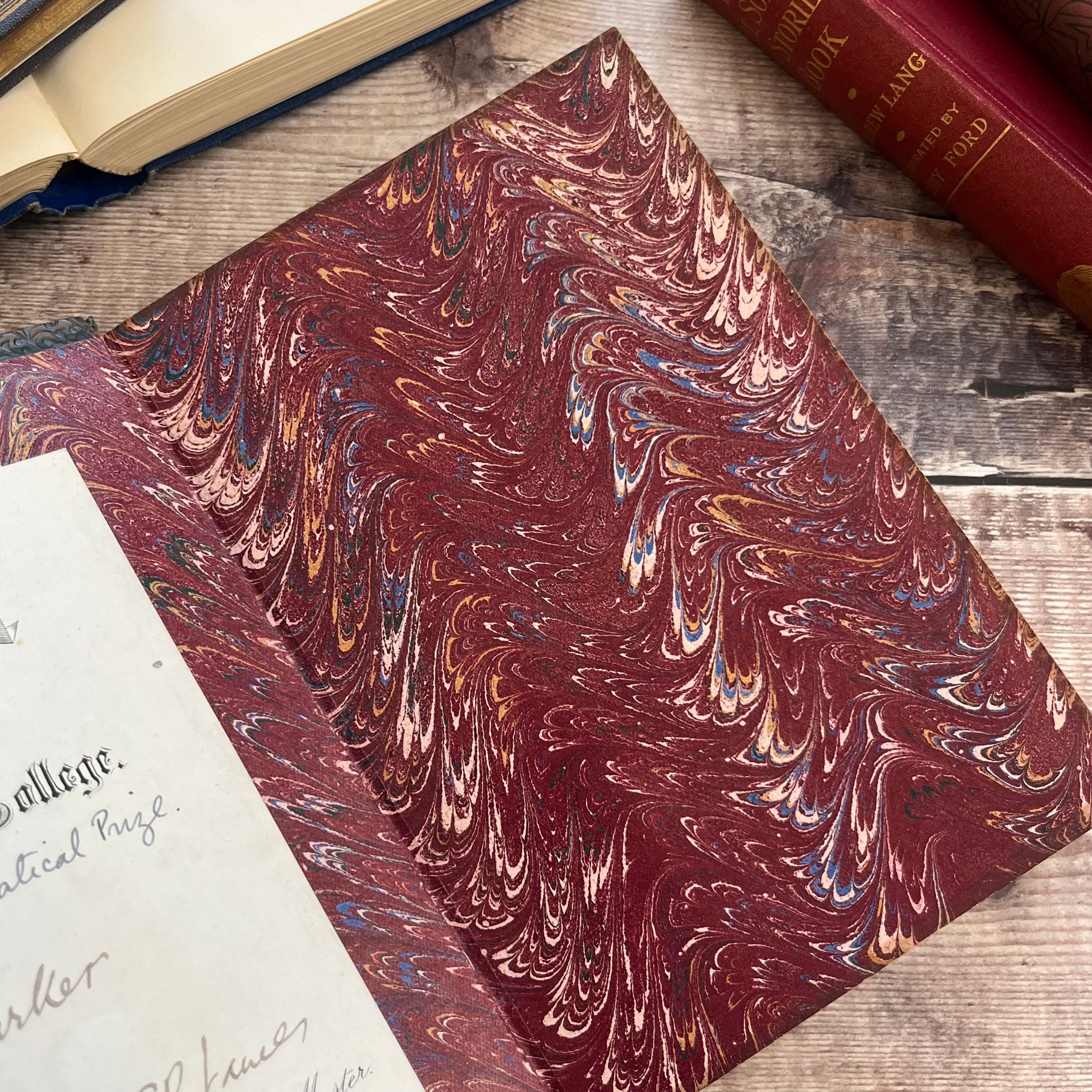 The book is bound in full calf leather with a blind stamped college insignia in gilt to the front board. The spine features five raised bands and beautiful gilt tooling. The text block edges were once marbled but this is very faded and can only be clearly seen to the bottom edge of the text block.