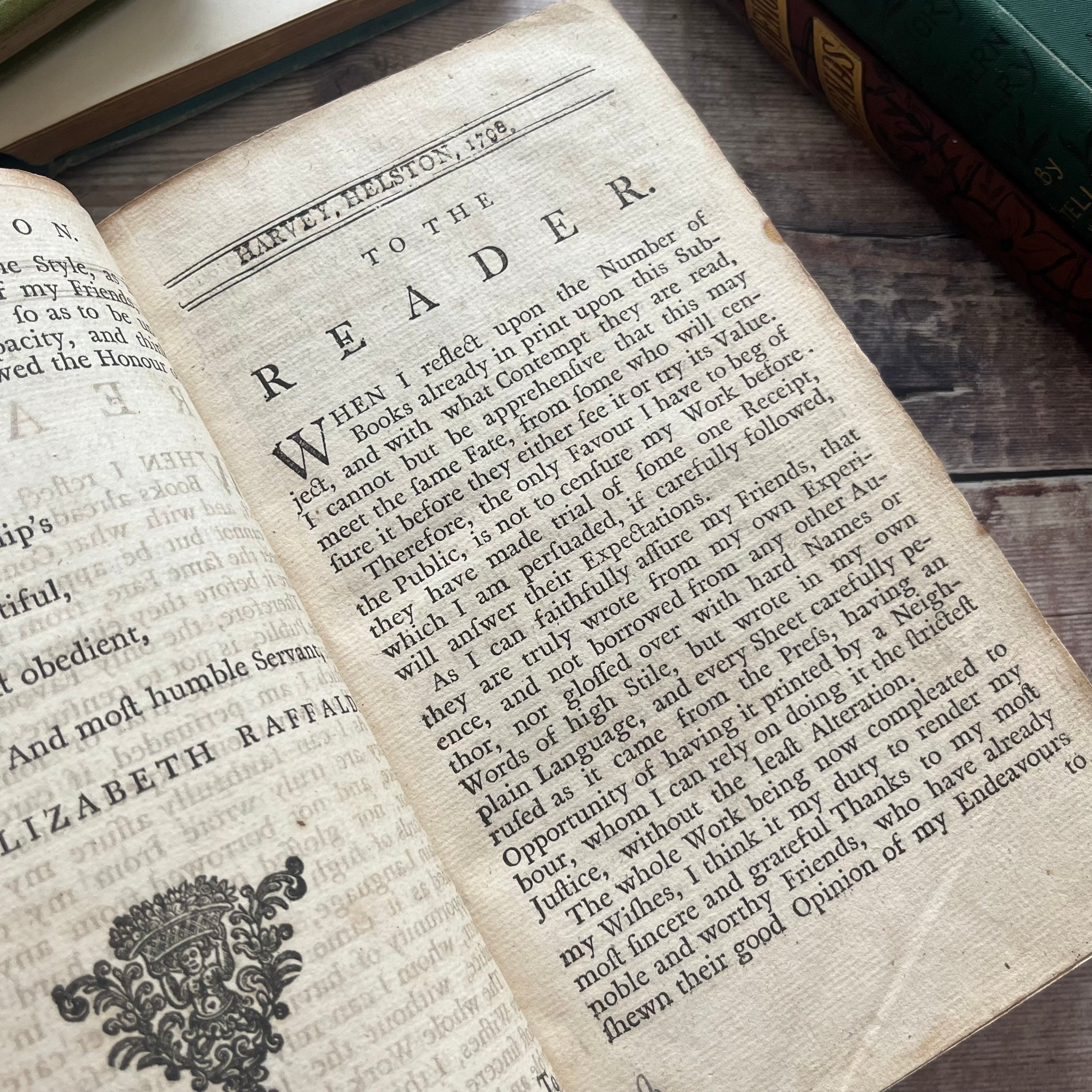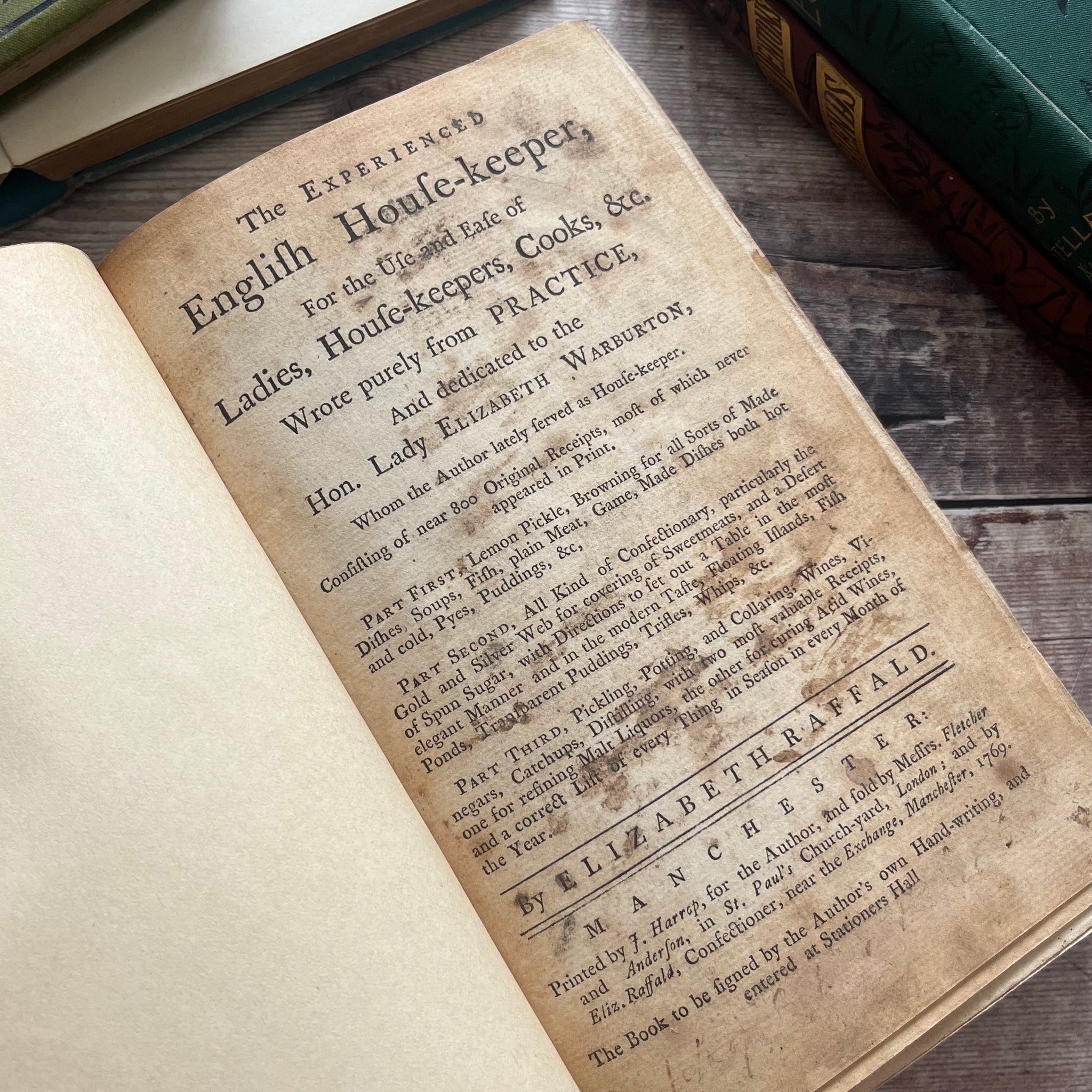 The book was dedicated to Lady Elizabeth Warburton who Raffald worked for for many years. Raffald went into domestic service for fifteen years, working her way up to the position of housekeeper to the Warburton Baronets at Arley Hall, Cheshire. She left her position when she married the Estate's head gardener and the couple moved further North to Lancashire. Raffald was very entrepreunerial and opened a register office to introduce domestic workers to employers. She also ran a cookery school and sold food from the premises. In 1769 she published this very book, which contains the first recipe for a "Bride Cake" that is recognisable as a modern wedding cake.