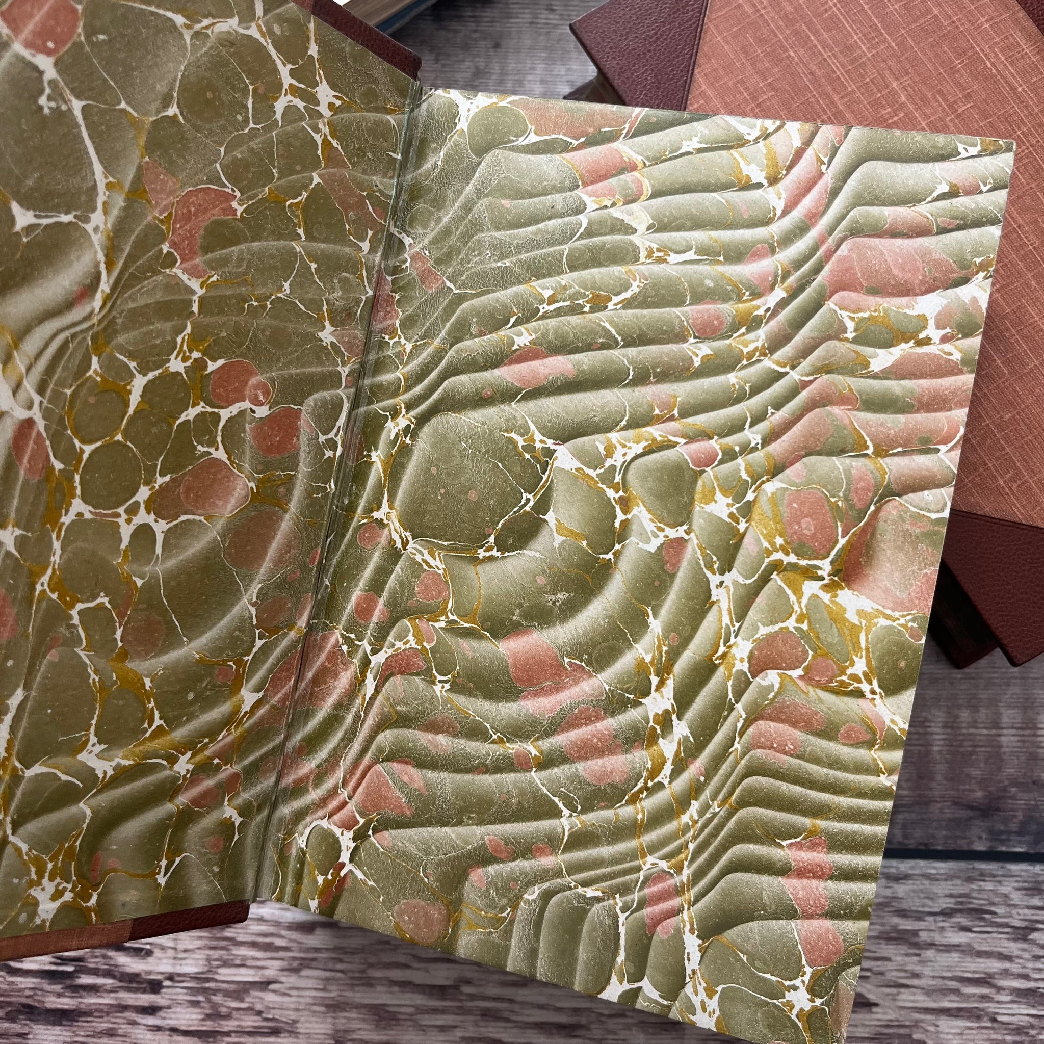 Inside, the endpapers are marbled to match the text block edges and there are no inscriptions. The pages show light age toning and scattered foxing.