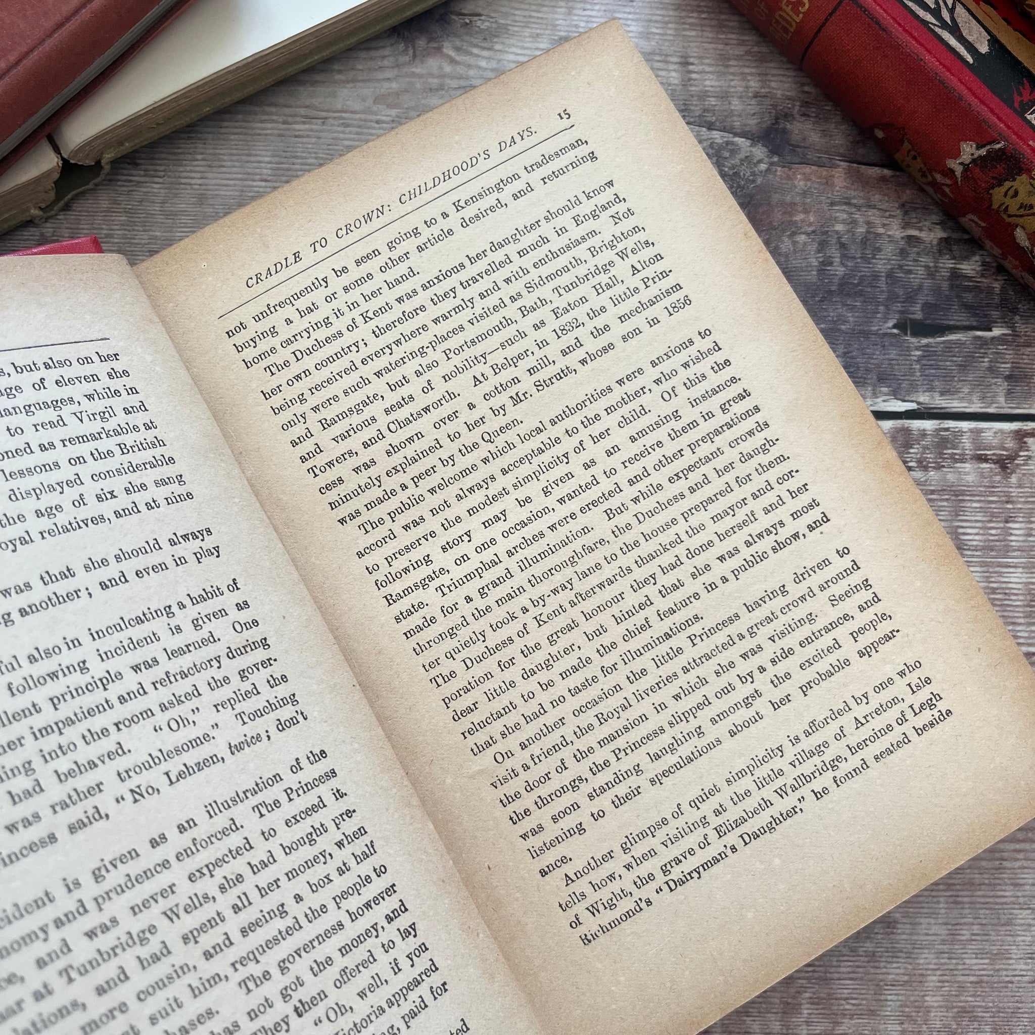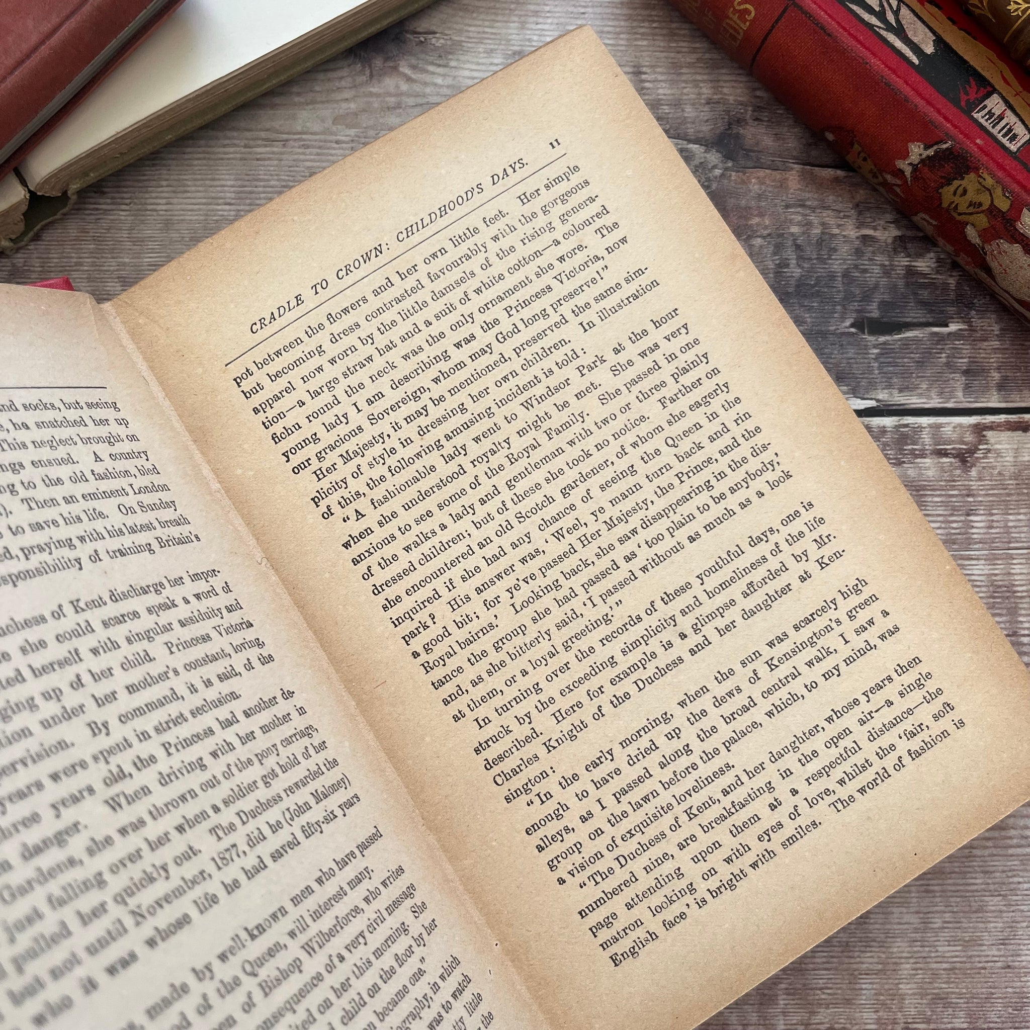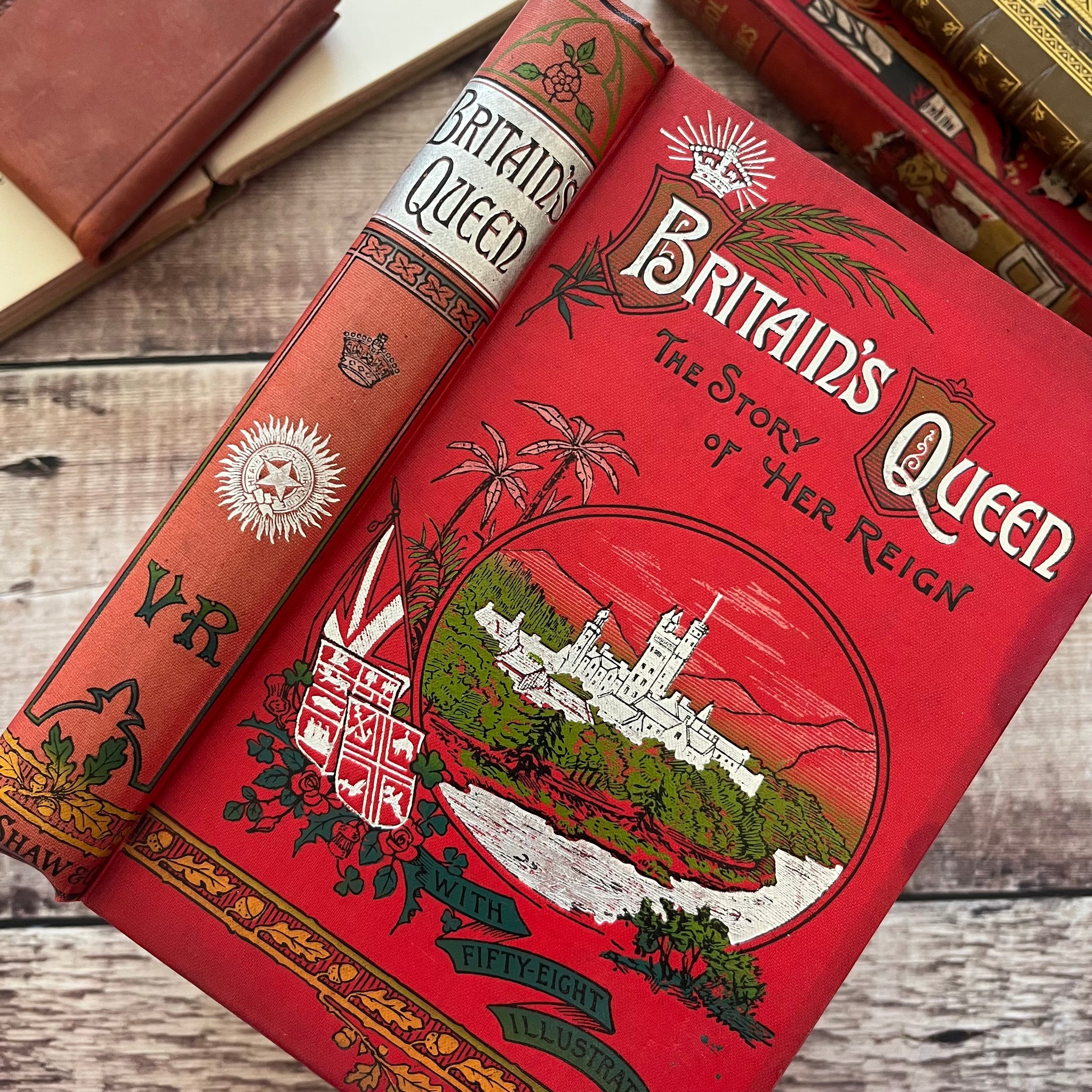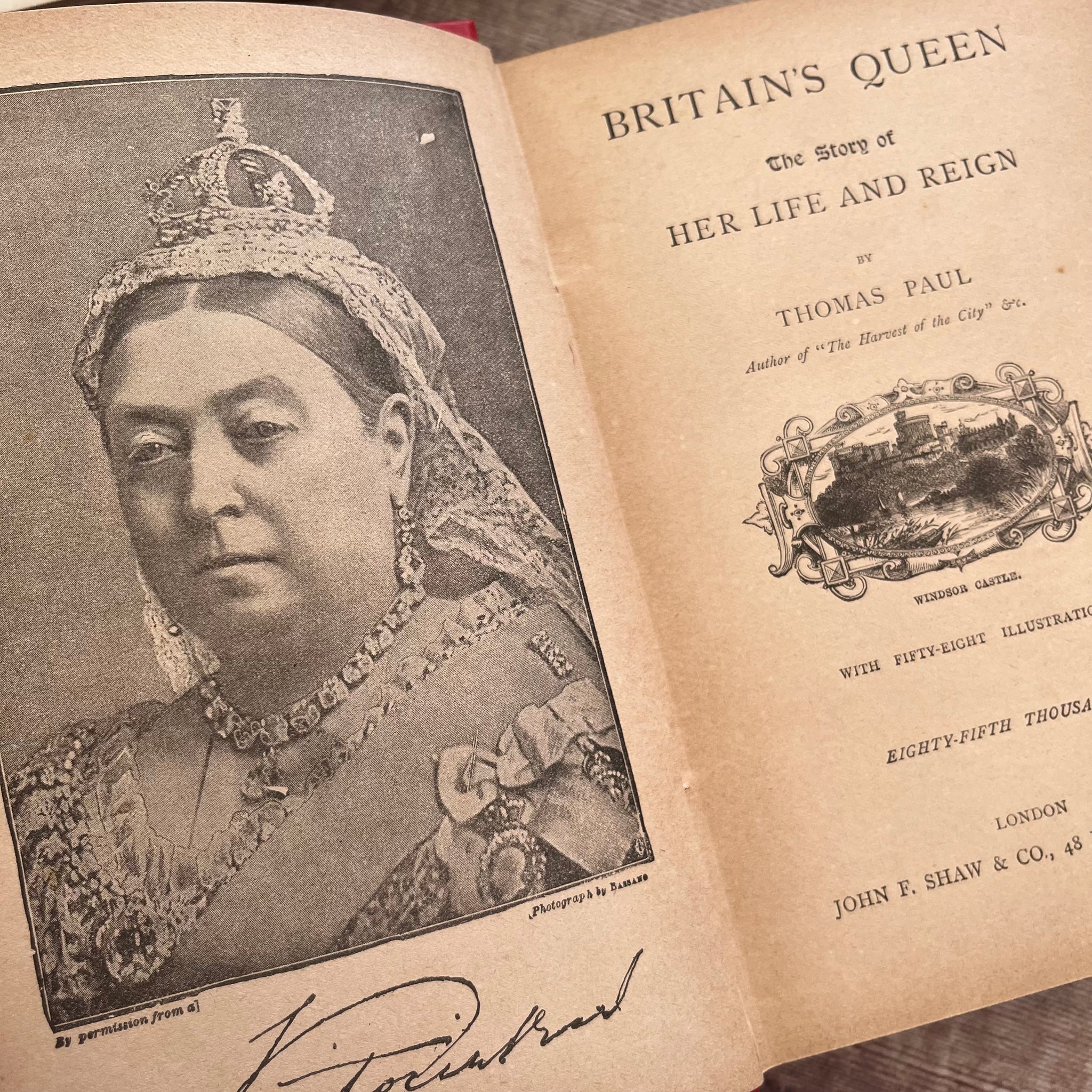 This beautiful vintage edition of Britain's Queen The Story of Her Life and Reign by Thomas Paul was published by John F Shaw and Co. The book is undated but I'd estimate it to be from the end of the Victorian era.