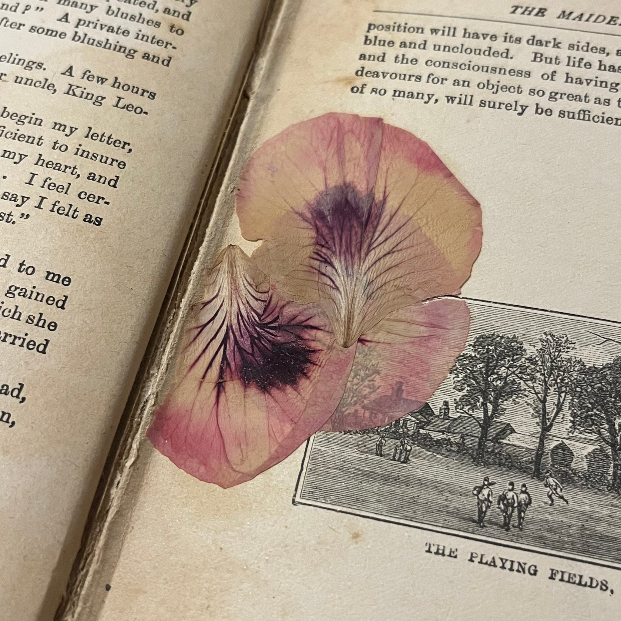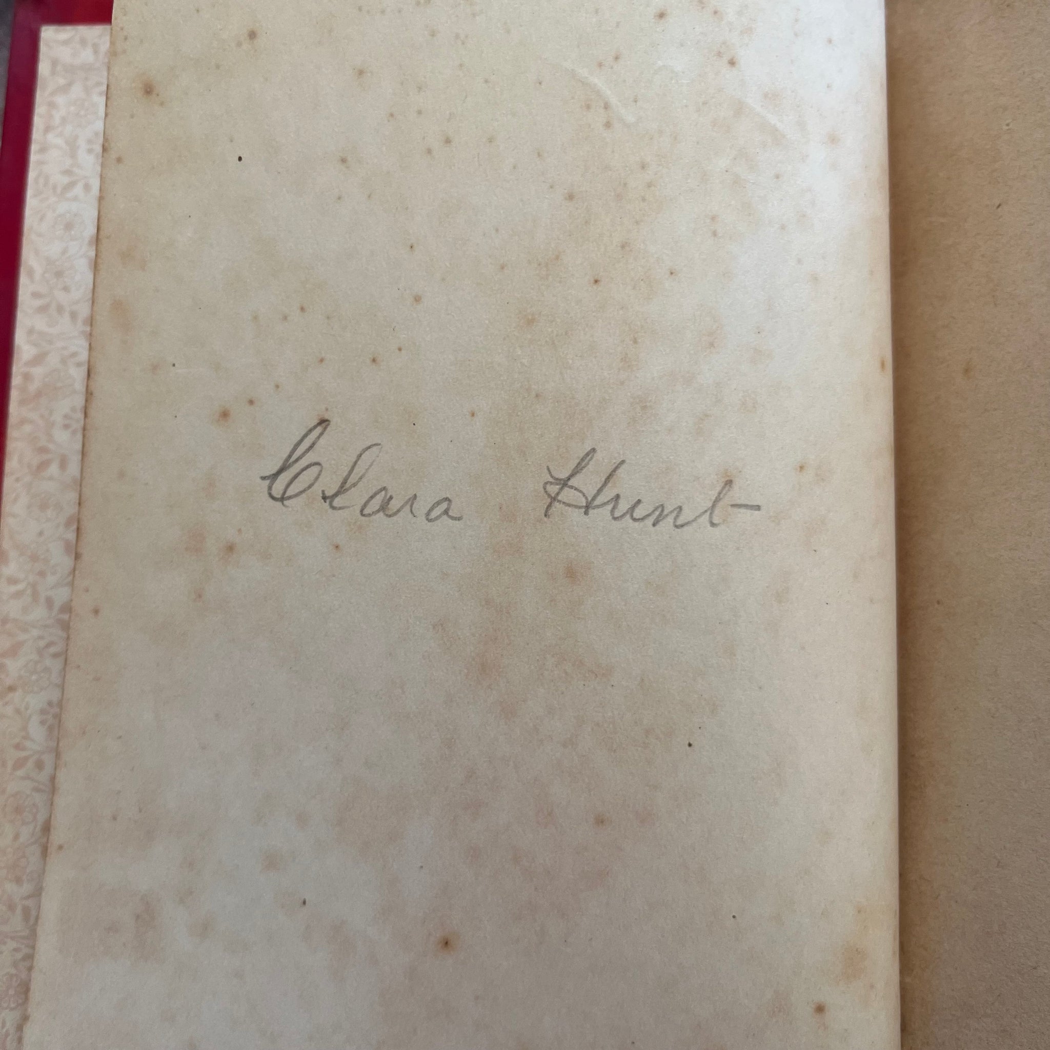 Inside, there is name written in pencil on the verso of the front free endpaper. The pages show significant tanning throughout with sporadic foxing. There is cracking to the gutter in places but no loose pages. There are some pressed flower petals tucked within the pages.