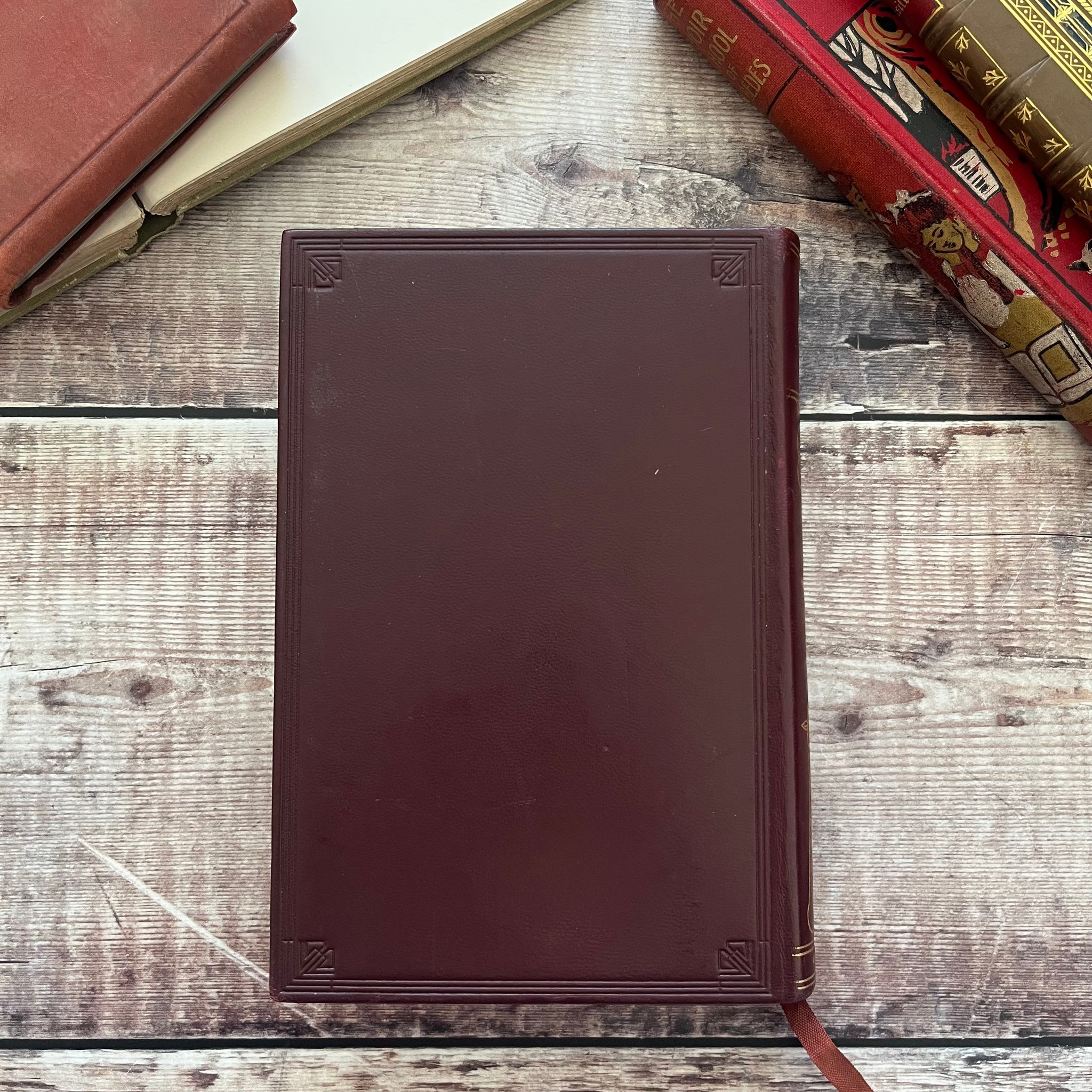 The book is bound in full burgundy leather with beautiful gilt decoration to the spine in an art nouveau spine. There is also a school's coat of arms blind stamped in gilt to the front board. It's in very good condition but there is some scuffing to the leather and very faint sunning to the spine.