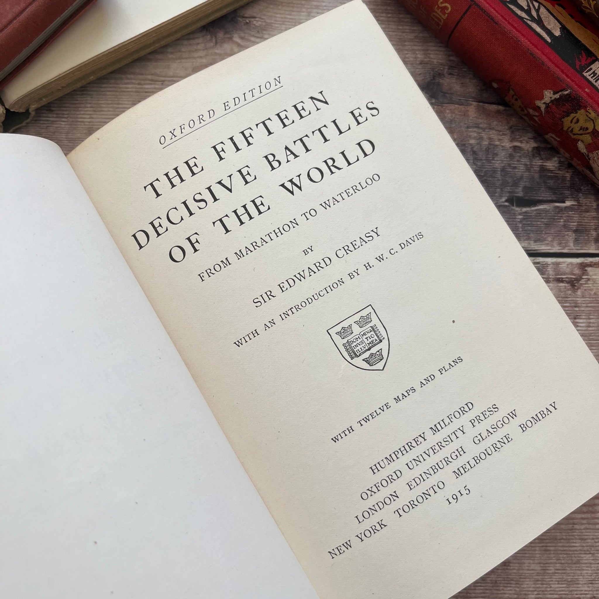 This lovely edition of The Fifteen Decisive Battles of the World by Sir Edward Creasy was published by Humphrey Milford Oxford University Press in 1915.