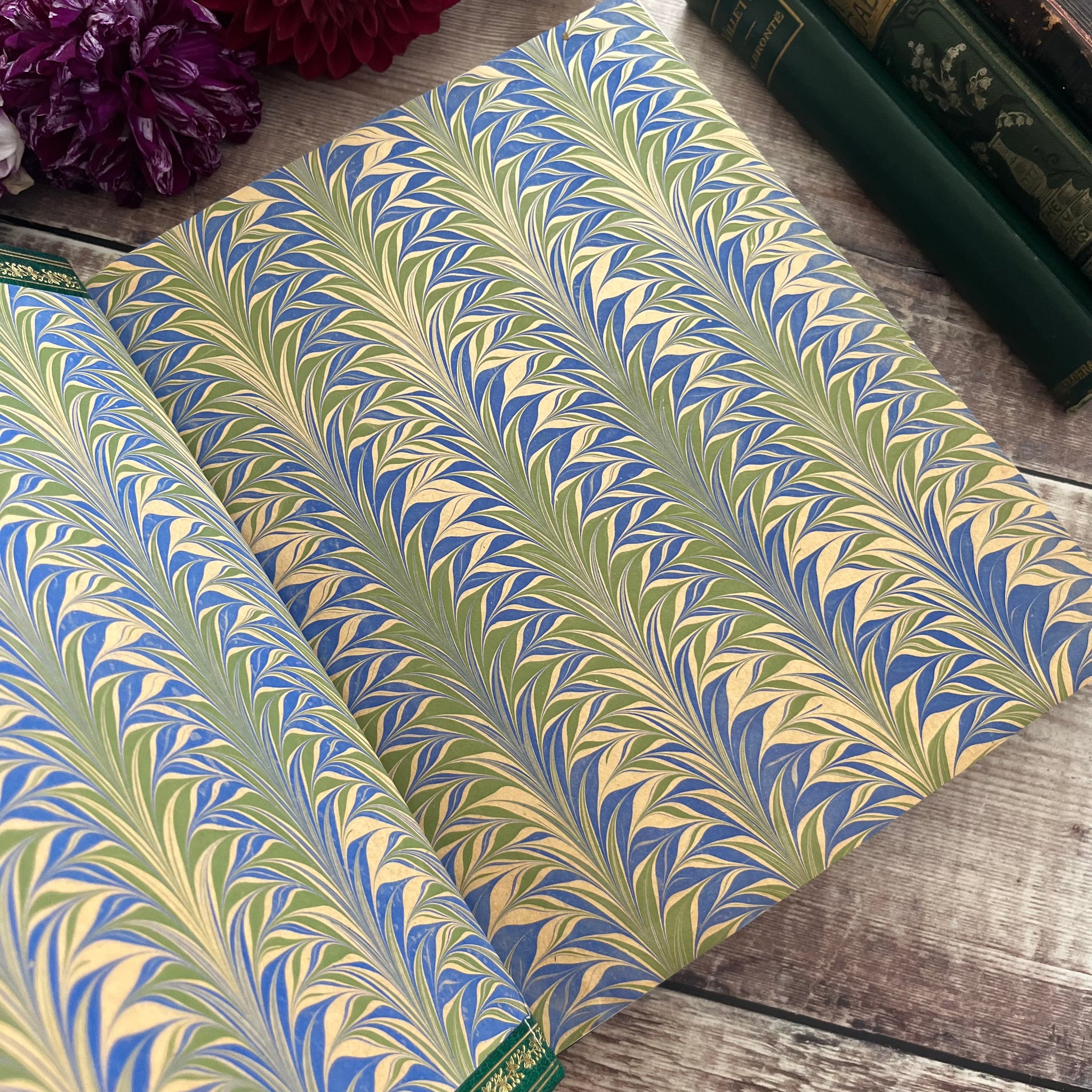 Inside, there are marbled endpapers (part of the custom binding) and the pages are clean and bright. The top edges of the pages stick to each other a little, which is due to the added gold gilt. There is also some rippling to the preliminary pages.